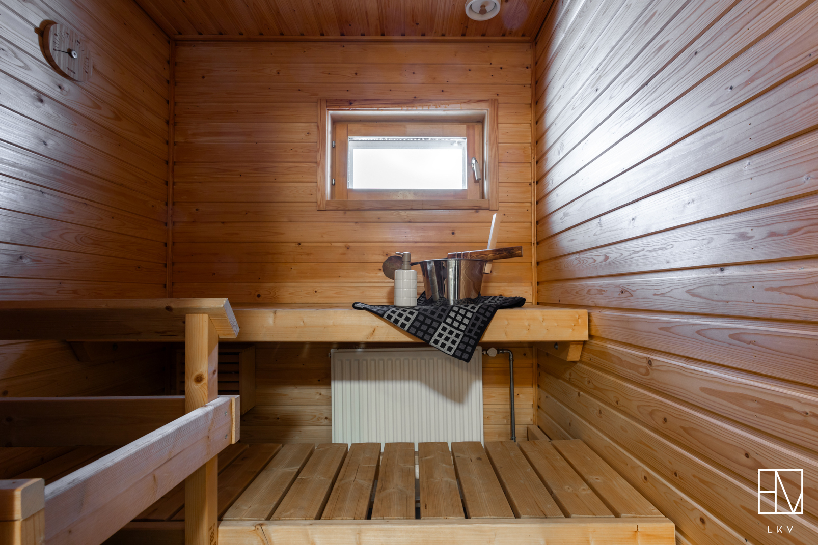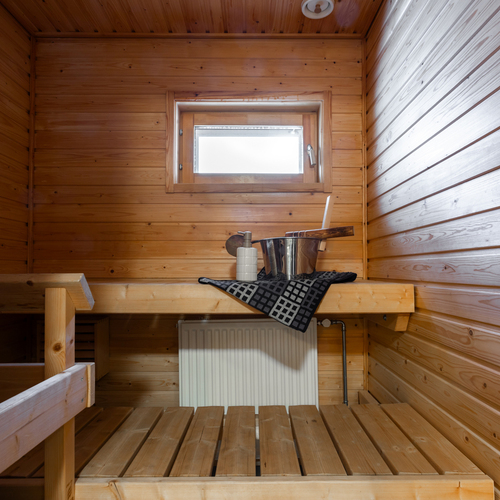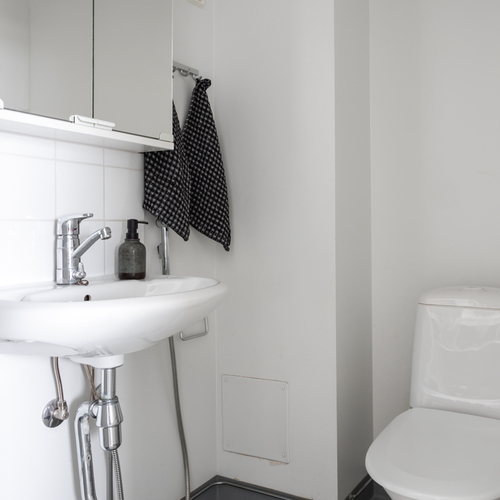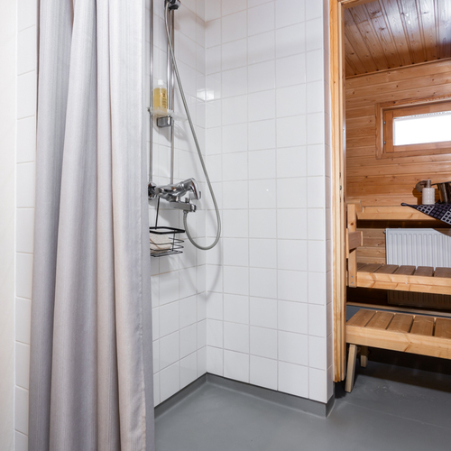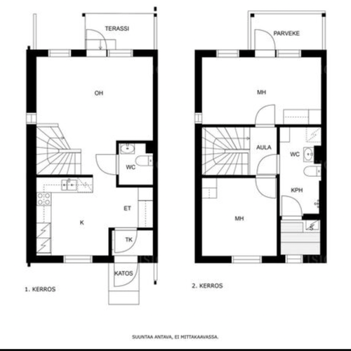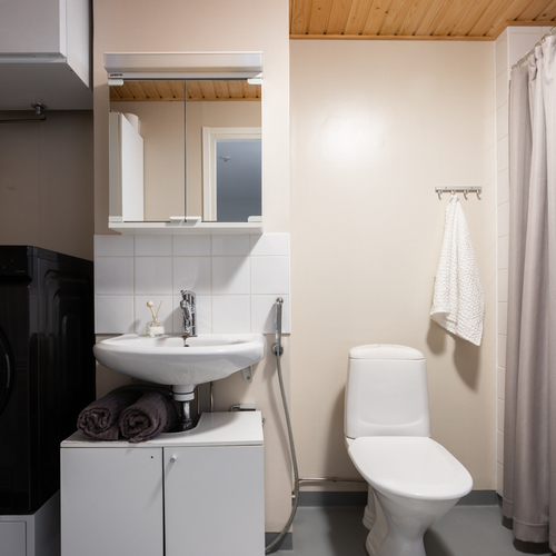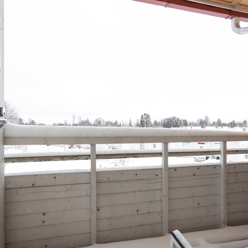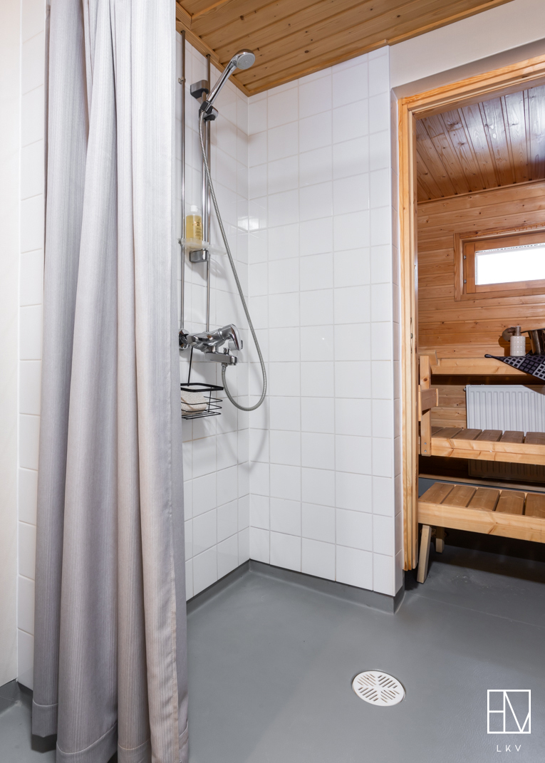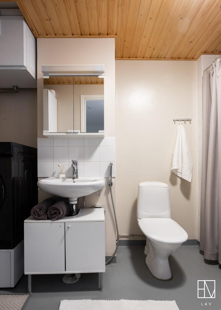 Yläkerrassa on kaksi makuuhuonetta, joista suuremman yhteydestä kulku parvekkeelle. Lisäksi ylhäällä on pesuhuone kera wc-istuimen ja saunan. Molemmissa kerroksissa on siis wc, joka tuo helpotusta etenkin lapsiperheiden arkeen.