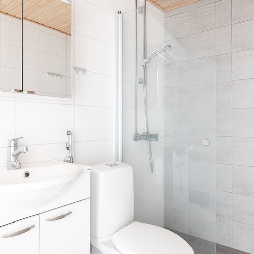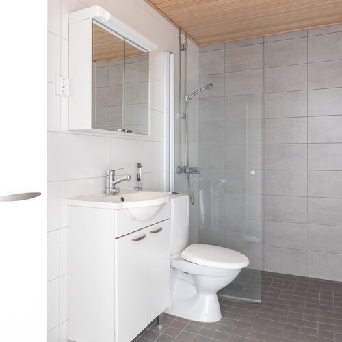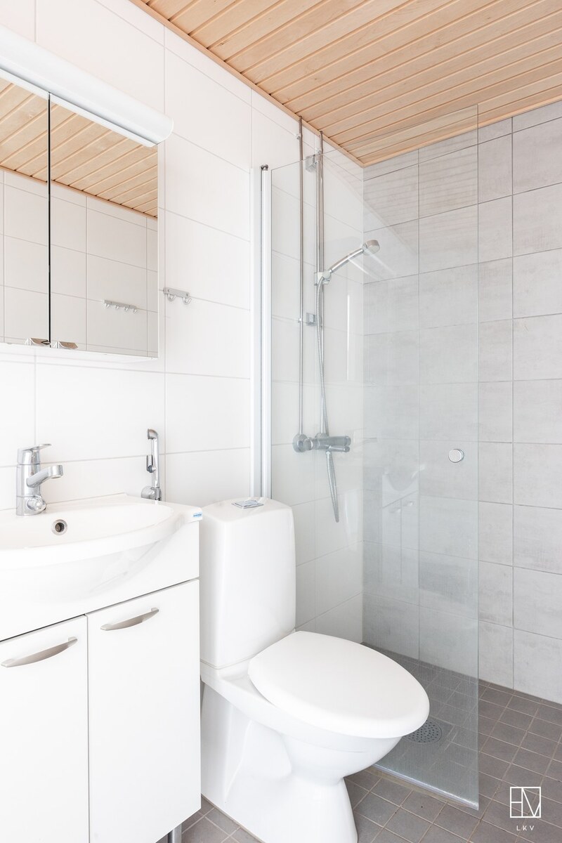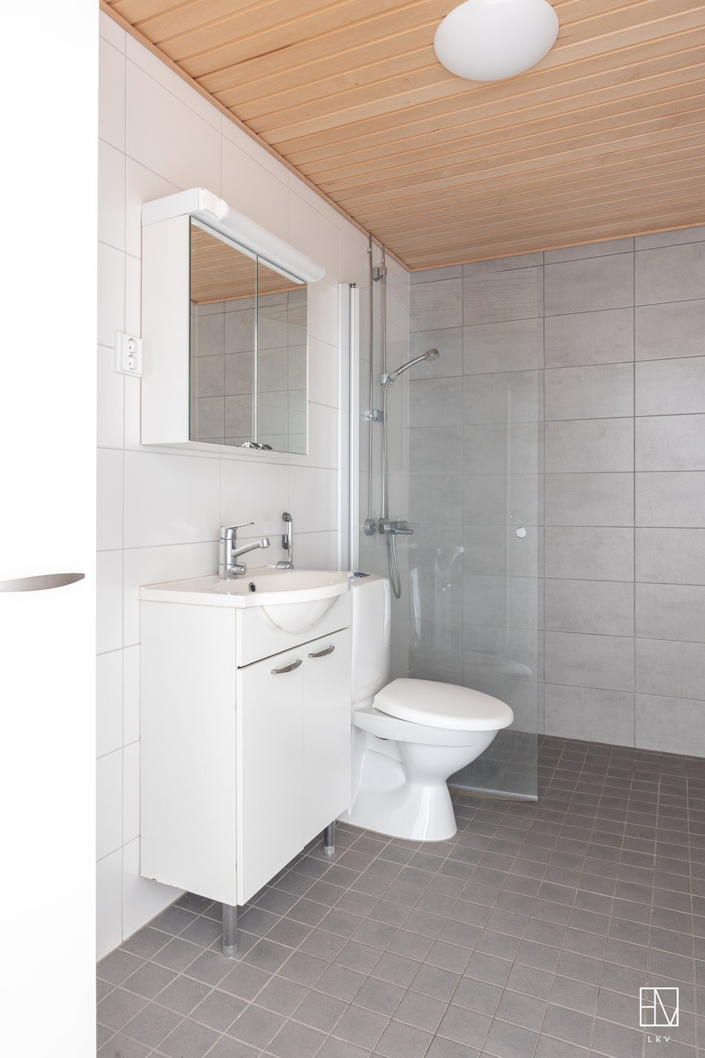 Tilava kylpyhuone, johon mahtuu hyvin pyykinpesukone.