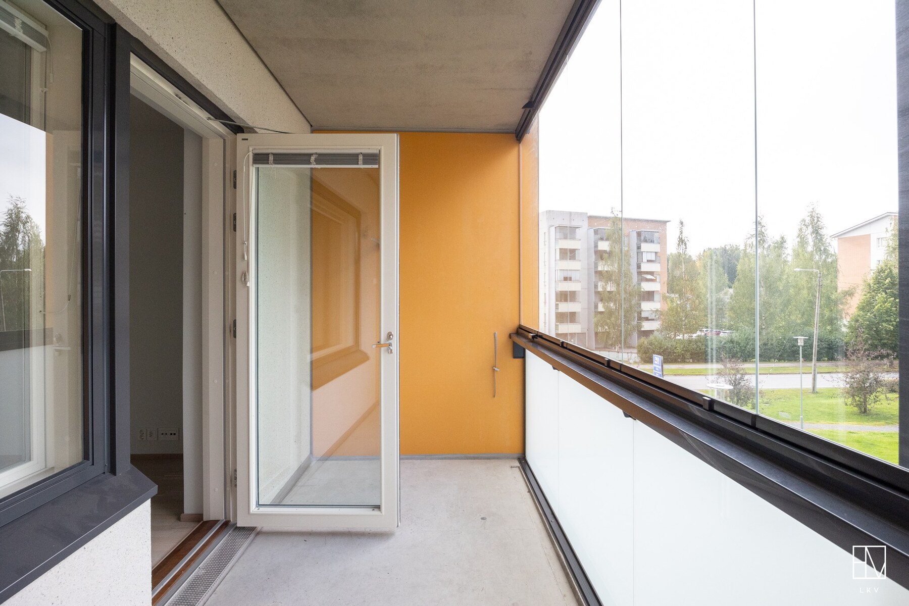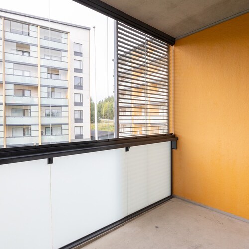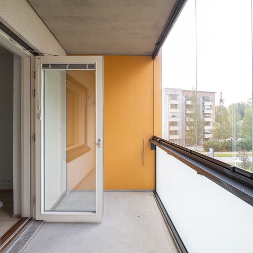 Suuri lasitettu parveke kruunaa kokonaisuuden.
