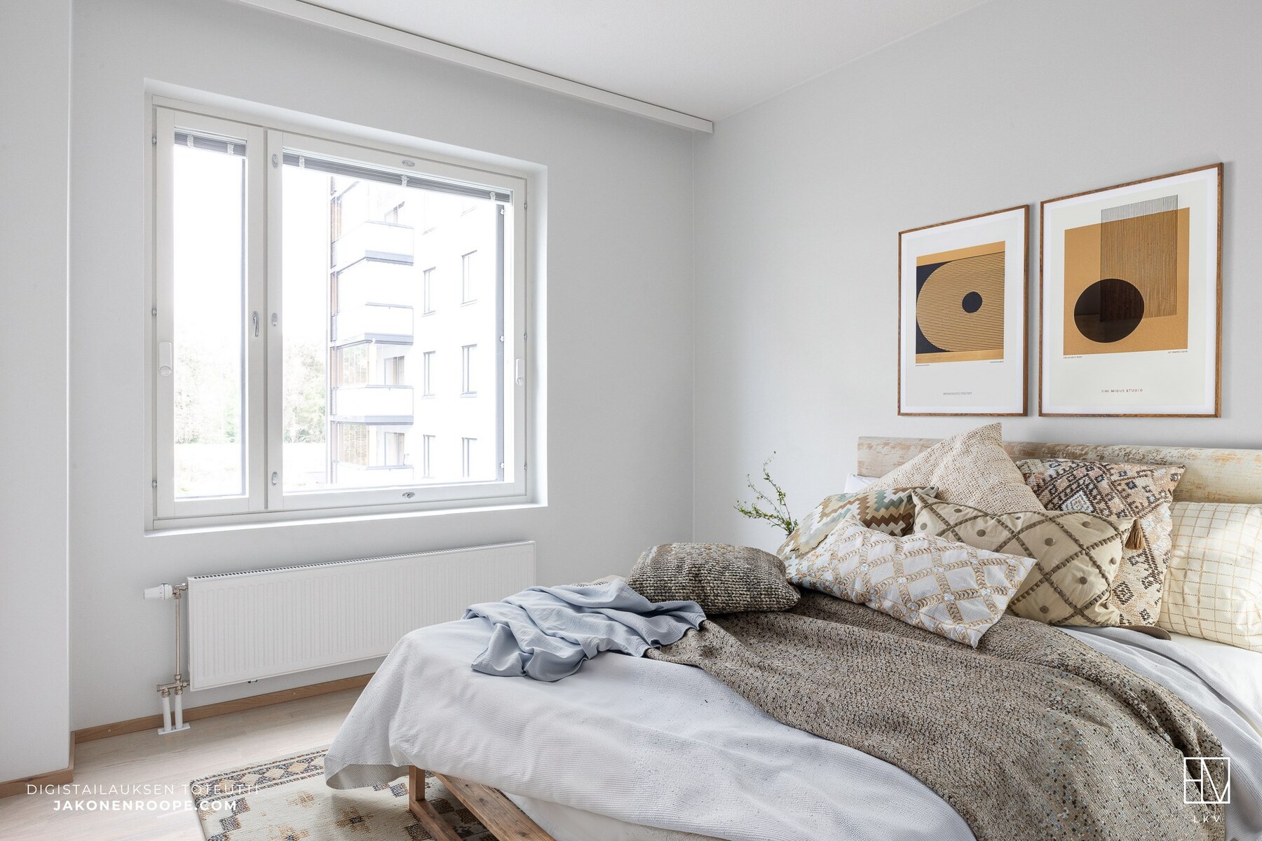 Avoin keittiö yhdistyy olohuoneeseen. Makuuhuoneessa on mukavasti tilaa.
