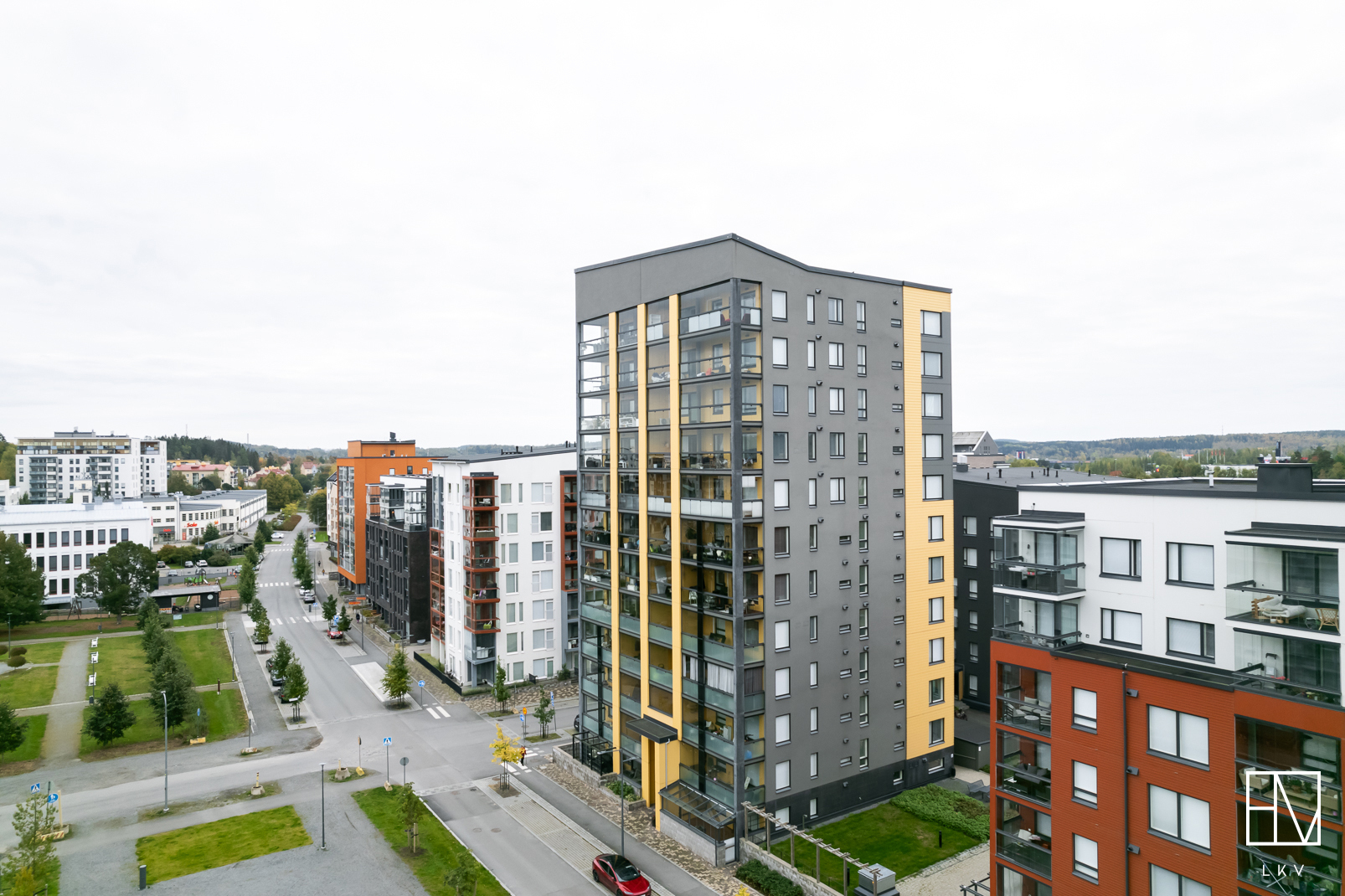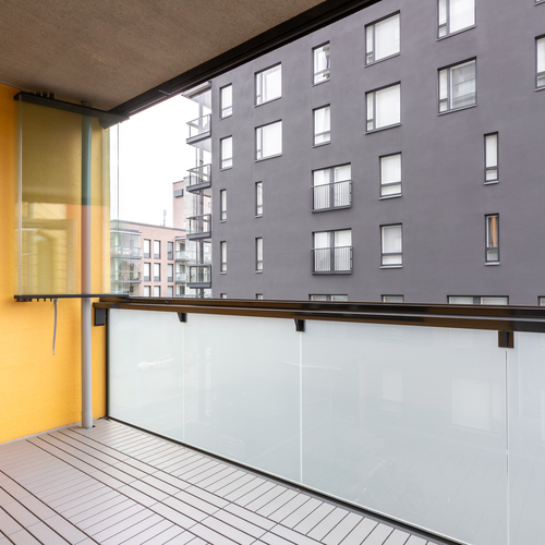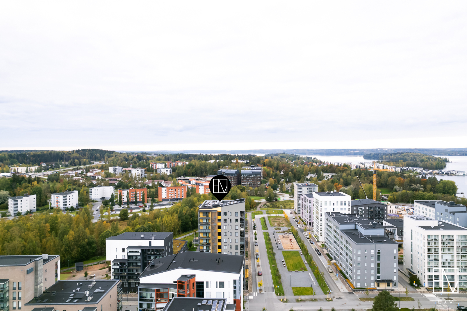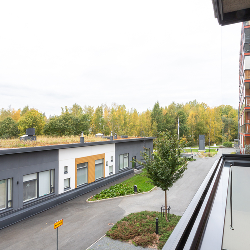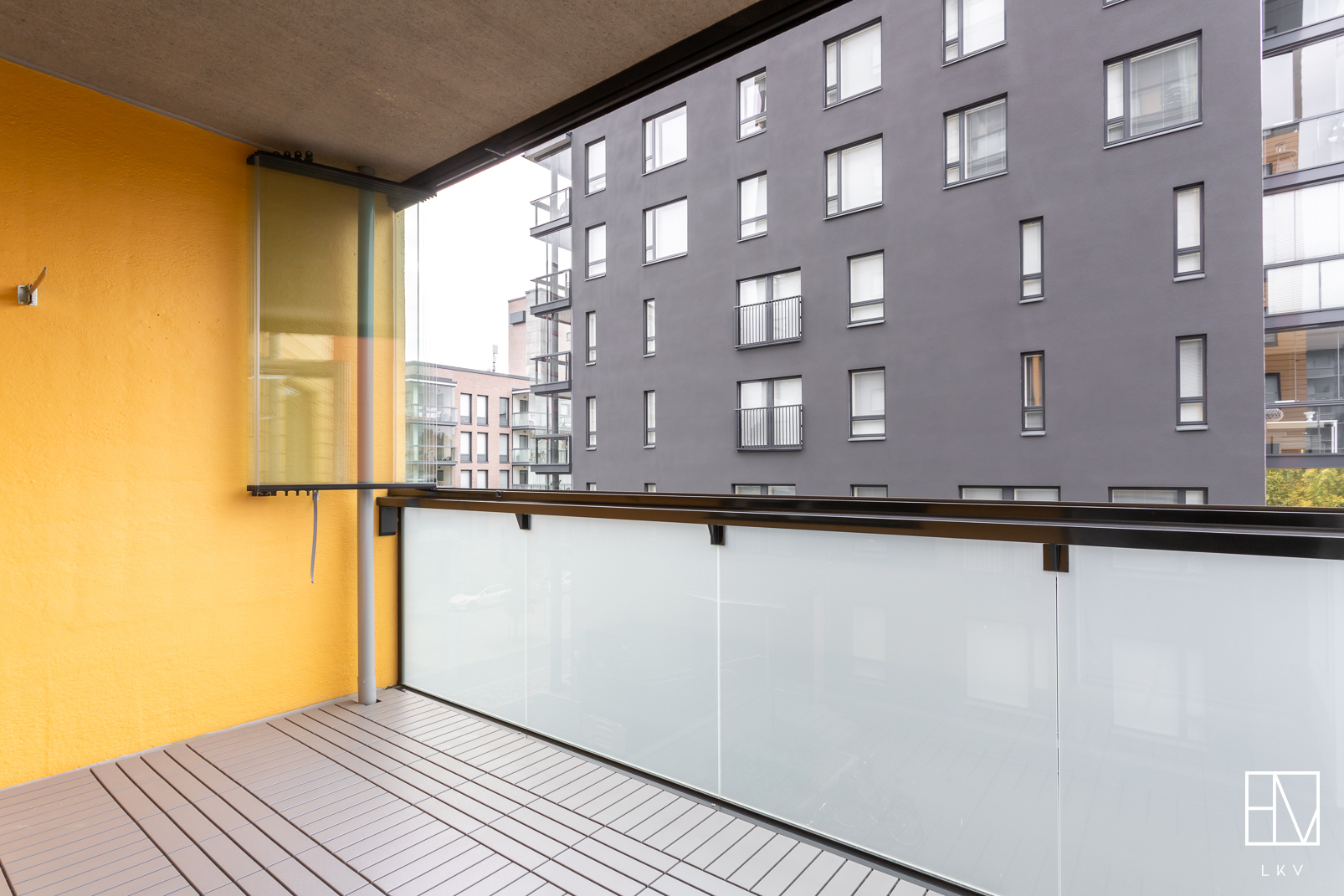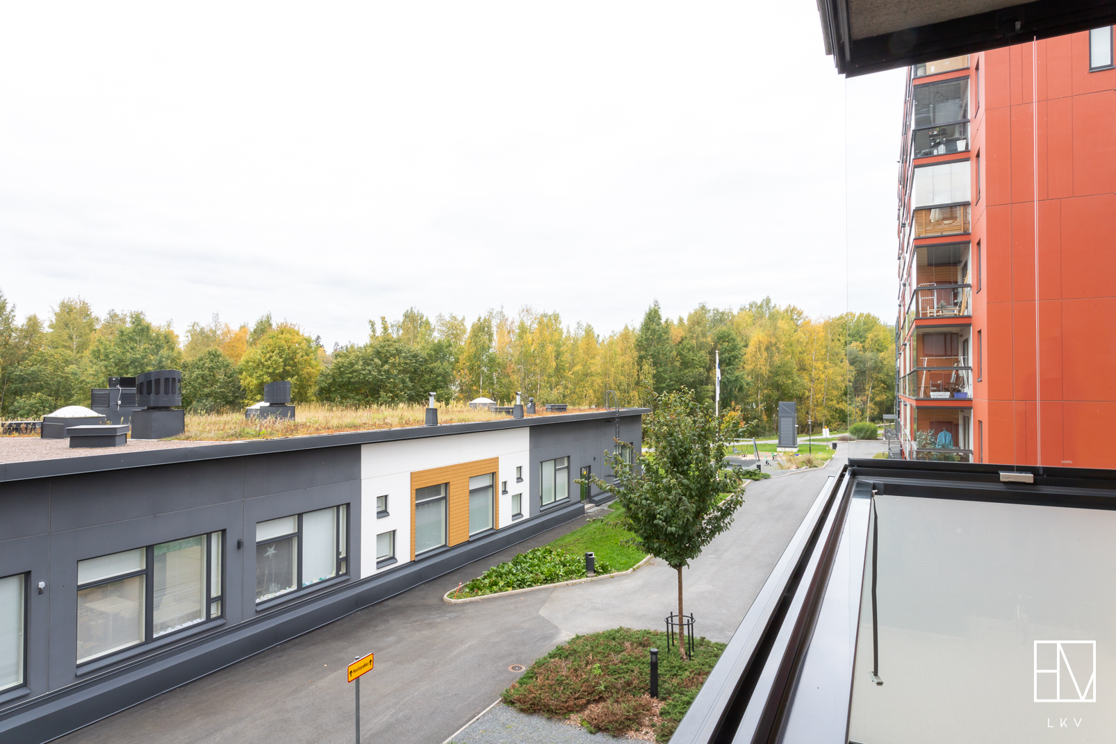 Kodin kruununa toimii iso lasitettu terassi, joka avautuu rauhalliseen ja vehreään suuntaan, eikä parvekkeen toisella puolella ole naapureita! Asunto sijoittuu ikään kuin kulmaan, mikä tuo mukavasti yksityisyyttä.