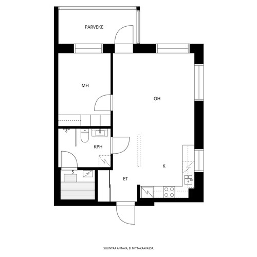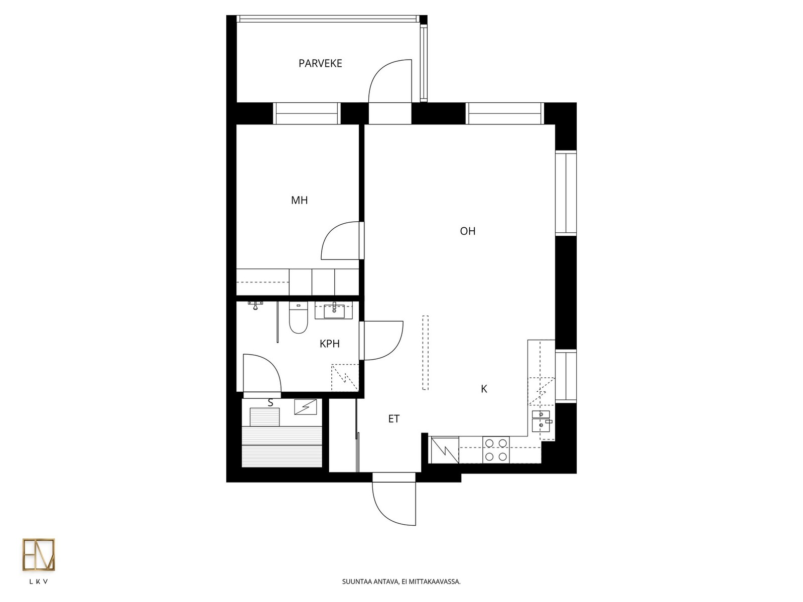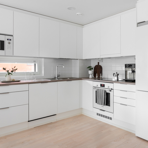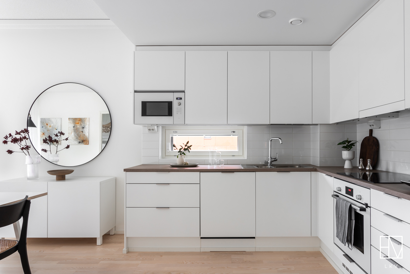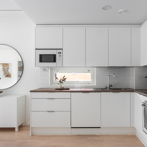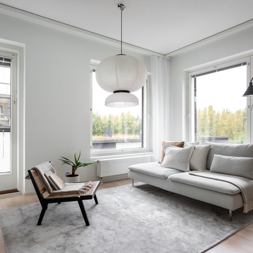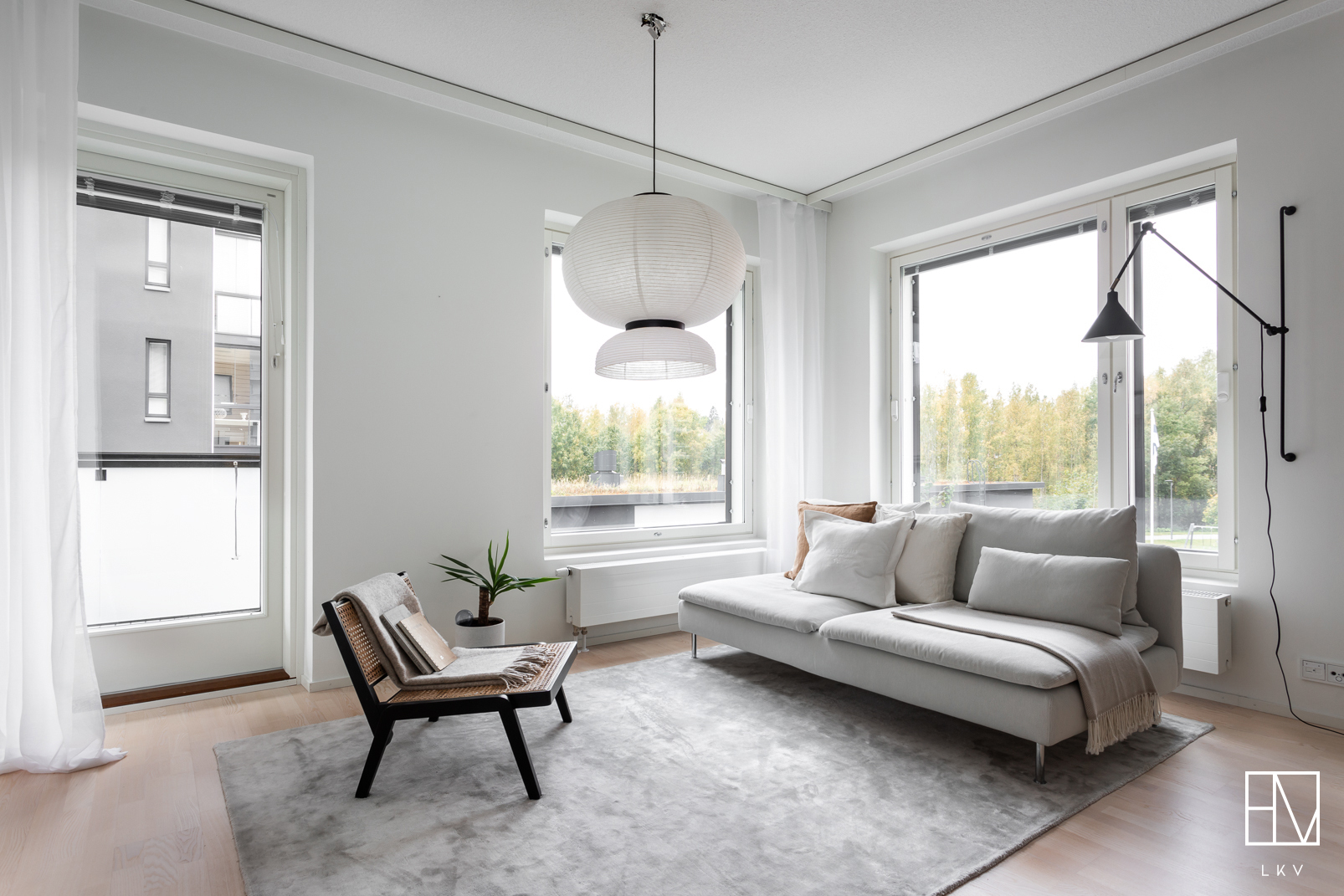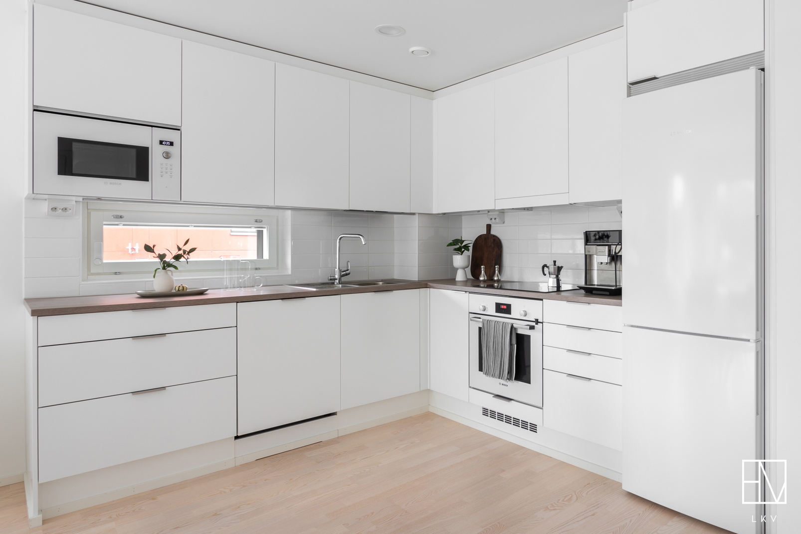 Kodin kruununa toimii iso lasitettu terassi, joka avautuu rauhalliseen ja vehreään suuntaan, eikä parvekkeen toisella puolella ole naapureita! Asunto sijoittuu ikään kuin kulmaan, mikä tuo mukavasti yksityisyyttä.