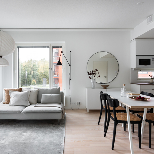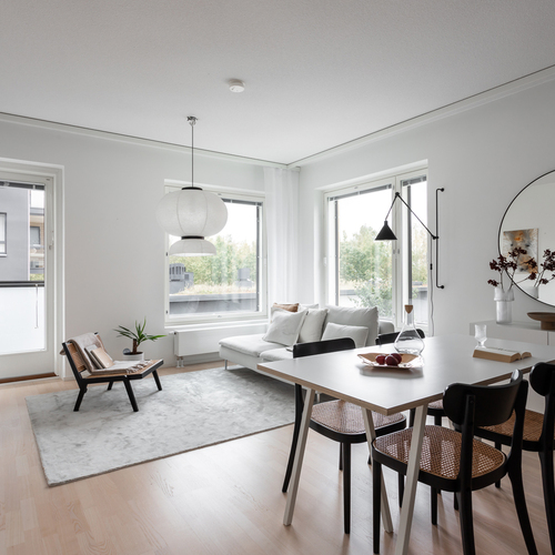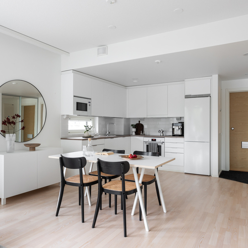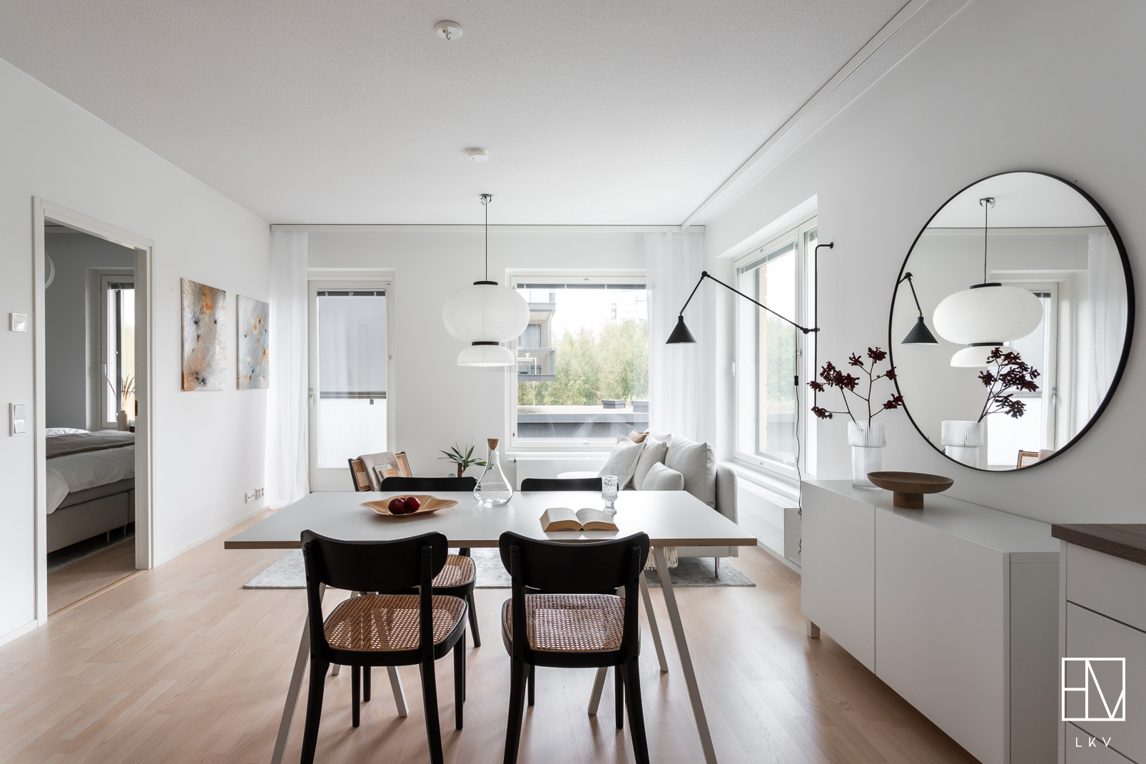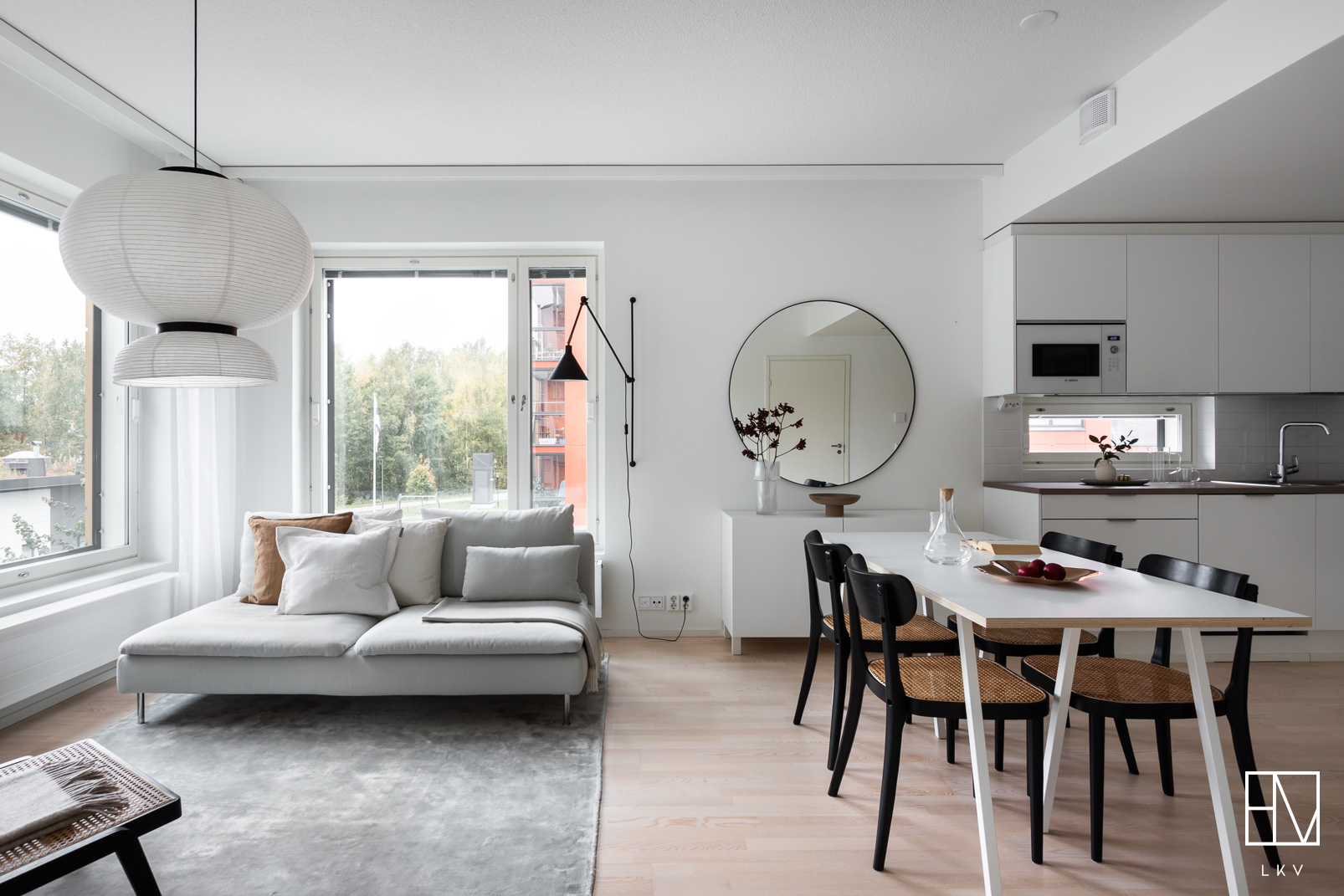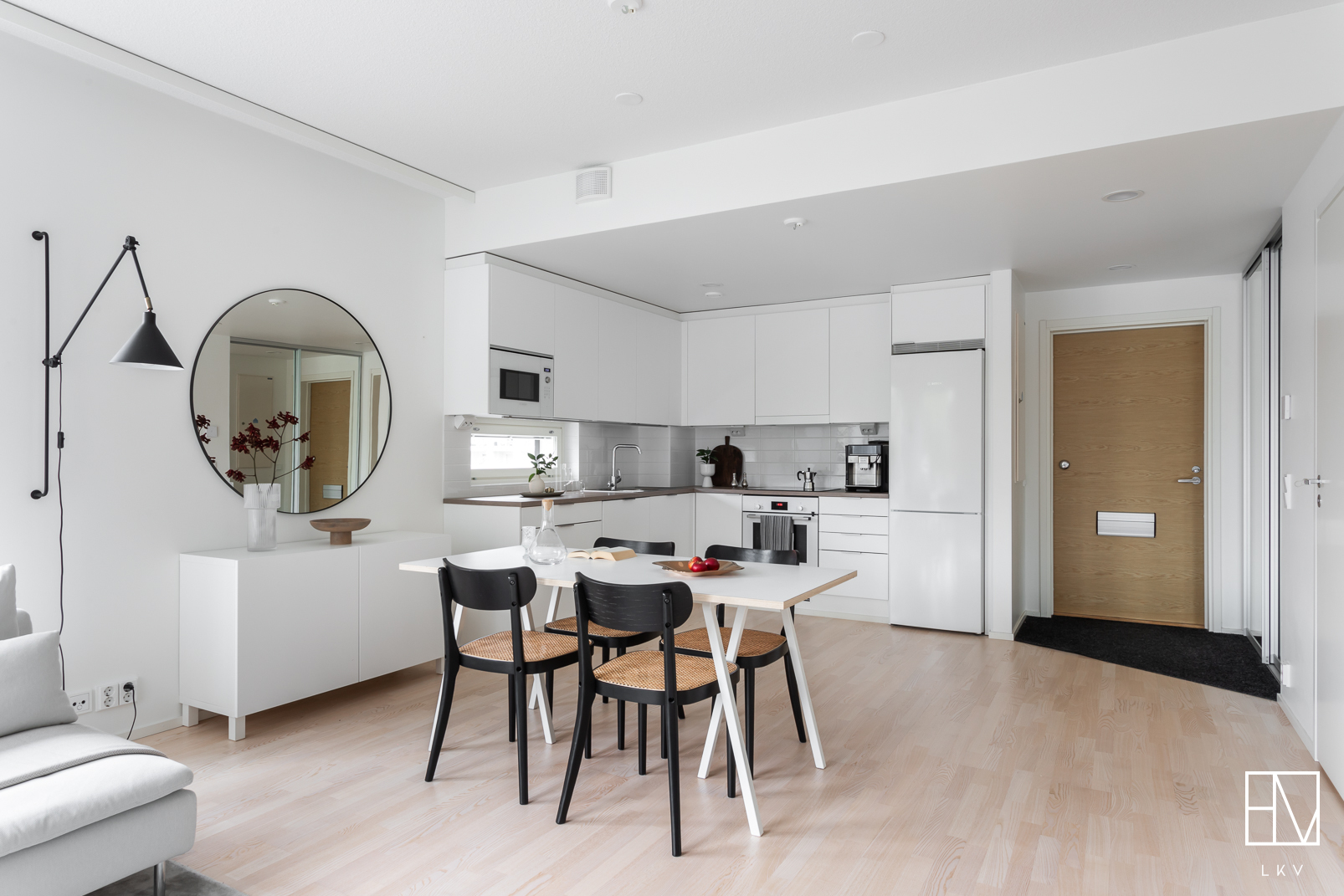 Moderni keittiö yhdistyy tyylikkäästi olohuoneeseen, ja tilavaan ruokailutilaan mahtuu mainiosti ruokapöytä.