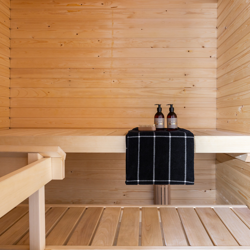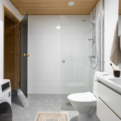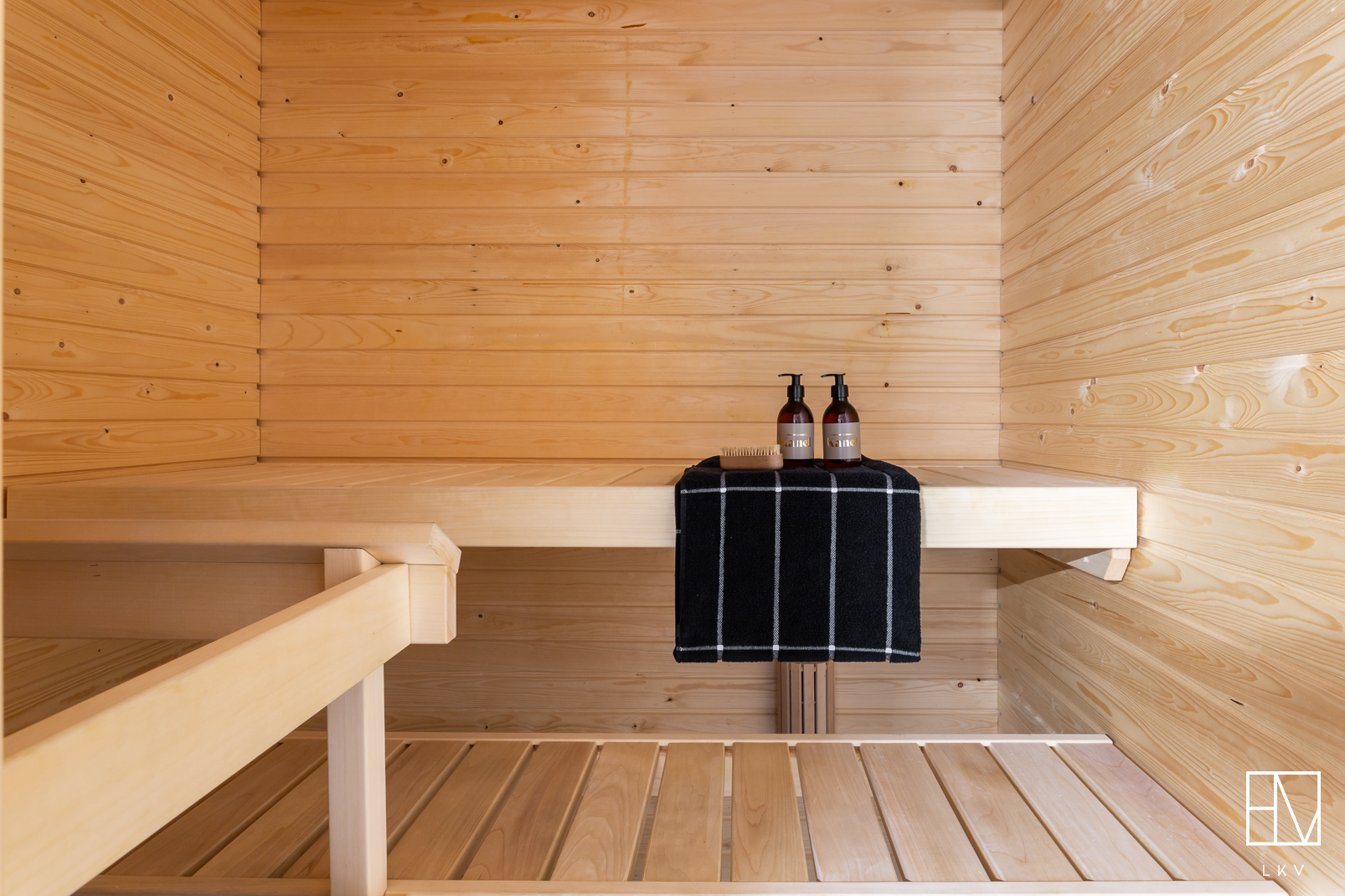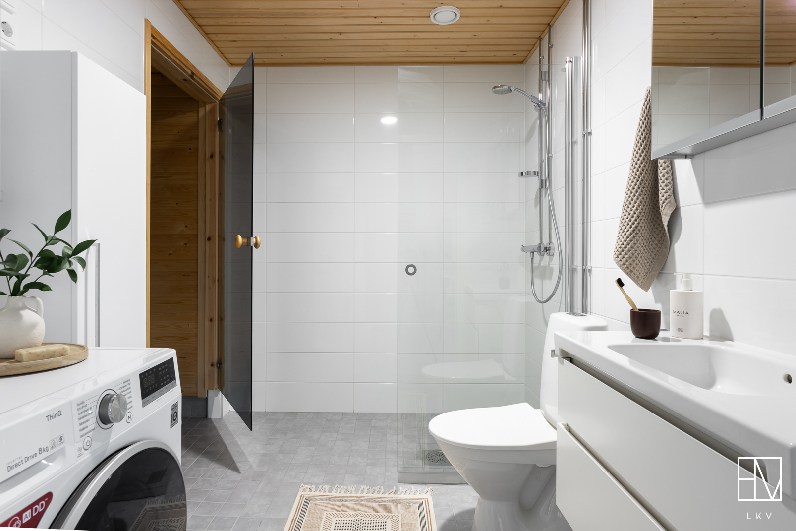 Reilun kokoinen kylpyhuone mahdollistaa sujuvan pyykkihuollon, ja oma sauna tuo arkeen ripauksen luksusta.