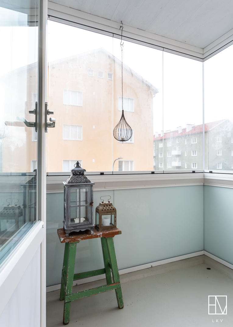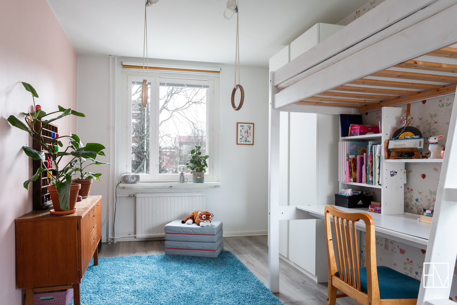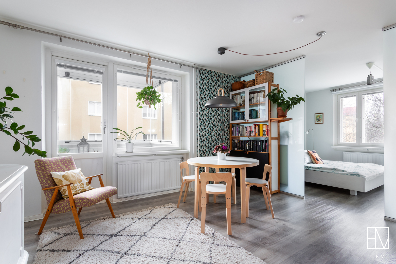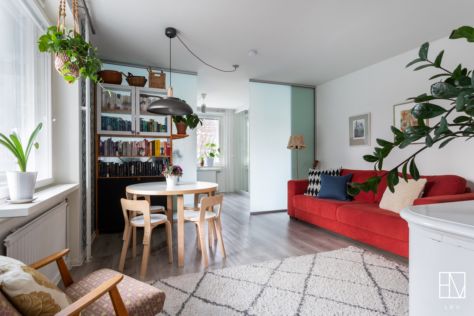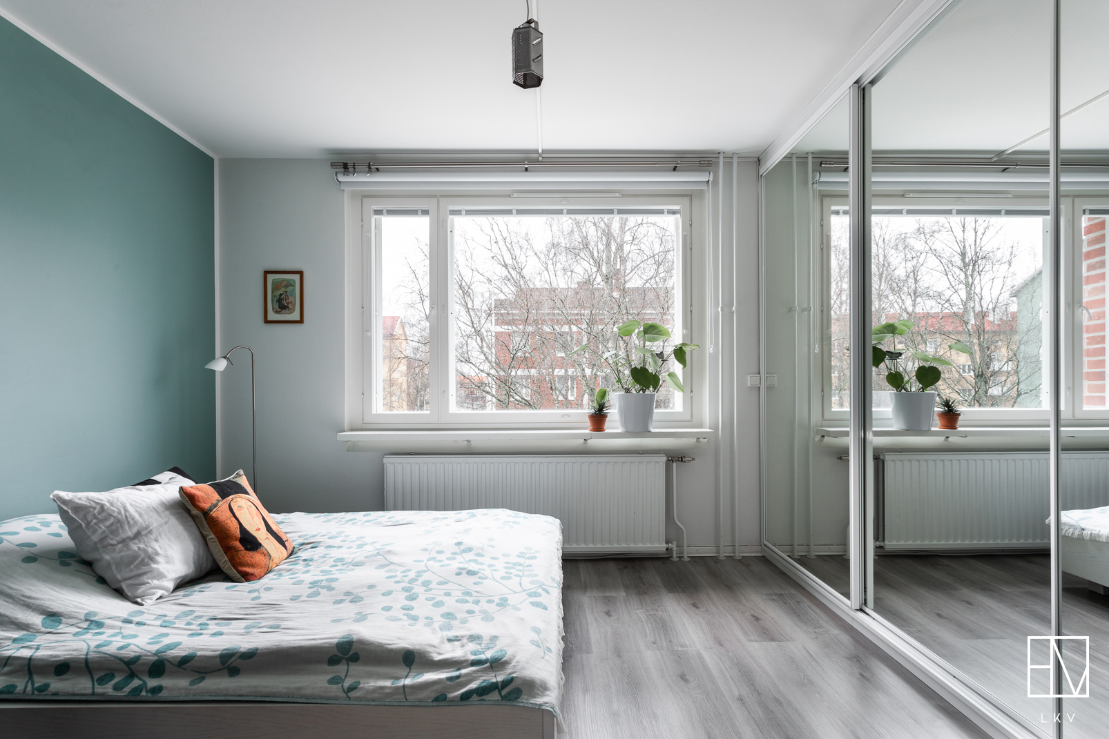 Huoneistossa on kolme makuuhuonetta, joista yksi on tehty ison olohuoneen yhteyteen ja tila on eroteltu näyttävällä lasiseinällä. Lisäksi asunnossa on erillinen keittiö, jossa on hyvät puitteet kotikokille. Kylpyhuone on talon aikakaudelle tyypillisesti kompaktin kokoinen, mutta kaikki tarpeellinen pyykinpesukonetta myöten mahtuu tilaan hyvin. Asuinmukavuutta on lisäämässä lasitettu parveke, joka on hiljattain saneerattu taloyhtiön remontin yhteydessä.