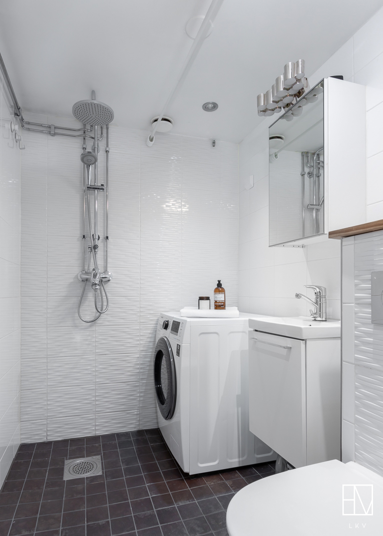 Varusteet: pesukoneliitäntä, lattialämmitys, wc-istuin, suihku, peilikaappi