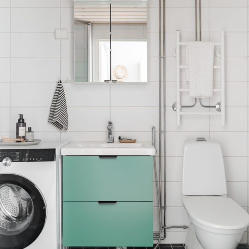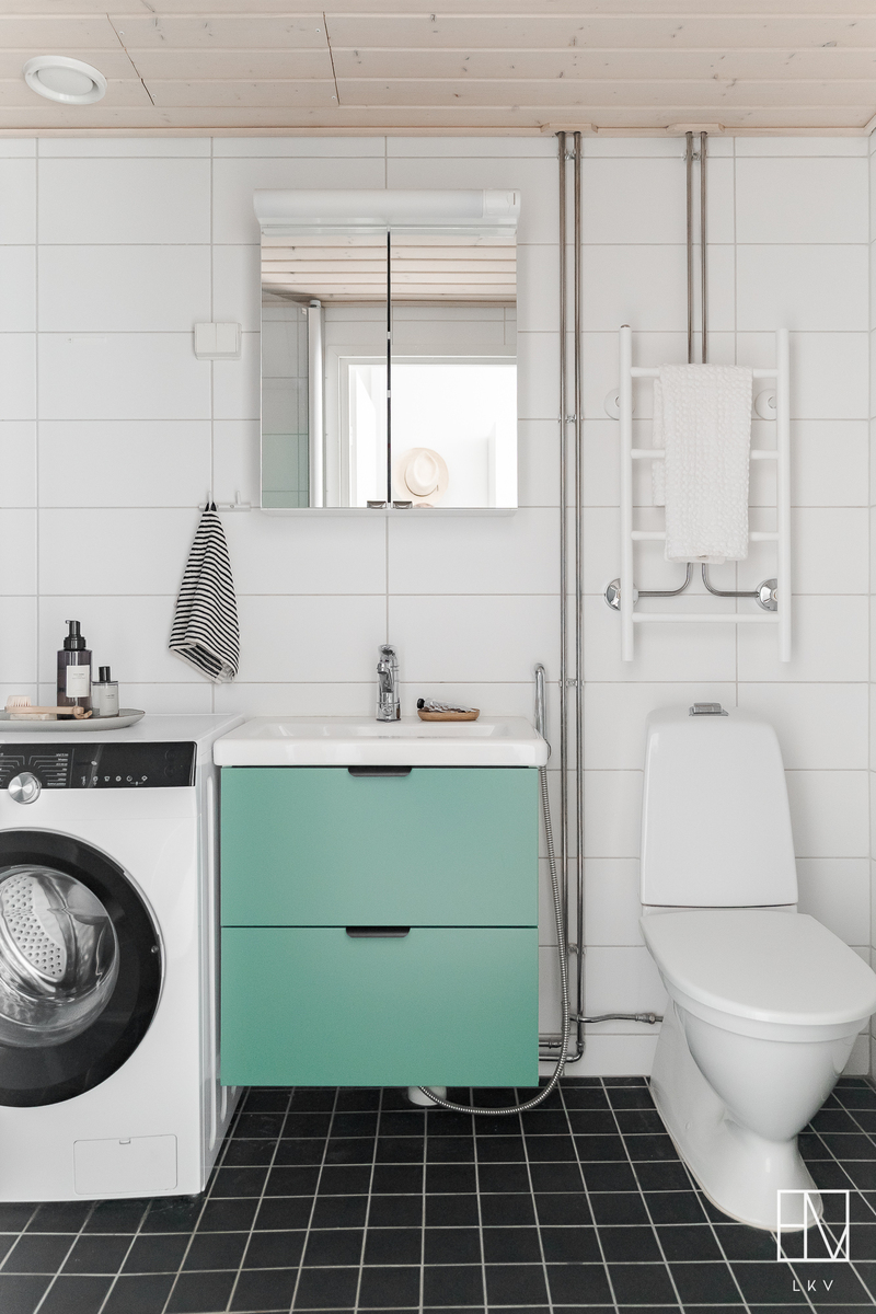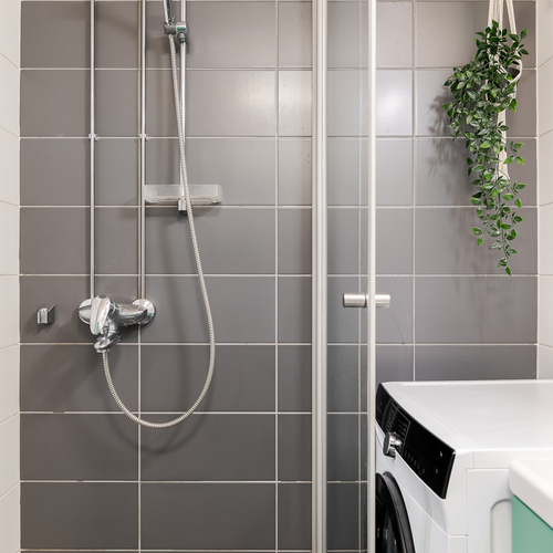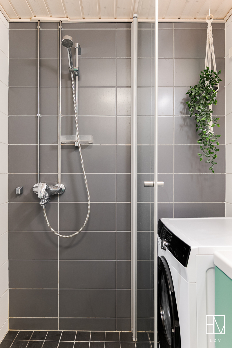 Varusteet: suihkuseinä, pesukoneliitäntä, wc-istuin, suihku, peilikaappi, kiinteät valaisimet