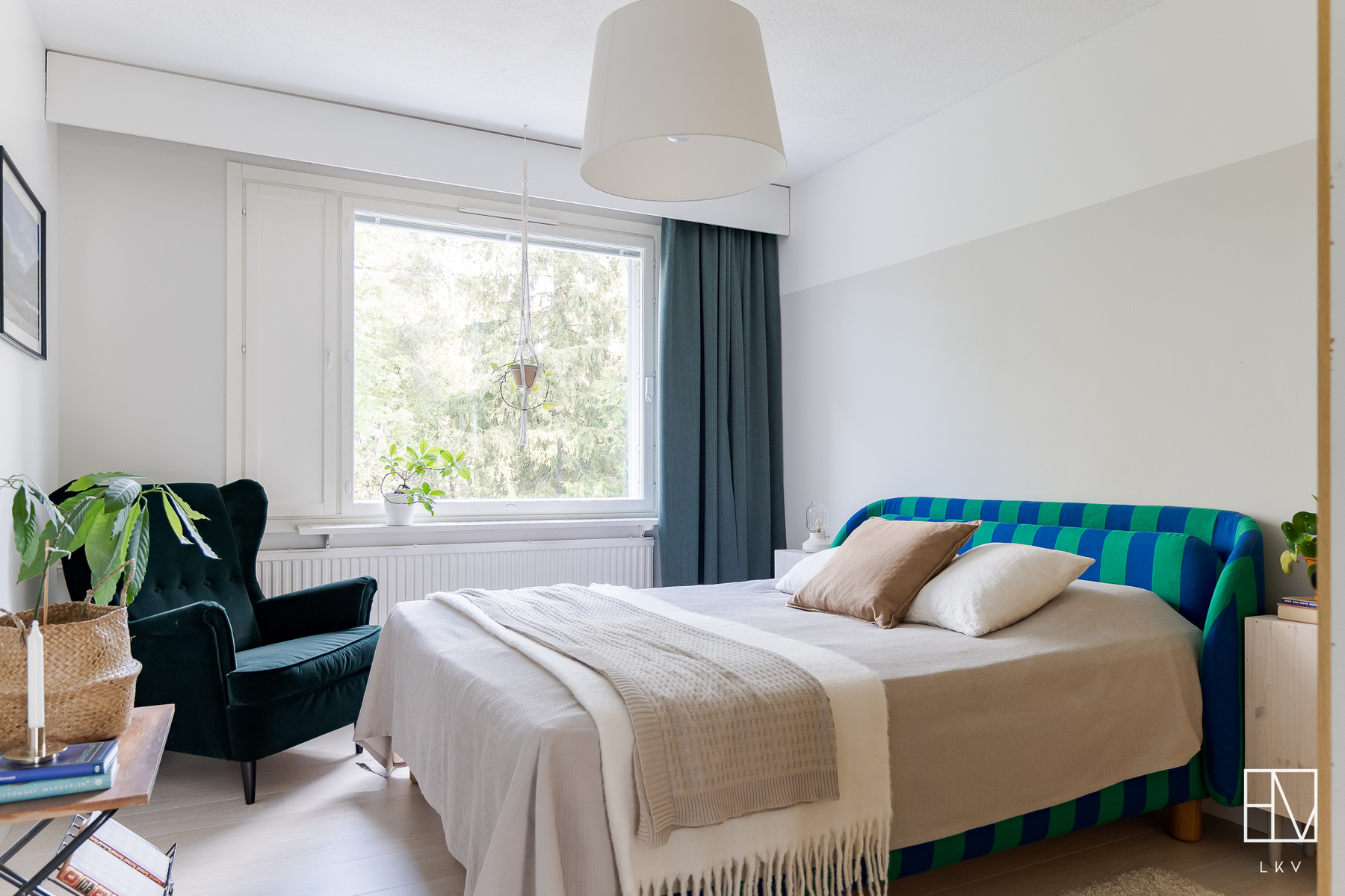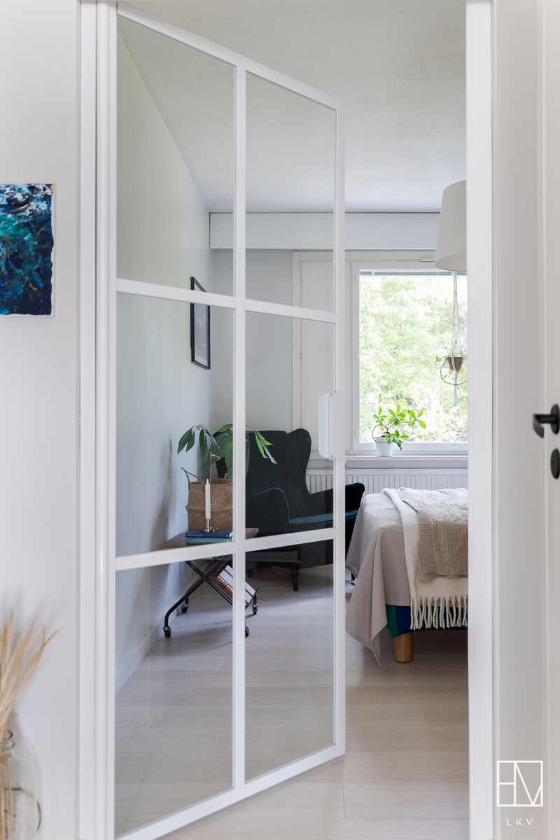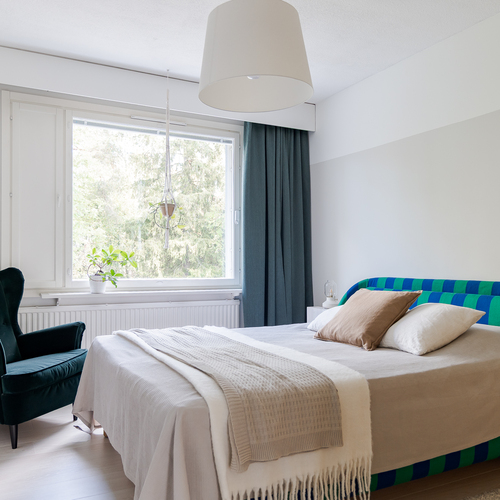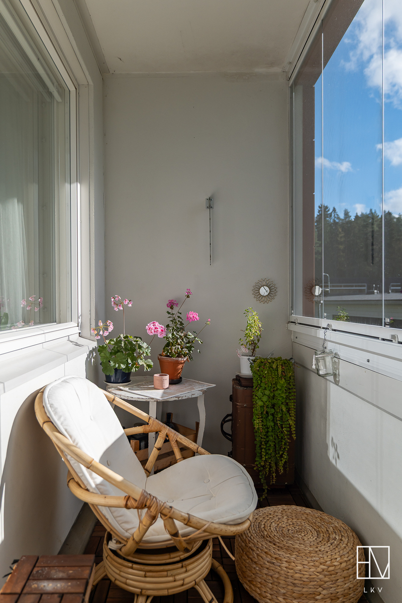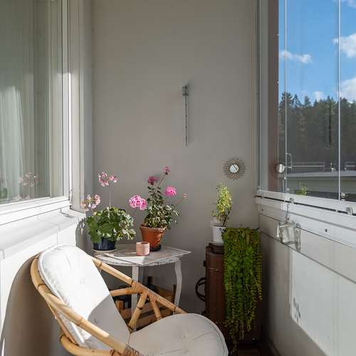 Iso makuuhuone antaa leveän sängyn lisäksi tilan esimerkiksi työpisteelle ja säilytystilaa on runsaasti kaapein. Myös reilun kokoinen vaatehuone takaa sen, että tästä kodista ei säilytystila hevillä lopu kesken! Valoisa olohuone avautuu aurinkoisesti etelään ja tarjoaa kokonsa puolesta mahdollisuudet hyvin monenlaisille sisustusratkaisuille. Olohuoneesta käy kulku asunnon etelään avautuvalle lasitetulle parvekkeelle.