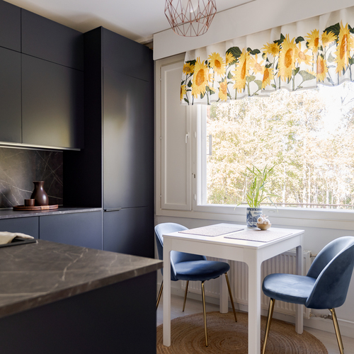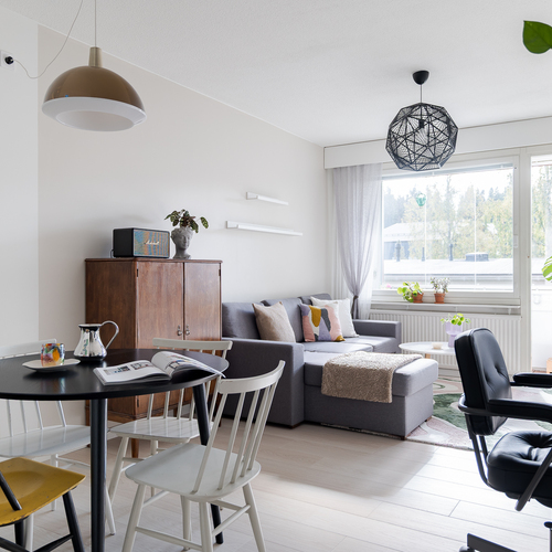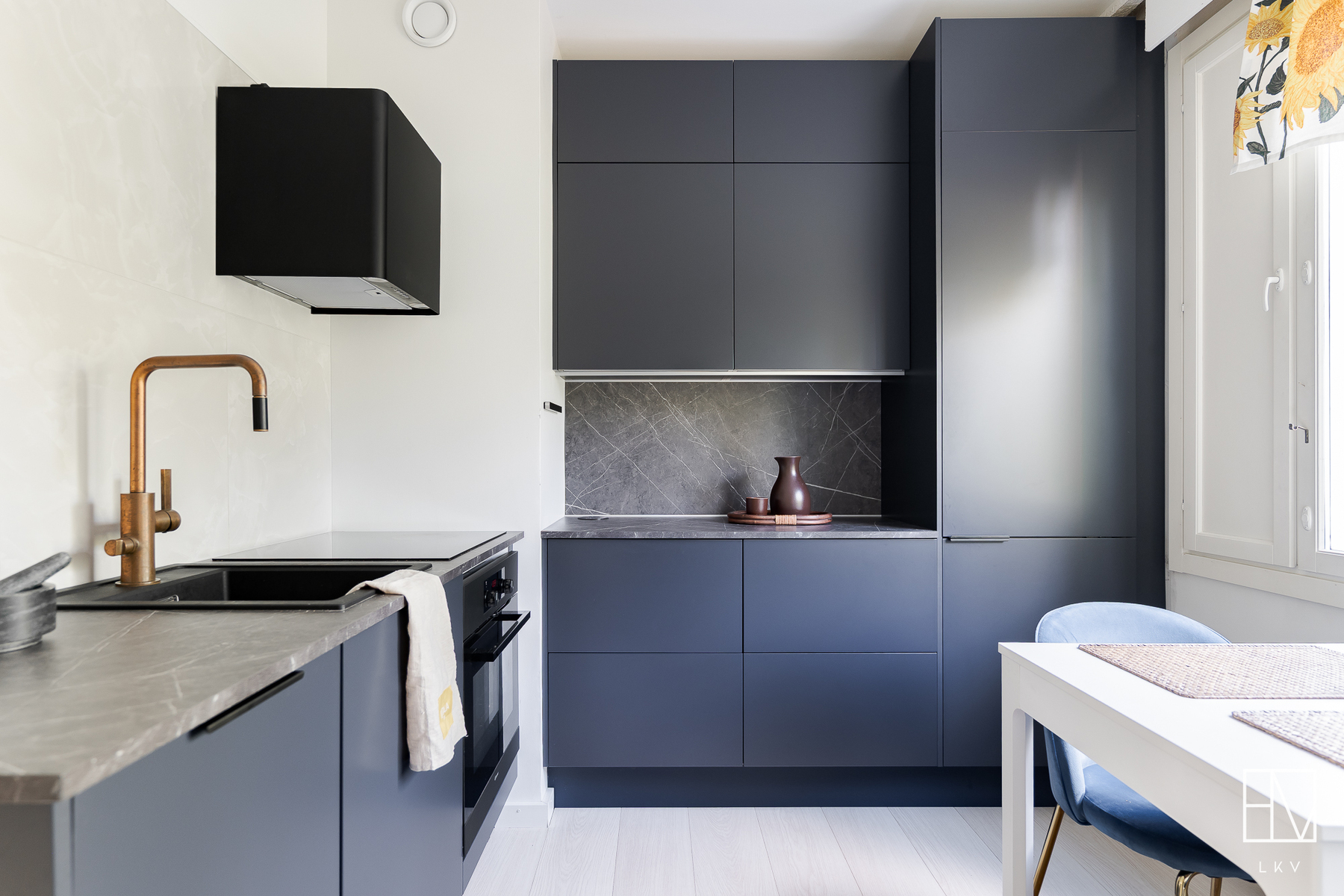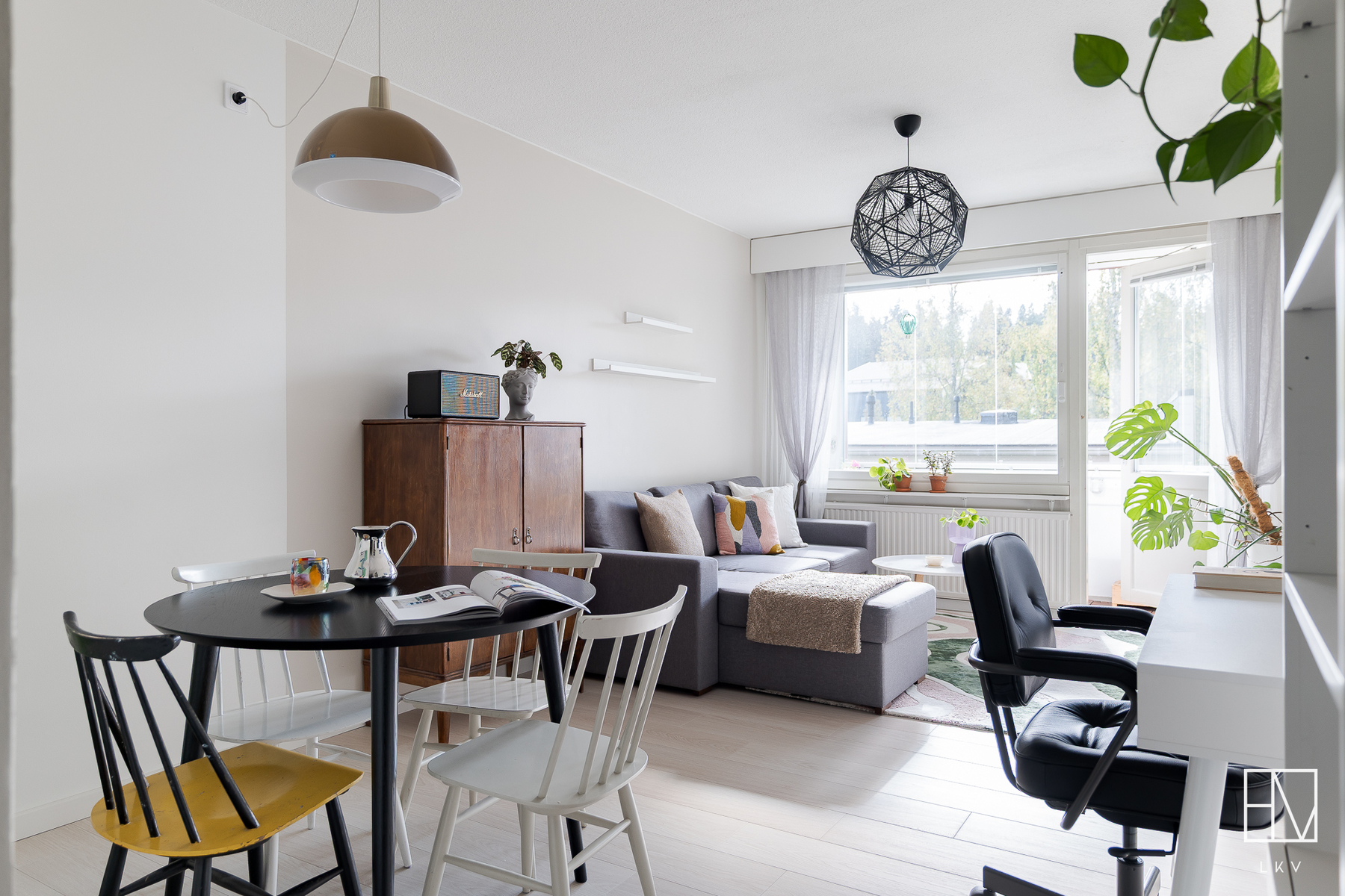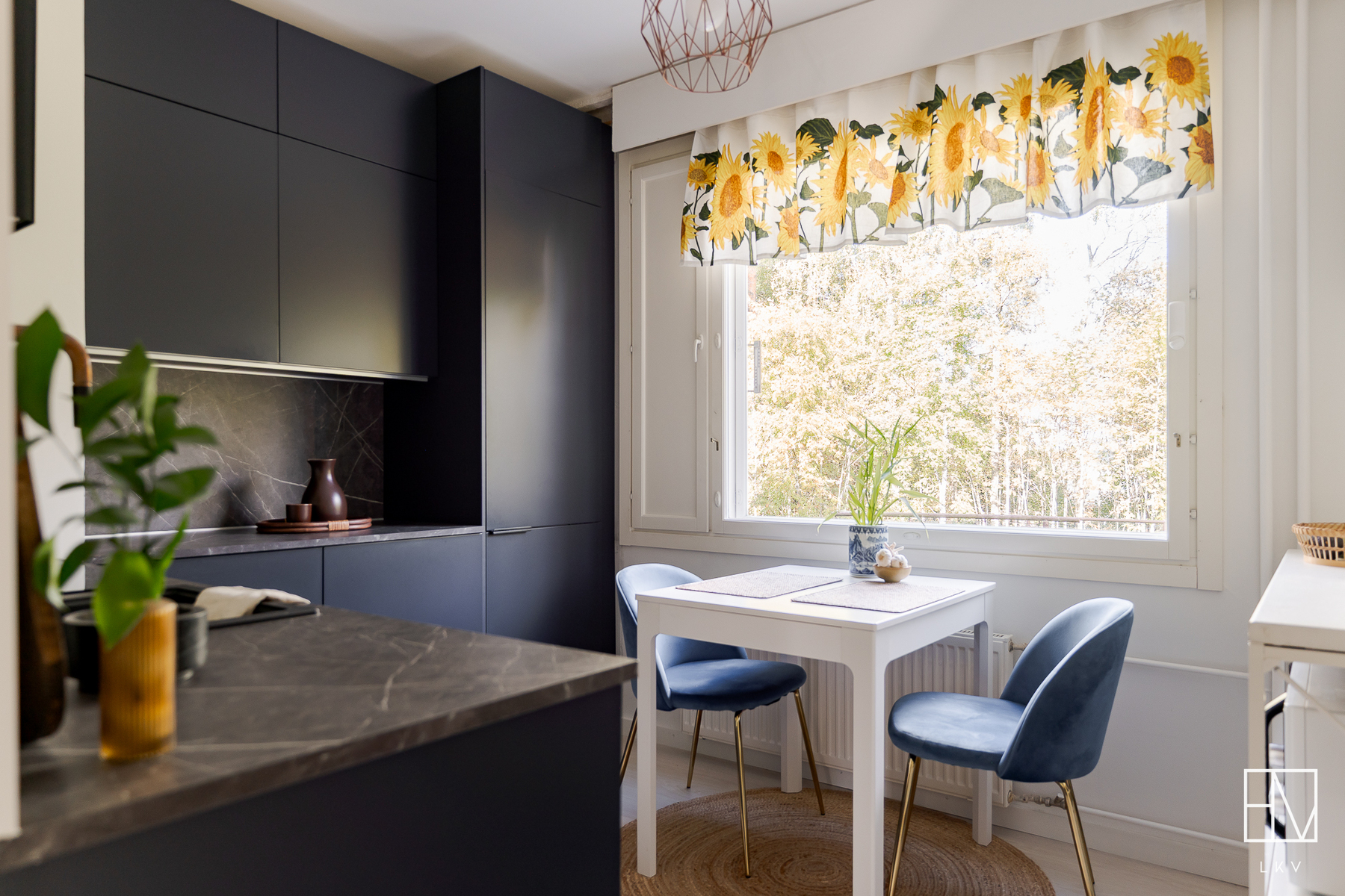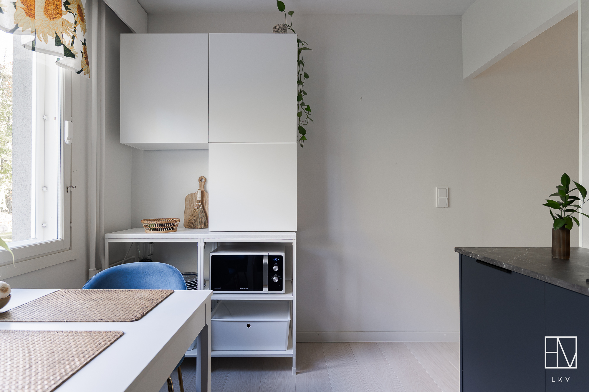 Tämä koti todella ihastuttaa kauneudellaan! Vuonna 2022 miltei kaikkialle uudet pinnat saanut koti ei isompia remontteja lähivuosina kaipaa. Asunto on mahtava yhdistelmä värien yhdistelyä ajattomaan ja skandinaaviseen tyyliin yksityiskohtia unohtamatta. Asuntoon sisälle astuessasi löydät eteisestä säilytystilaa ulkovaatteille ja heti vasemmalla on linjasaneerauksen yhteydessä vuonna 2013 uusittu kylpyhuone. Kylpyhuoneen varusteluun kuuluvat mm. allas- ja peilikaappi, suihku ja suihkuseinä, wc-istuin, pesukoneliitäntä, pyyhekuivain sekä ajattomat laattavalinnat. Allaskaapin viehättävä sävy antaa ihanan lisämausteen kylpyhuoneen ilmeelle. Kylpyhuoneen vieressä on säväyttävä keittiö, joka hurmaa sinertävillä kaapeillaan ja upean tyylikkäillä välitilalaatoillaan. Keittiön varusteluun kuuluvat mm. jääkaappipakastin, induktioliesitaso ja erllisuuni, astianpesukone, liesituuletin sekä sopivasti säilytystilaa sekä kaapein, että laatikoin. Keittiöön mahtuu arkiruokapöytä ja näkymät avautuvat yhtiön etupihaa kohti.