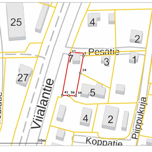 Kaavamerkintä AO, rakennus voi olla I tai II- kerroksinen. Kaava on vanha, joten rakennusoikeus tulee rakennusjärjestyksestä e = 0.25 ja peittoala 20 % tontin pinta-alasta. Koska talon voi rakentaa II- kerroksiseksi on peittoala rakennusoikeuden määräävä tekijä (20 %). Peittoalaan lasketaan myös katokset.
