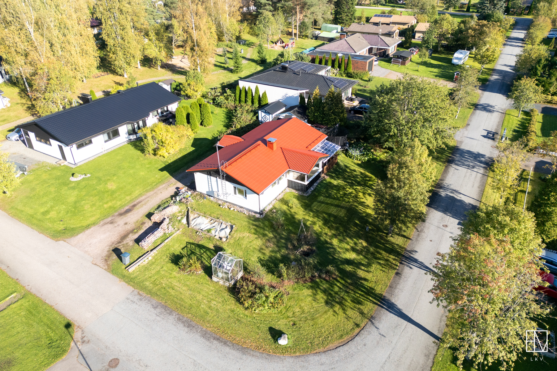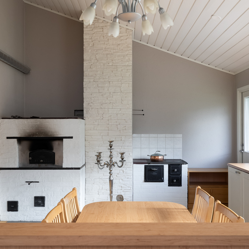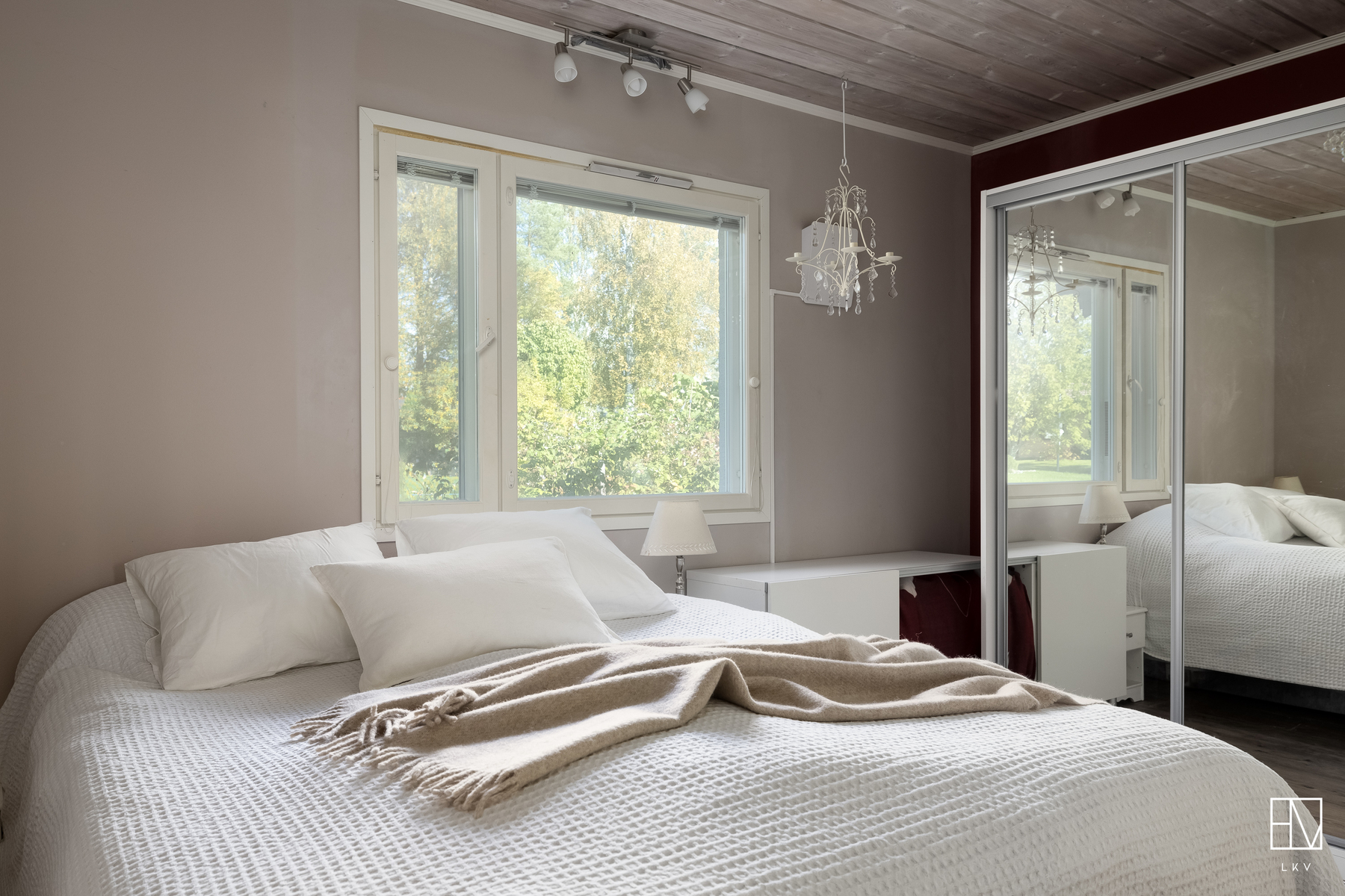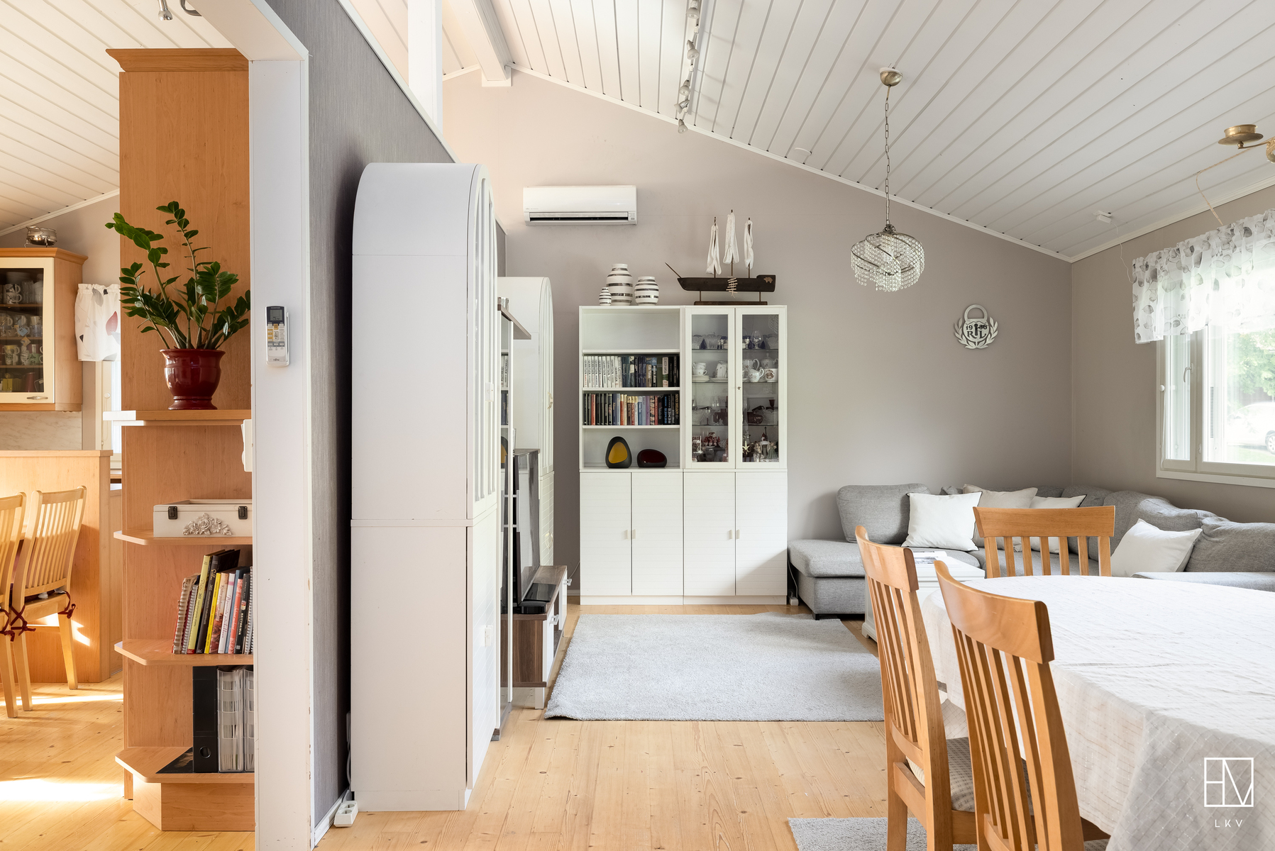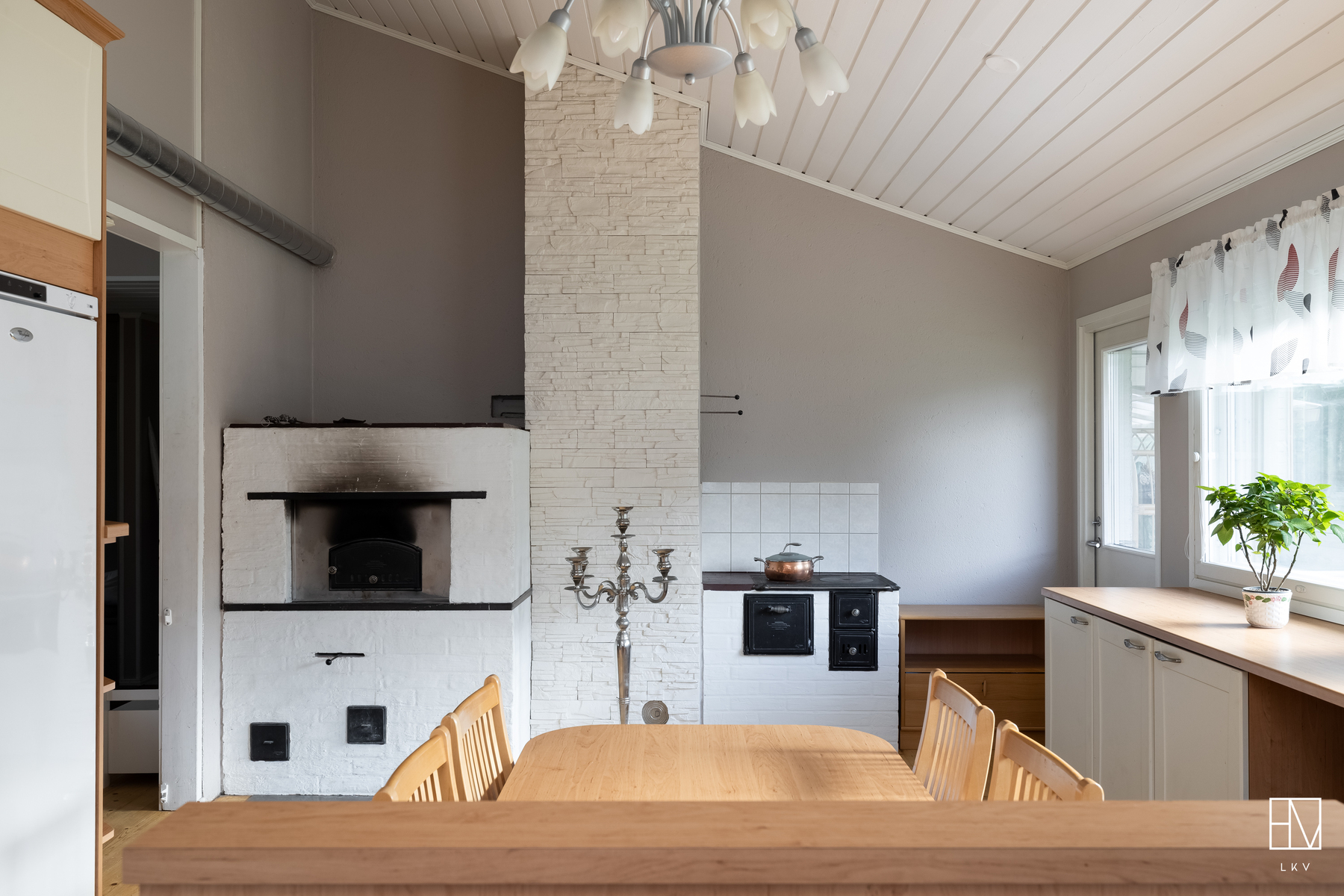 Avara olohuone ja ruokailutila yhdistyvät saumattomasti suureen keittiöön, jossa on sekä leivinuuni että perinteinen puuhella – täydellinen yhdistelmä tunnelmaa ja käytännöllisyyttä. Olohuoneessa korkea viistokatto tuo tilaan ilmavuutta, ja ilmalämpöpumppu huolehtii asumismukavuudesta vuoden ympäri. Kaksi makuuhuoneista on varustettu käytännöllisillä makuuparvilla, jotka tarjoavat lisätilaa vaikkapa lasten leikkeihin, säilytykseen tai vierasmajoitukseen. Eteisessä on lisäksi reilun kokoinen vaatehuone, joka tuo arkeen kaivattua säilytystilaa ja tämän lisäksi kiinteistöllä on erillinen 20 m² ulkovarasto.