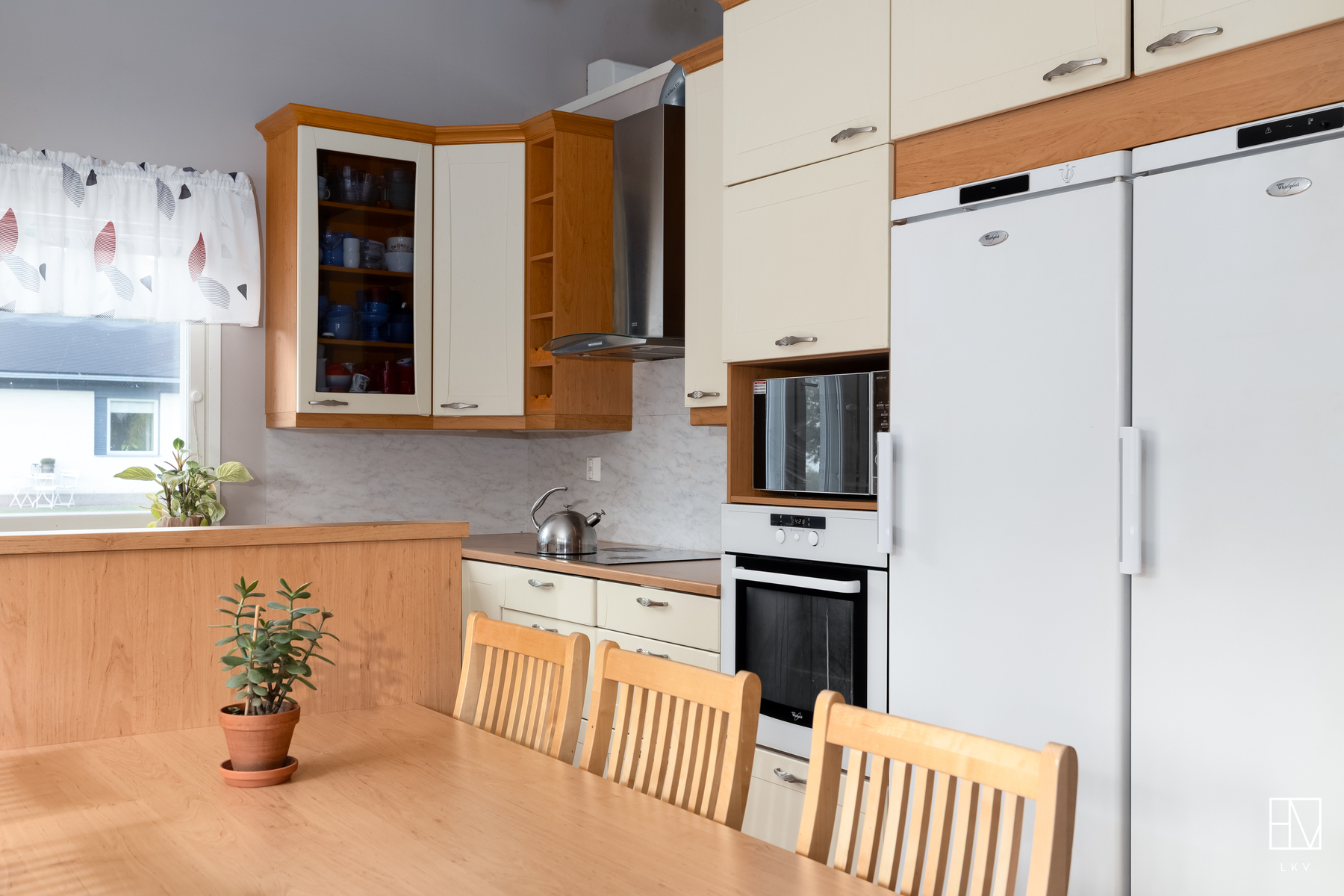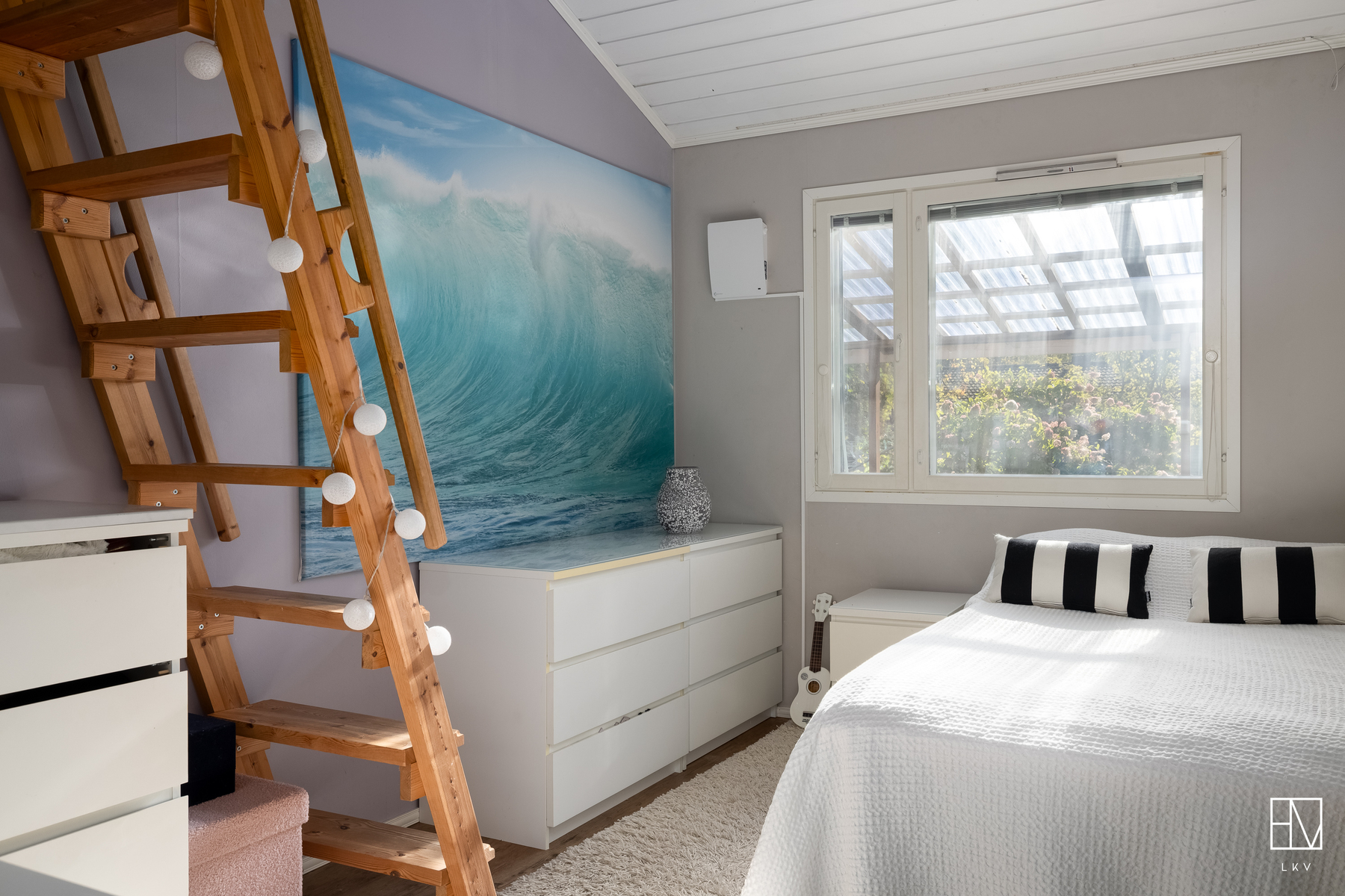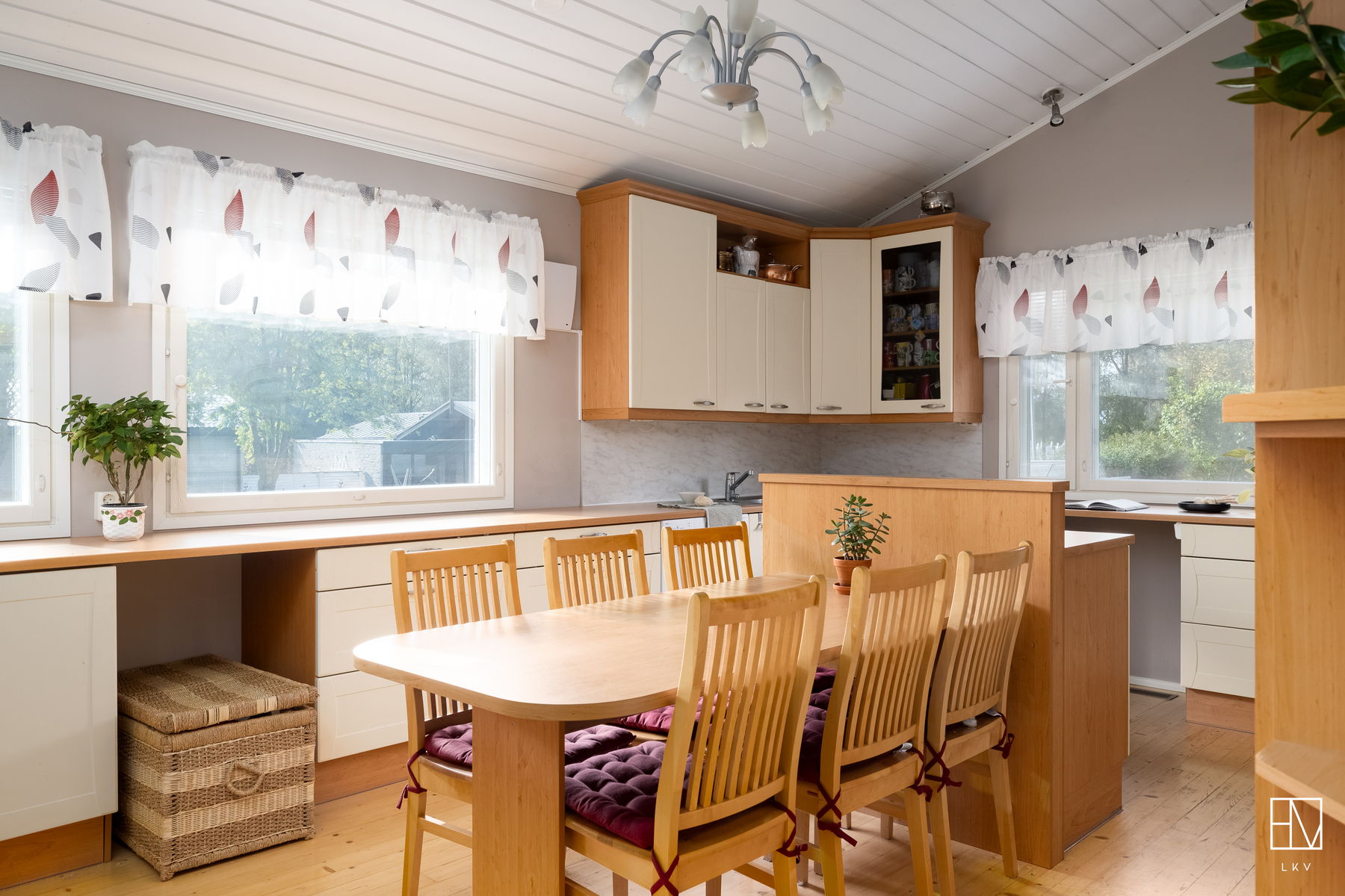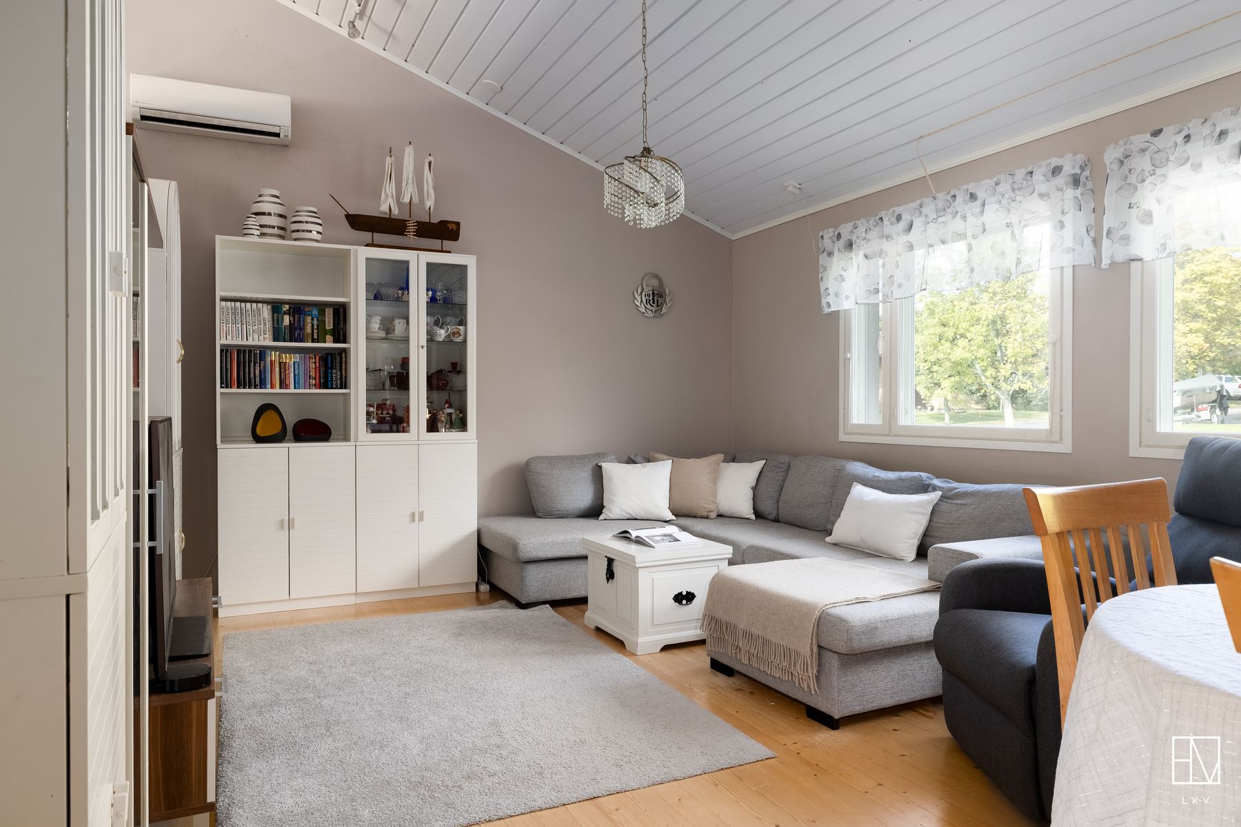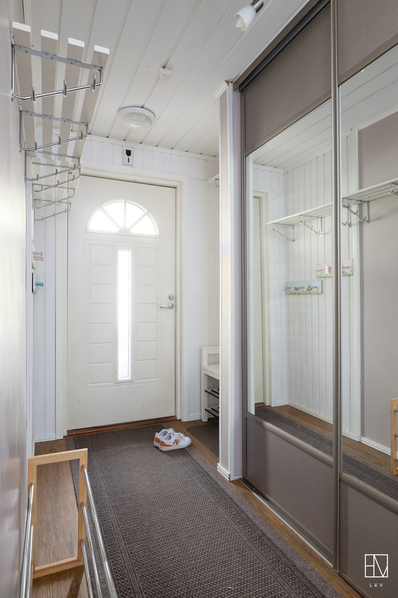 Avara olohuone ja ruokailutila yhdistyvät saumattomasti suureen keittiöön, jossa on sekä leivinuuni että perinteinen puuhella – täydellinen yhdistelmä tunnelmaa ja käytännöllisyyttä. Olohuoneessa korkea viistokatto tuo tilaan ilmavuutta, ja ilmalämpöpumppu huolehtii asumismukavuudesta vuoden ympäri. Kaksi makuuhuoneista on varustettu käytännöllisillä makuuparvilla, jotka tarjoavat lisätilaa vaikkapa lasten leikkeihin, säilytykseen tai vierasmajoitukseen. Eteisessä on lisäksi reilun kokoinen vaatehuone, joka tuo arkeen kaivattua säilytystilaa ja tämän lisäksi kiinteistöllä on erillinen 20 m² ulkovarasto.