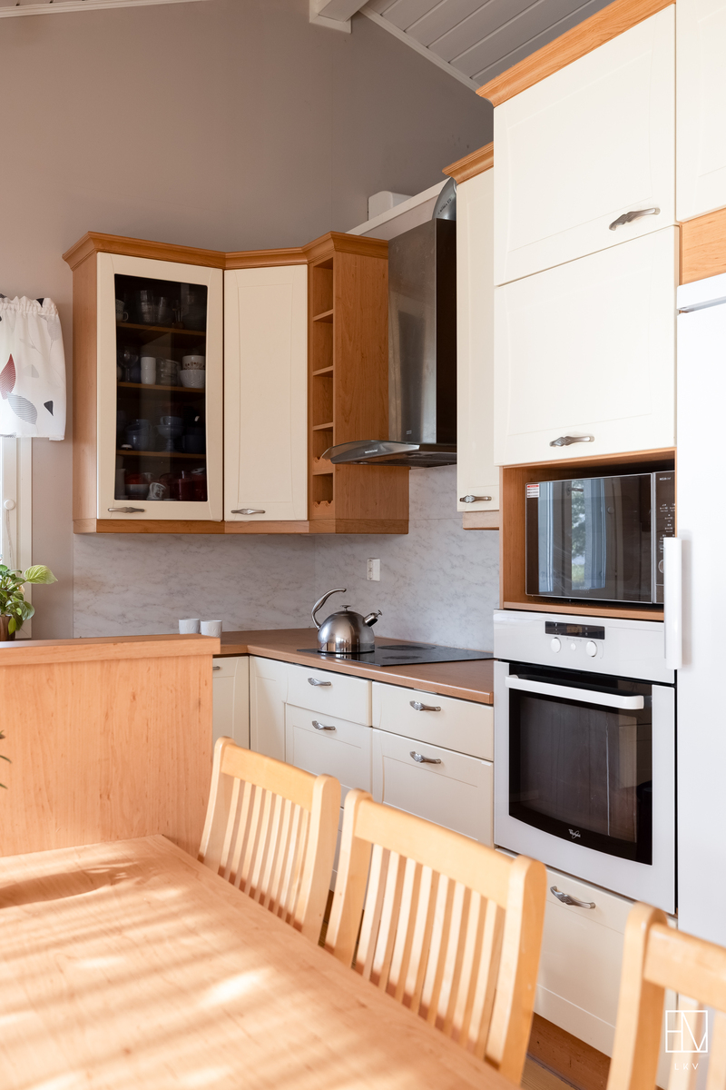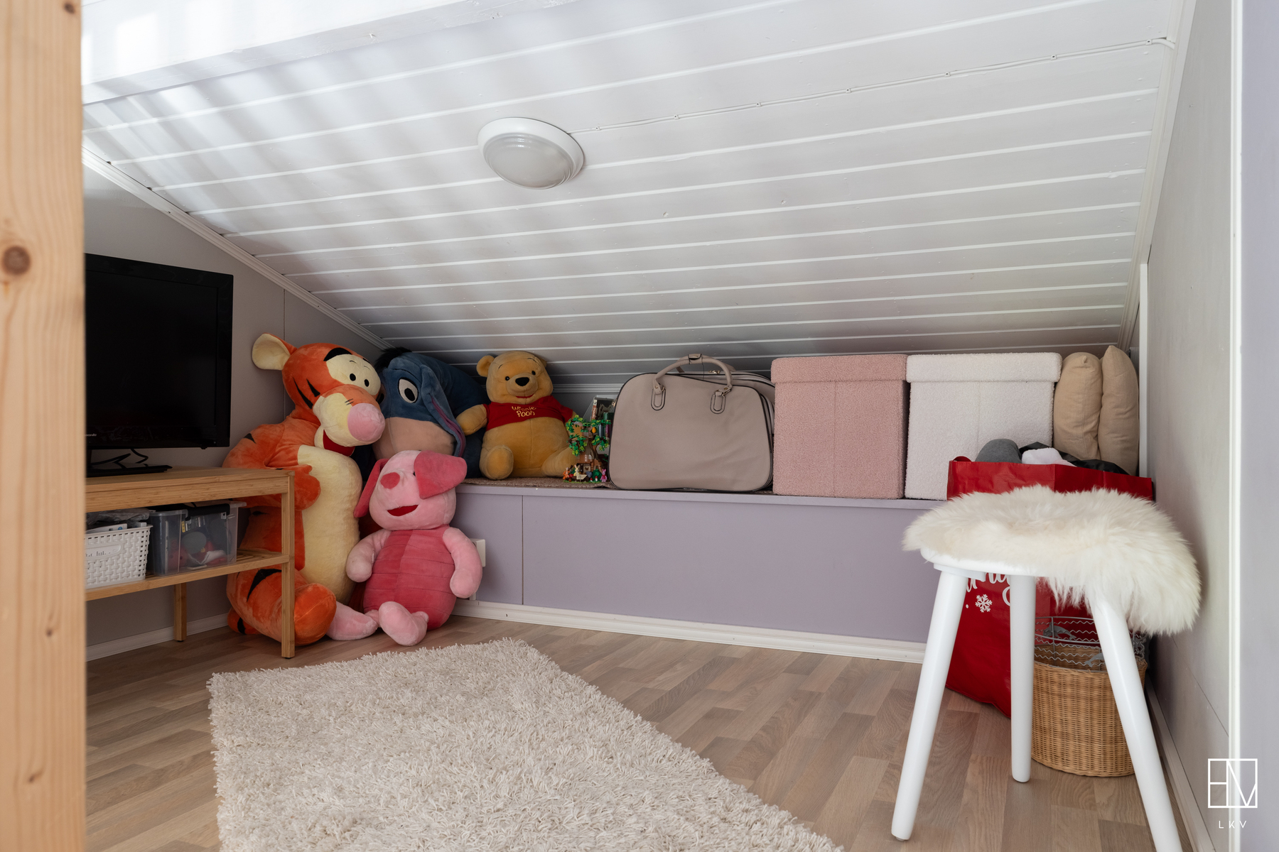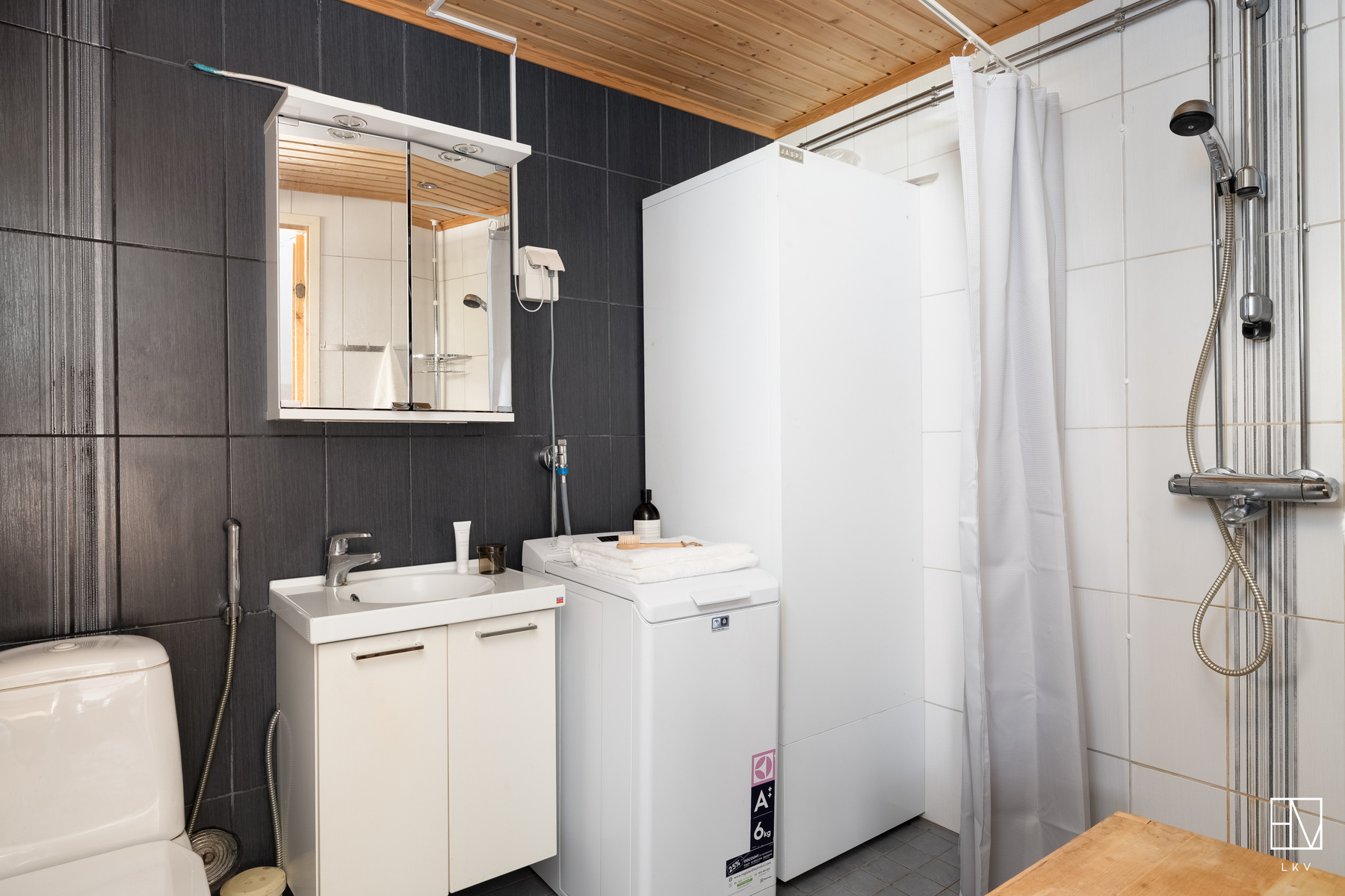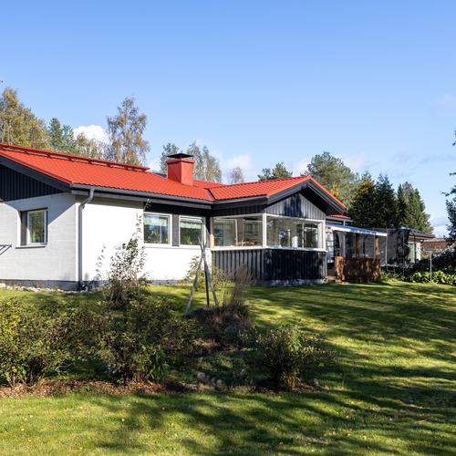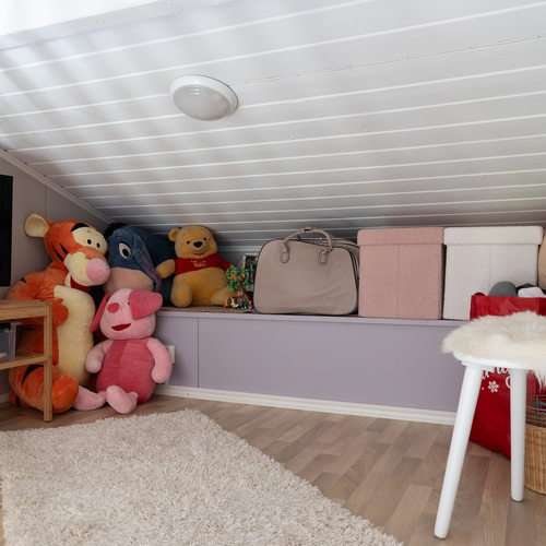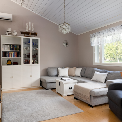 Avara olohuone ja ruokailutila yhdistyvät saumattomasti suureen keittiöön, jossa on sekä leivinuuni että perinteinen puuhella – täydellinen yhdistelmä tunnelmaa ja käytännöllisyyttä. Olohuoneessa korkea viistokatto tuo tilaan ilmavuutta, ja ilmalämpöpumppu huolehtii asumismukavuudesta vuoden ympäri. Kaksi makuuhuoneista on varustettu käytännöllisillä makuuparvilla, jotka tarjoavat lisätilaa vaikkapa lasten leikkeihin, säilytykseen tai vierasmajoitukseen. Eteisessä on lisäksi reilun kokoinen vaatehuone, joka tuo arkeen kaivattua säilytystilaa ja tämän lisäksi kiinteistöllä on erillinen 20 m² ulkovarasto.