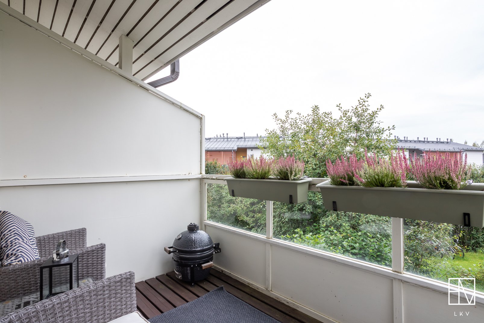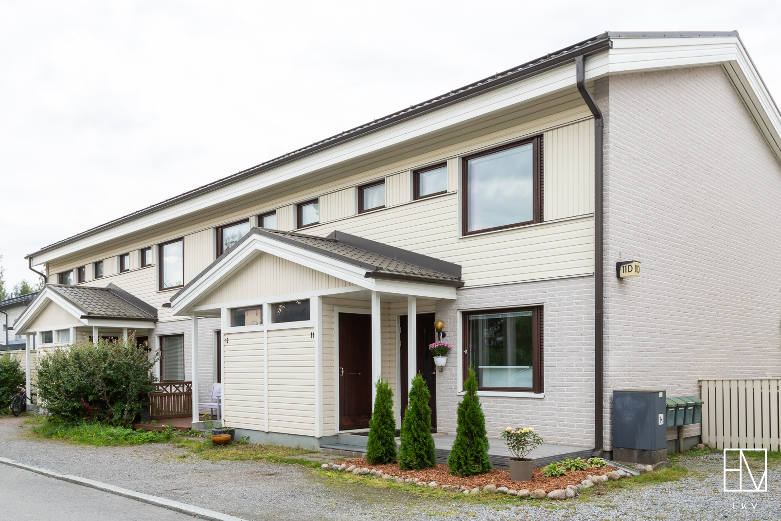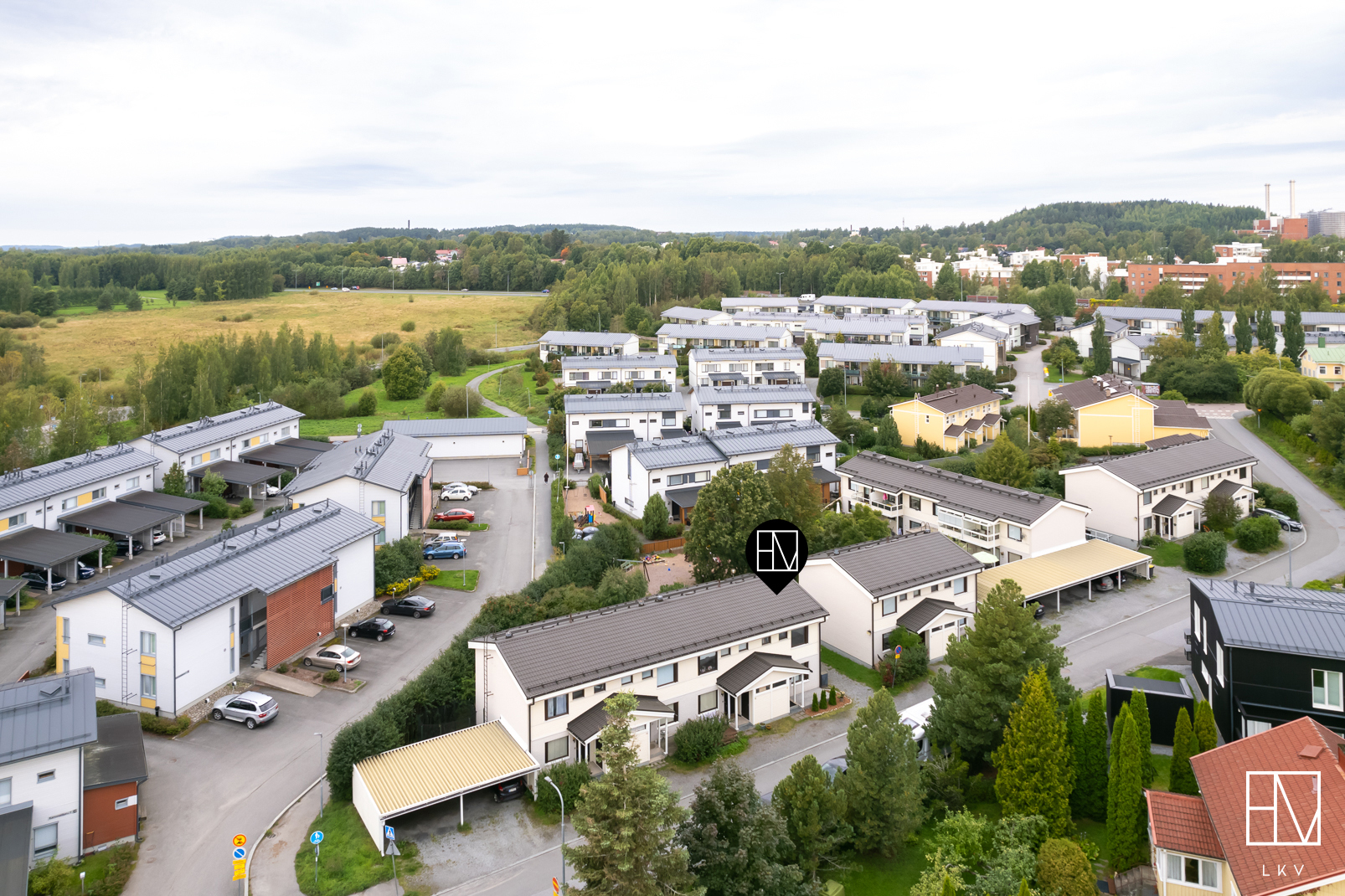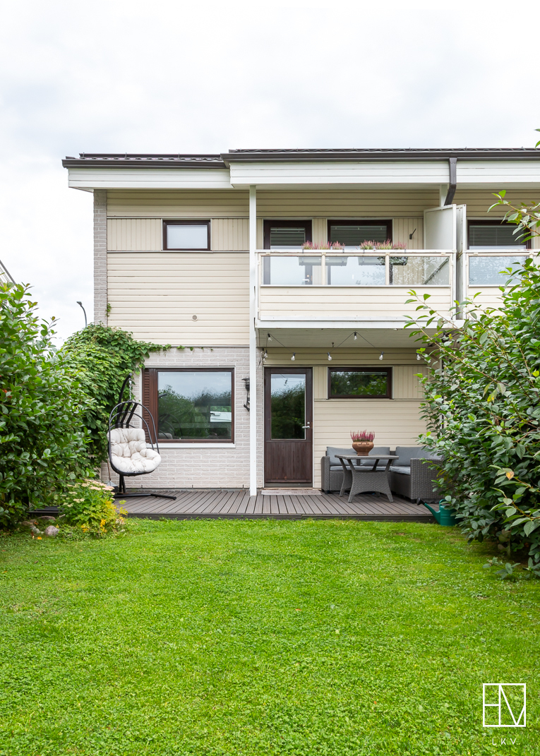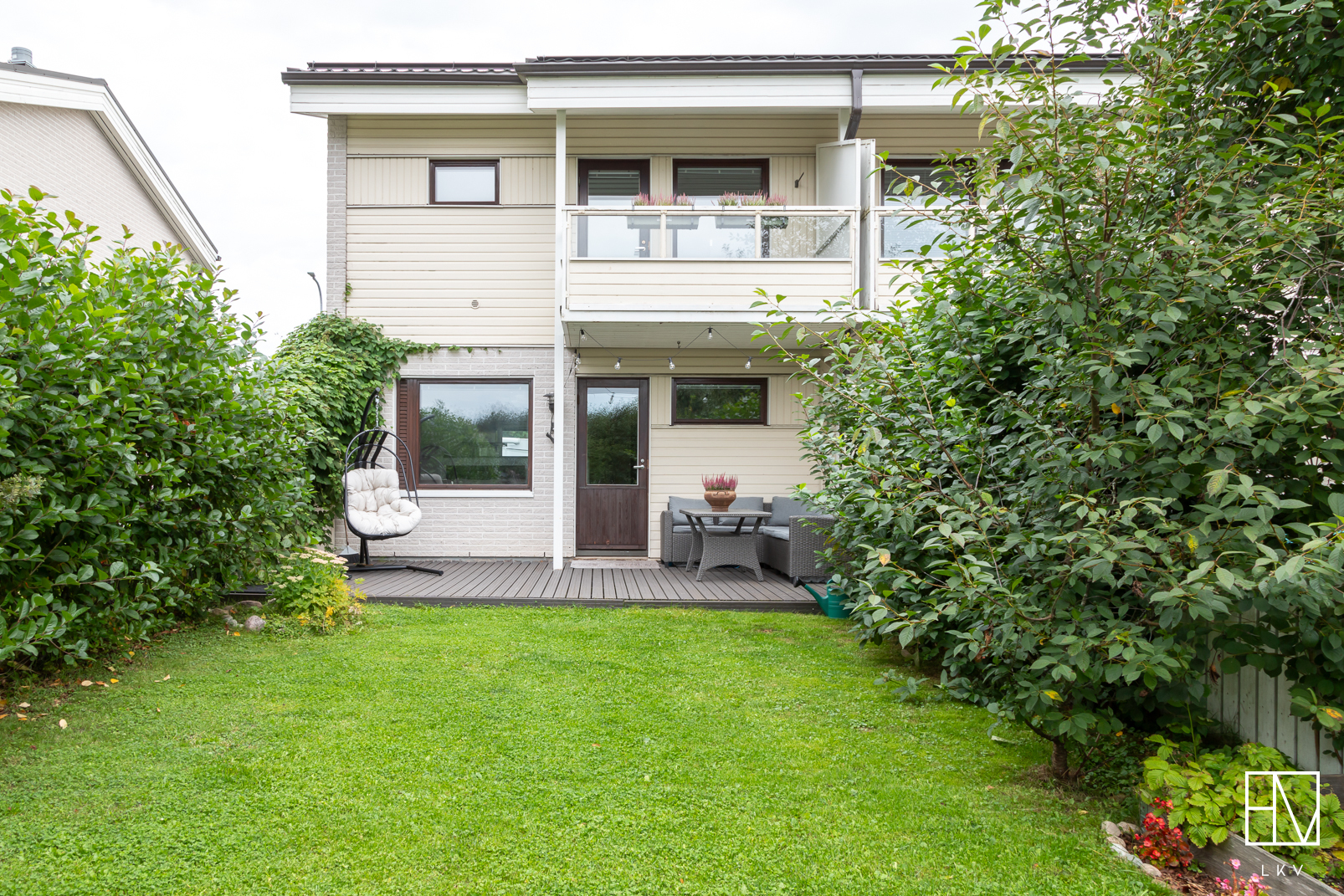 Tämä rivitaloasunto Hyhkystä jakautuu kahteen kerrokseen. Sisään tullaan alakertaan, josta löytyvät eteisen lisäksi erillinen wc, vaatehuone sekä keittiö ja olohuone. Keittiö on tilava L-mallin ratkaisu, josta löytyy paljon kaappi- ja laskutilaa. Tila on yhtenäistä olohuoneen kanssa. Olohuoneen katseenvangitsija on yhtä seinää koristava tyylikäs rimoitus. Tätä kautta on kulku myös terassille ja mukavan suojaisalle takapihalle. Yläkerrassa sijaitsevat asunnon kaksi makuuhuonetta sekä pesutilat ja sauna. Toisessa makuuhuoneessa on lisäksi parveke.