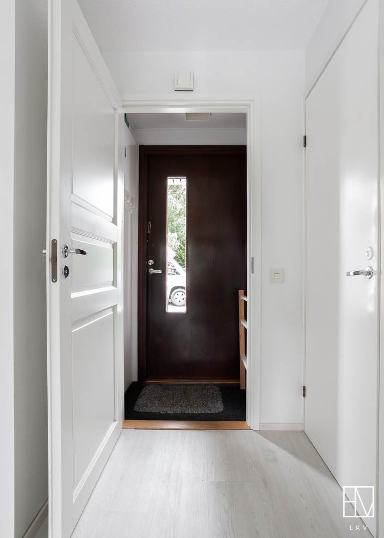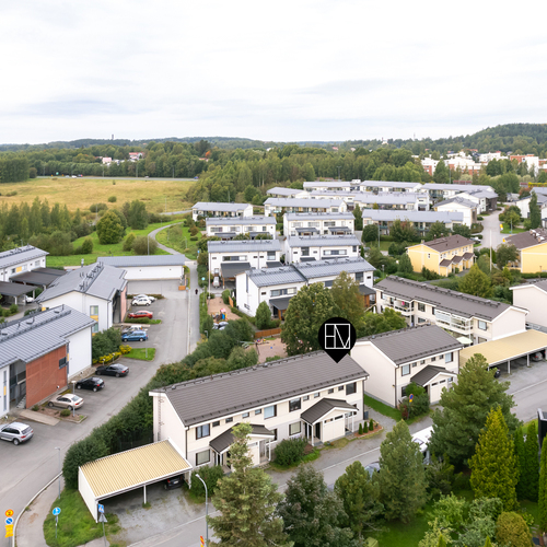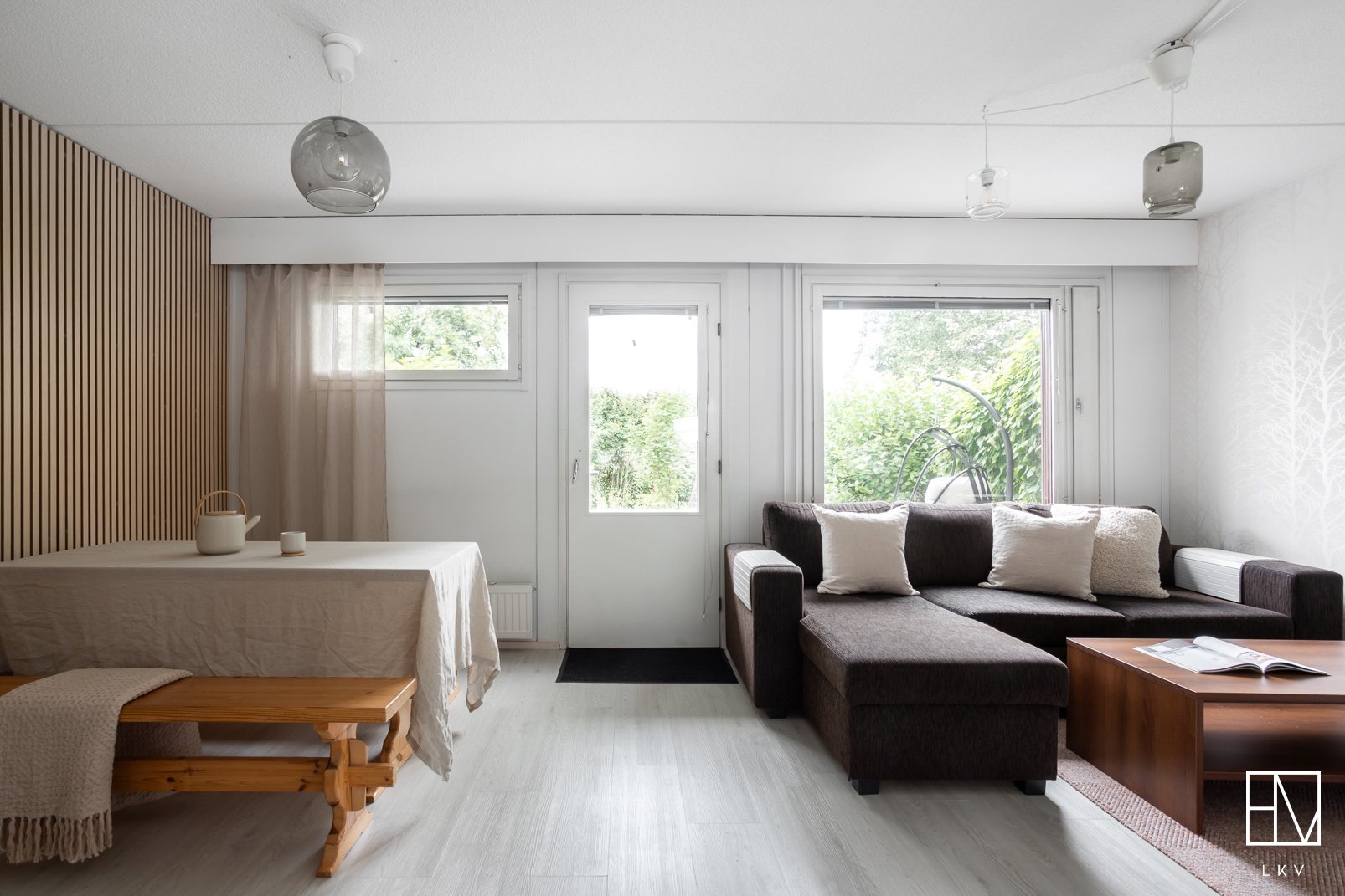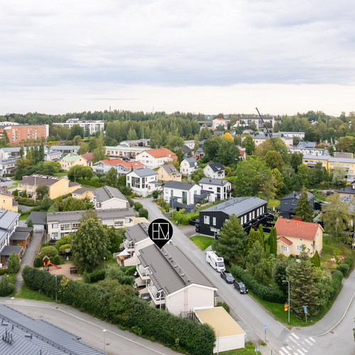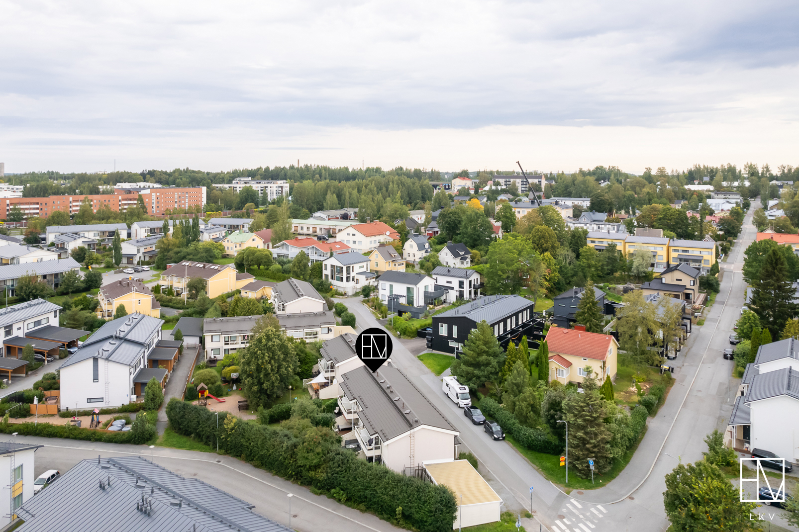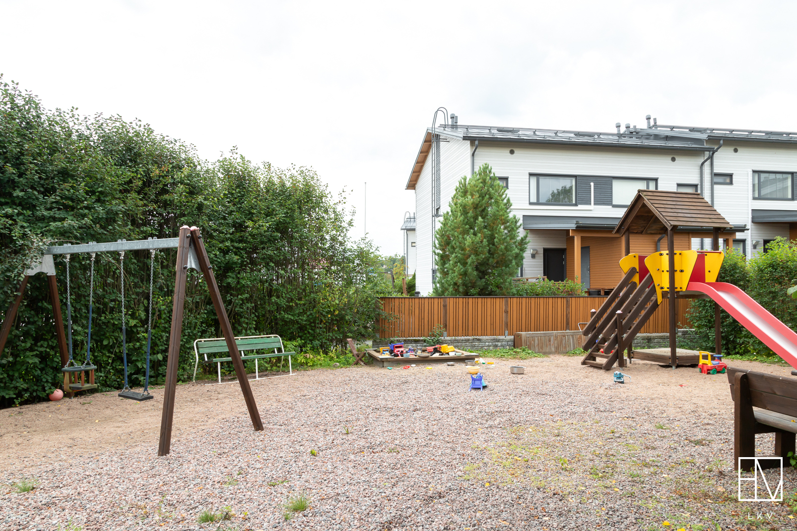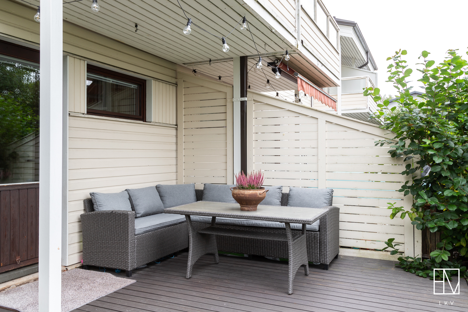 Tämä rivitaloasunto Hyhkystä jakautuu kahteen kerrokseen. Sisään tullaan alakertaan, josta löytyvät eteisen lisäksi erillinen wc, vaatehuone sekä keittiö ja olohuone. Keittiö on tilava L-mallin ratkaisu, josta löytyy paljon kaappi- ja laskutilaa. Tila on yhtenäistä olohuoneen kanssa. Olohuoneen katseenvangitsija on yhtä seinää koristava tyylikäs rimoitus. Tätä kautta on kulku myös terassille ja mukavan suojaisalle takapihalle. Yläkerrassa sijaitsevat asunnon kaksi makuuhuonetta sekä pesutilat ja sauna. Toisessa makuuhuoneessa on lisäksi parveke.