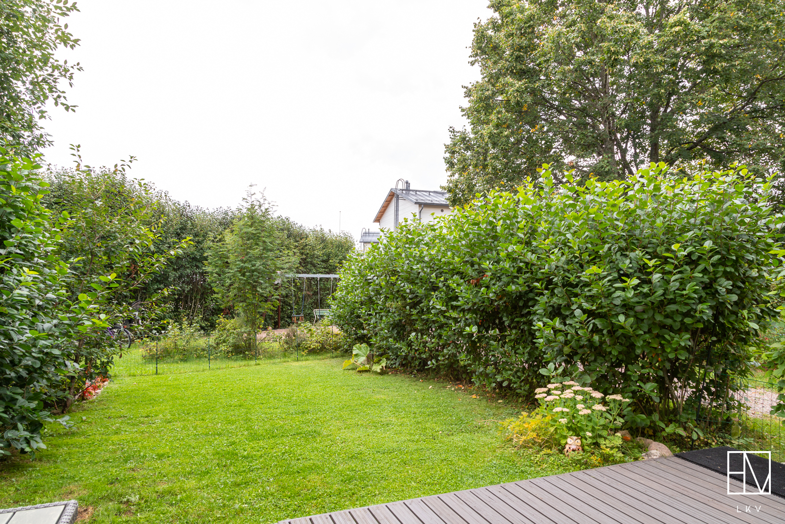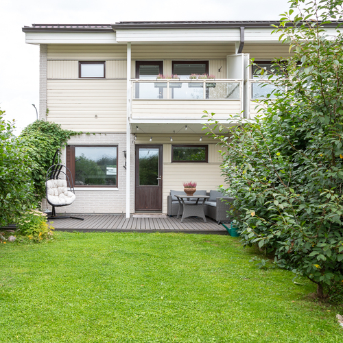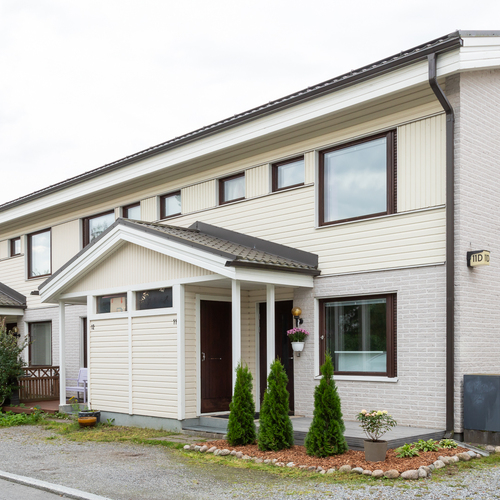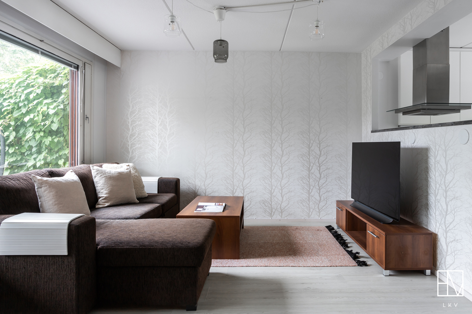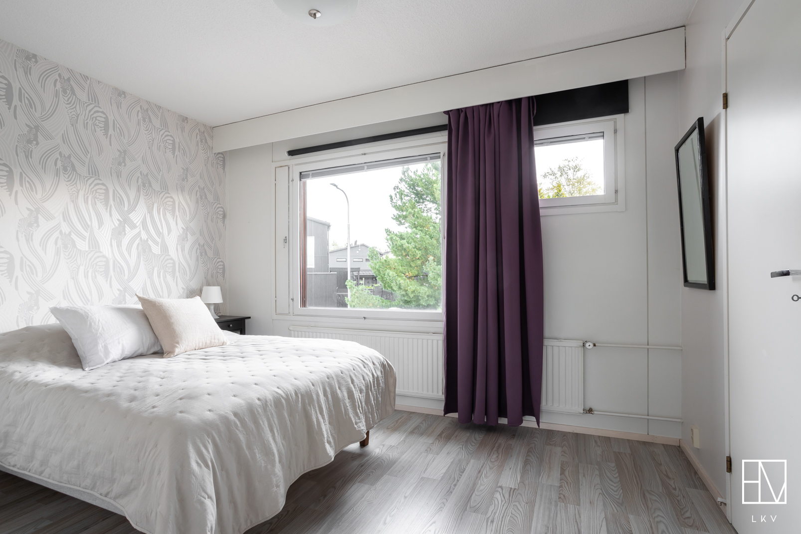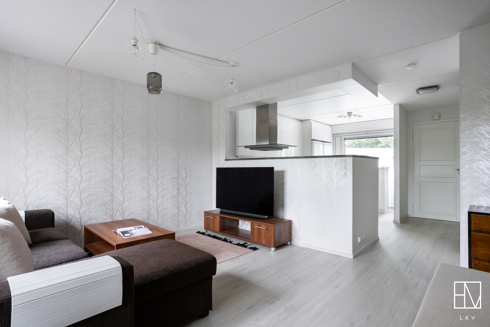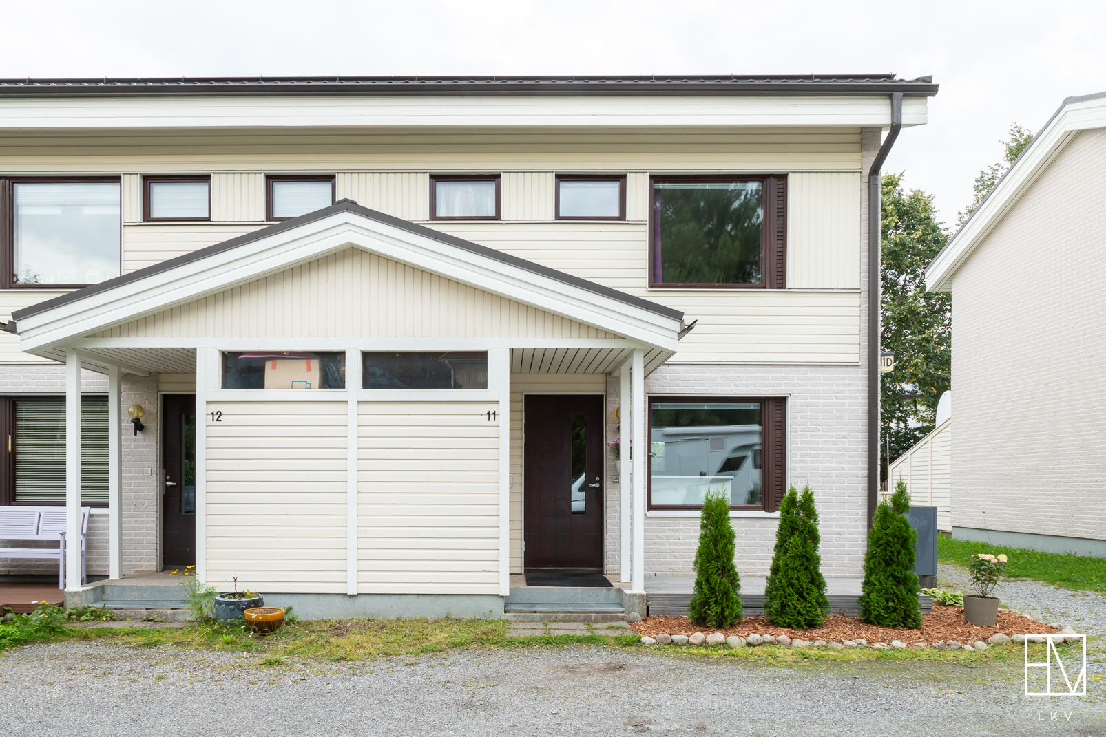 Tämä rivitaloasunto Hyhkystä jakautuu kahteen kerrokseen. Sisään tullaan alakertaan, josta löytyvät eteisen lisäksi erillinen wc, vaatehuone sekä keittiö ja olohuone. Keittiö on tilava L-mallin ratkaisu, josta löytyy paljon kaappi- ja laskutilaa. Tila on yhtenäistä olohuoneen kanssa. Olohuoneen katseenvangitsija on yhtä seinää koristava tyylikäs rimoitus. Tätä kautta on kulku myös terassille ja mukavan suojaisalle takapihalle. Yläkerrassa sijaitsevat asunnon kaksi makuuhuonetta sekä pesutilat ja sauna. Toisessa makuuhuoneessa on lisäksi parveke.