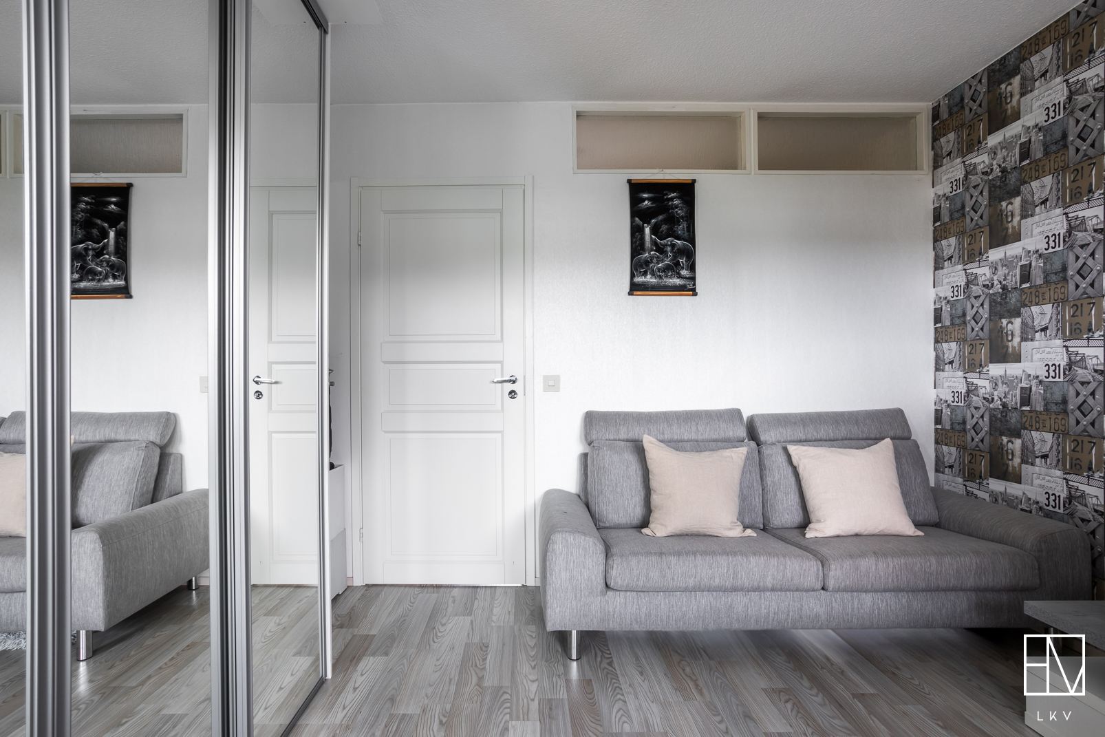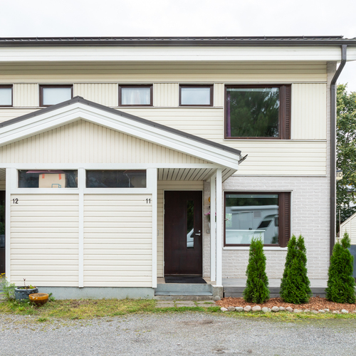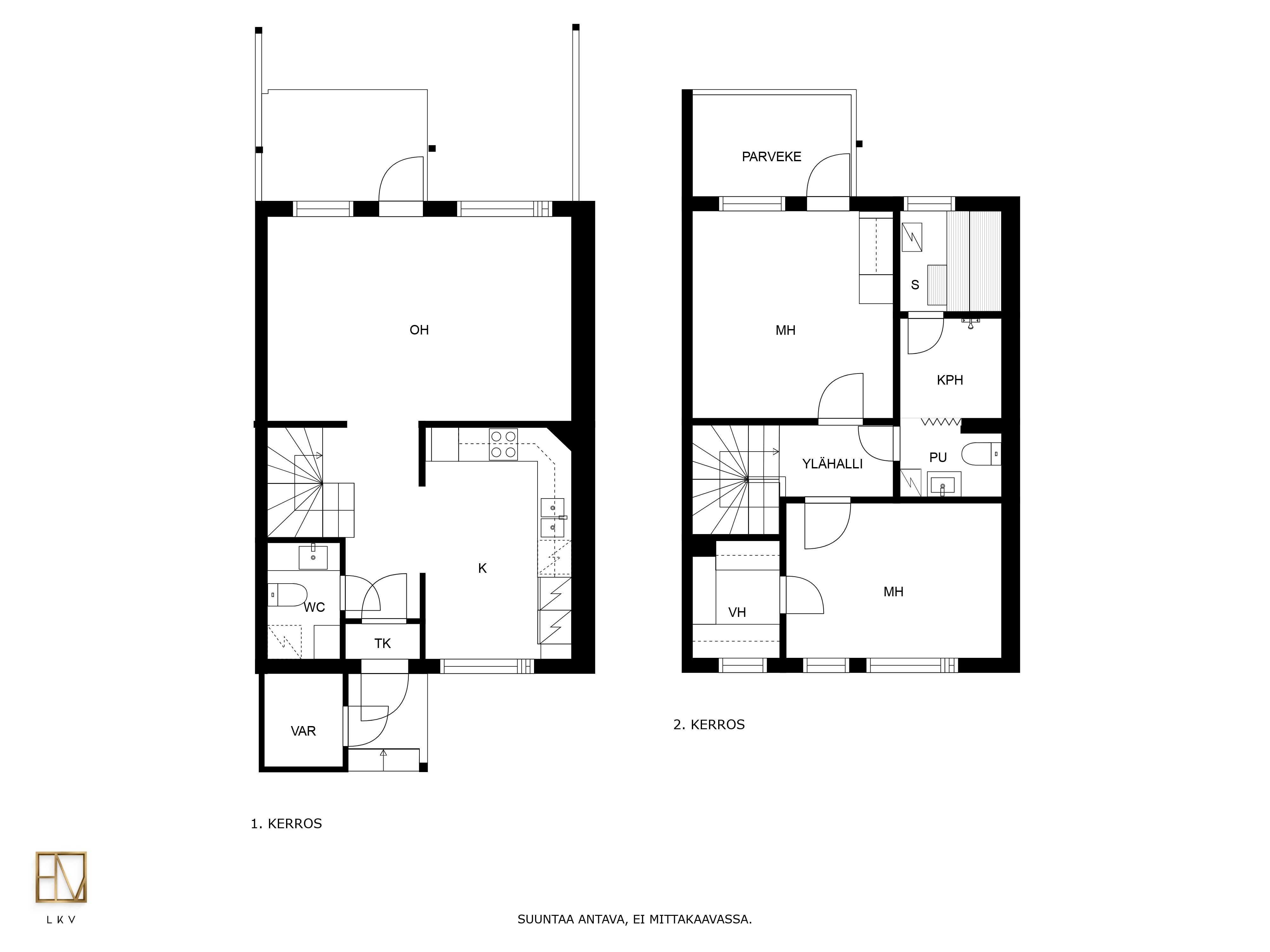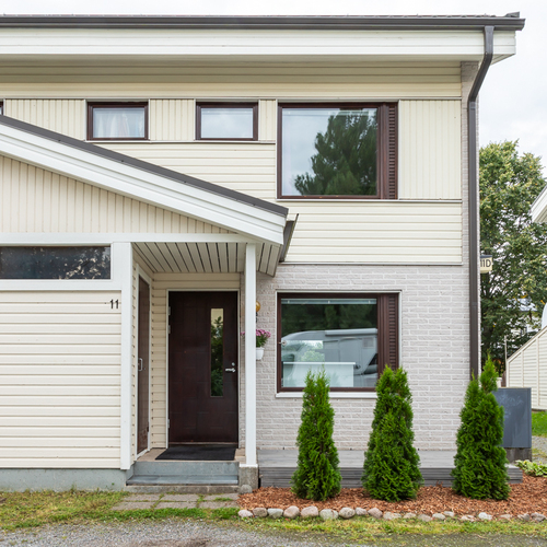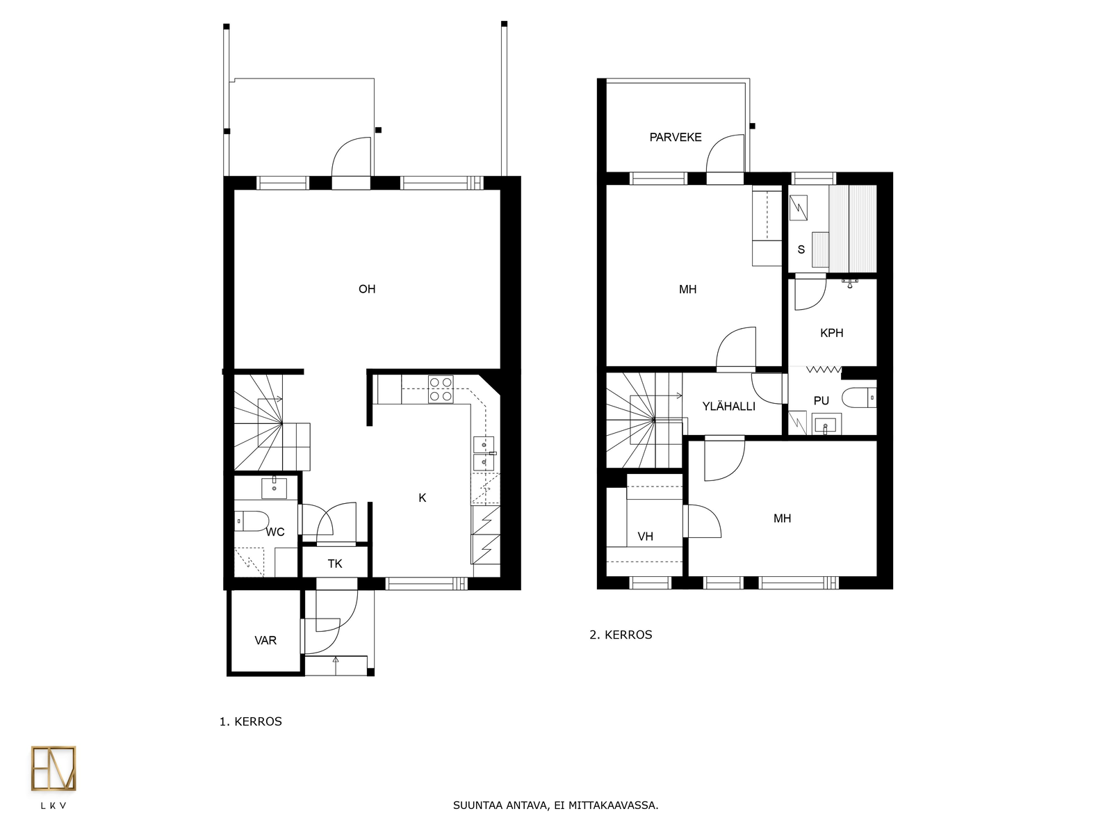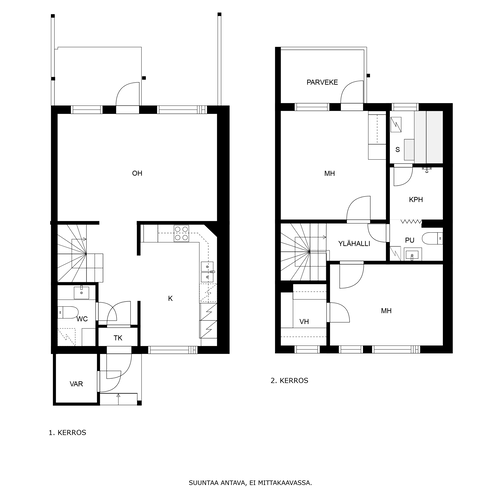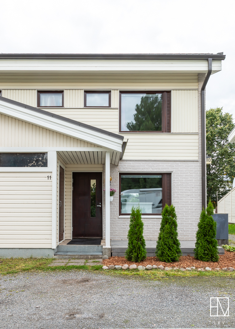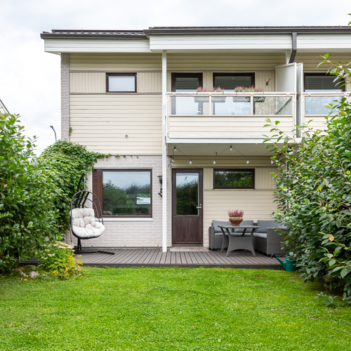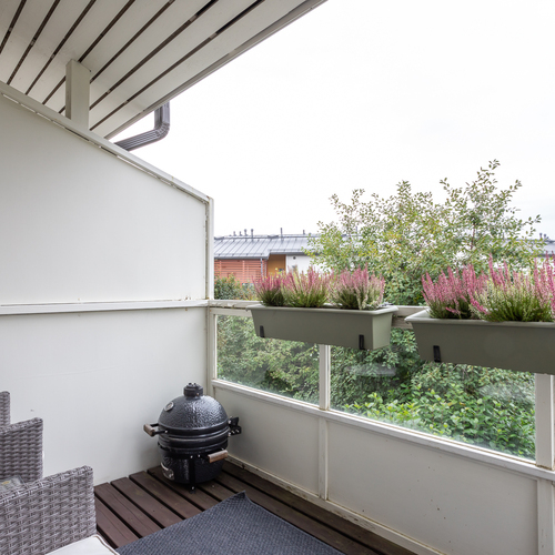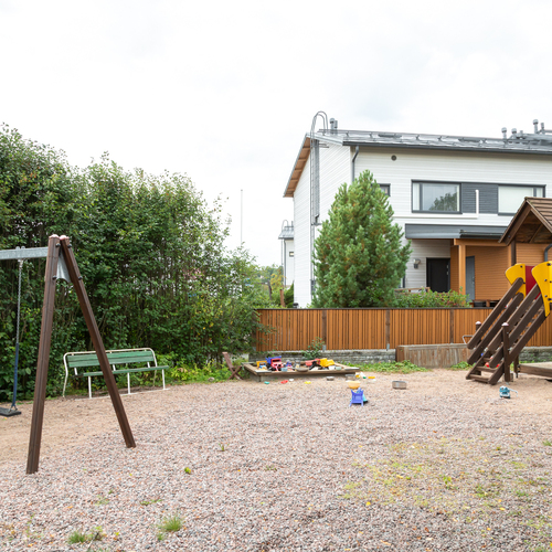 Tämä rivitaloasunto Hyhkystä jakautuu kahteen kerrokseen. Sisään tullaan alakertaan, josta löytyvät eteisen lisäksi erillinen wc, vaatehuone sekä keittiö ja olohuone. Keittiö on tilava L-mallin ratkaisu, josta löytyy paljon kaappi- ja laskutilaa. Tila on yhtenäistä olohuoneen kanssa. Olohuoneen katseenvangitsija on yhtä seinää koristava tyylikäs rimoitus. Tätä kautta on kulku myös terassille ja mukavan suojaisalle takapihalle. Yläkerrassa sijaitsevat asunnon kaksi makuuhuonetta sekä pesutilat ja sauna. Toisessa makuuhuoneessa on lisäksi parveke.