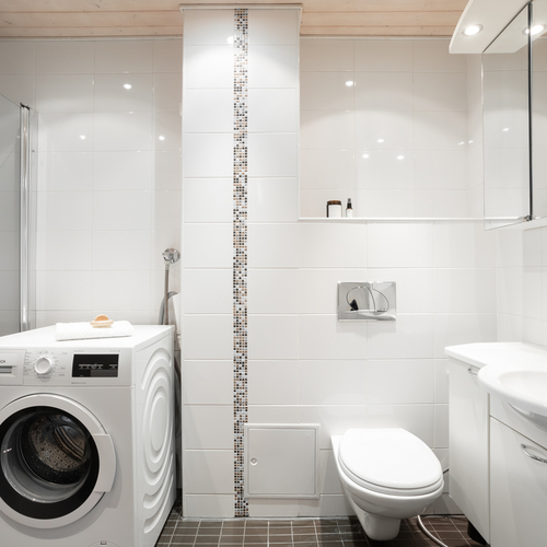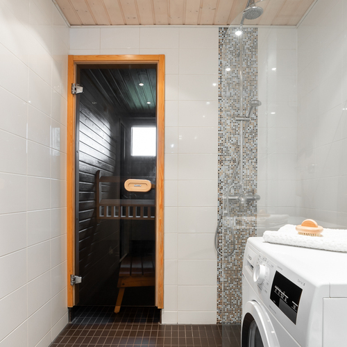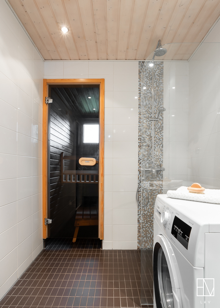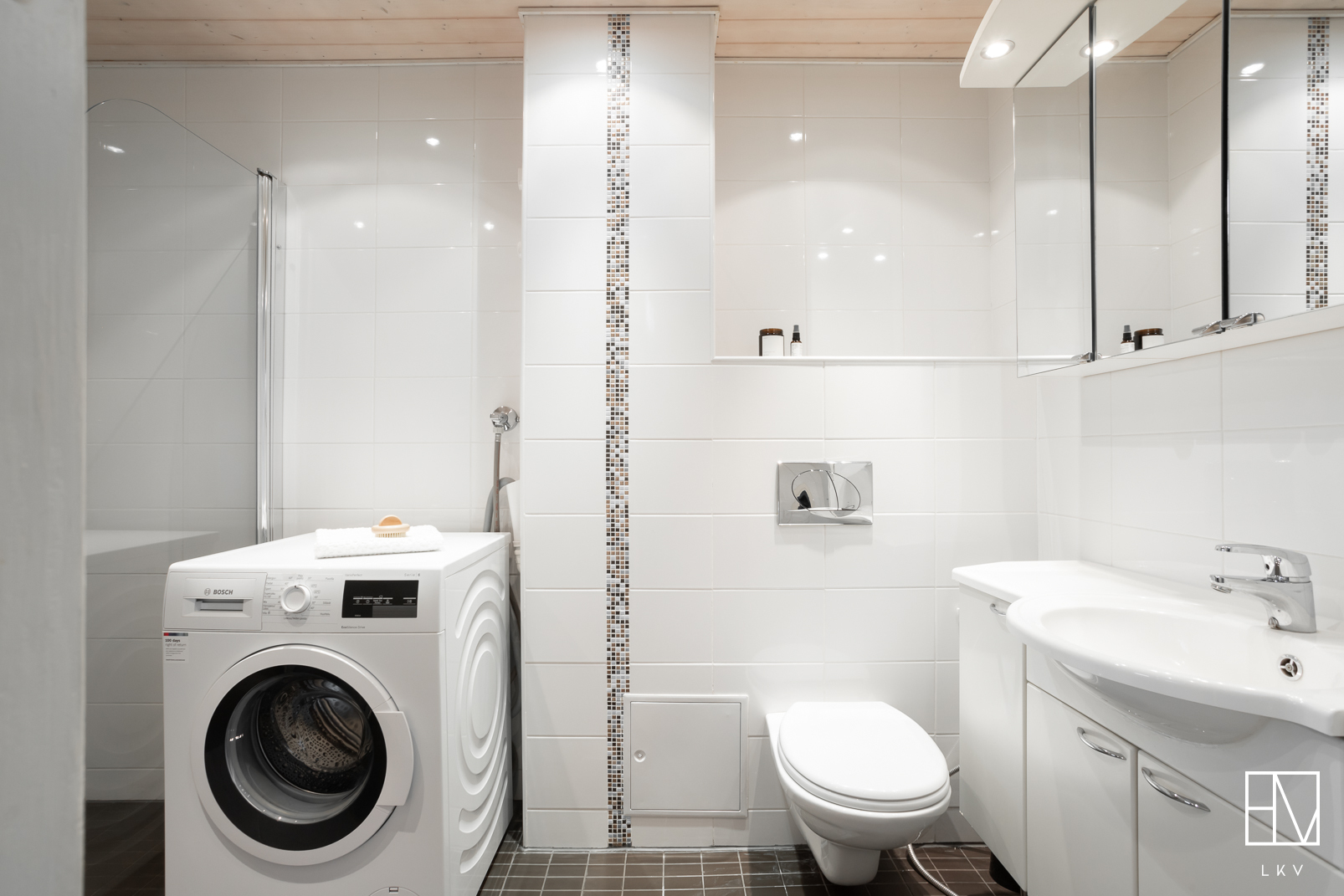 Varusteet: suihkuseinä, pesukoneliitäntä, lattialämmitys, wc-istuin, suihku, kiinteät valaisimet, kylpyhuonekaapisto