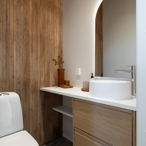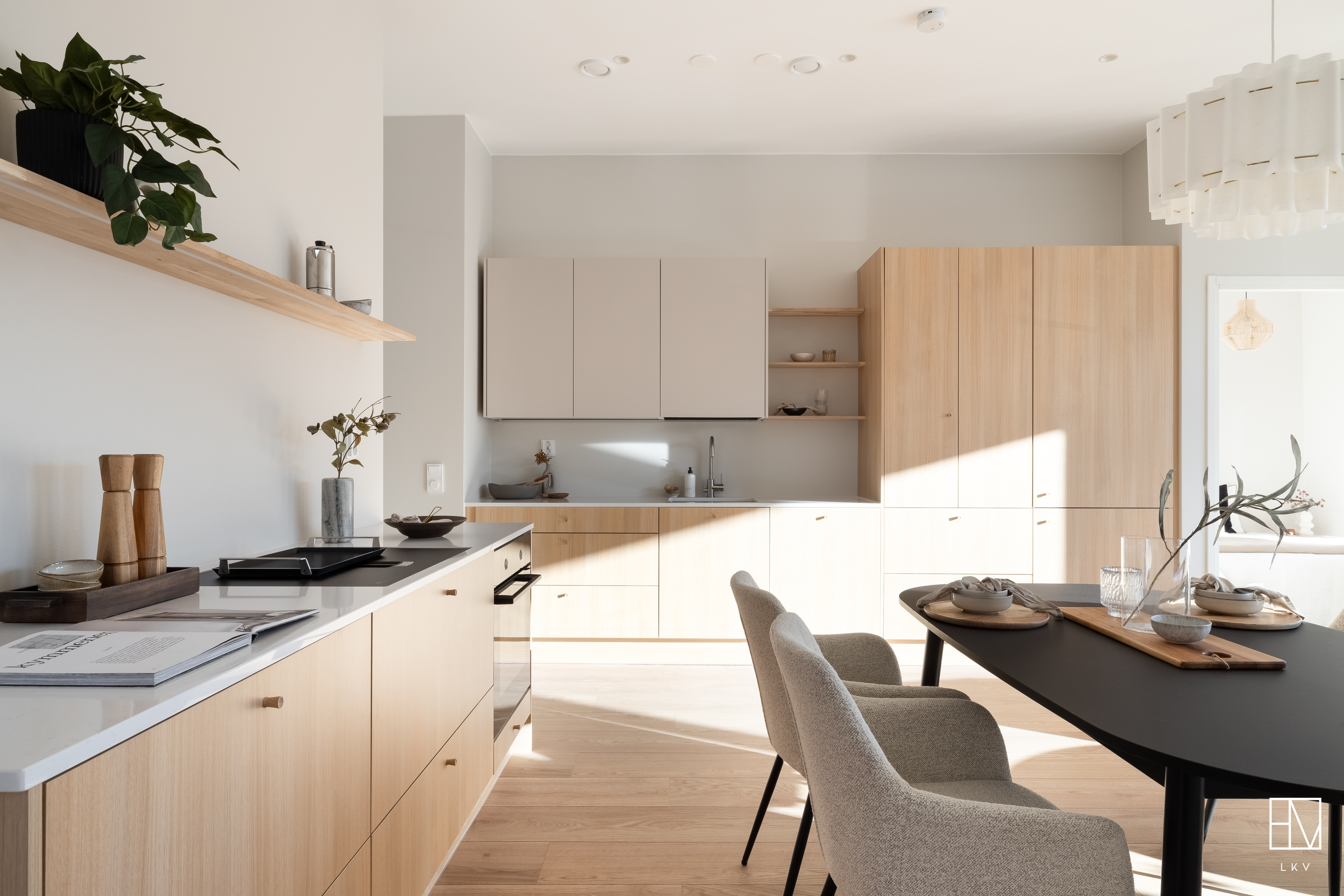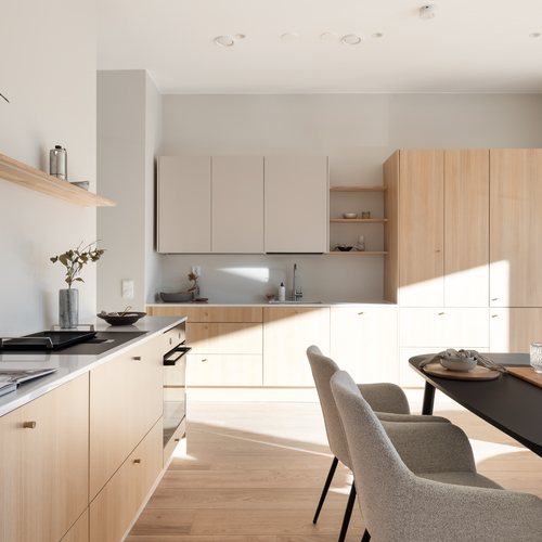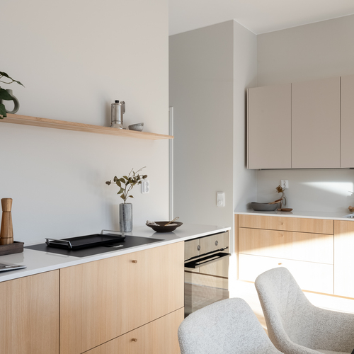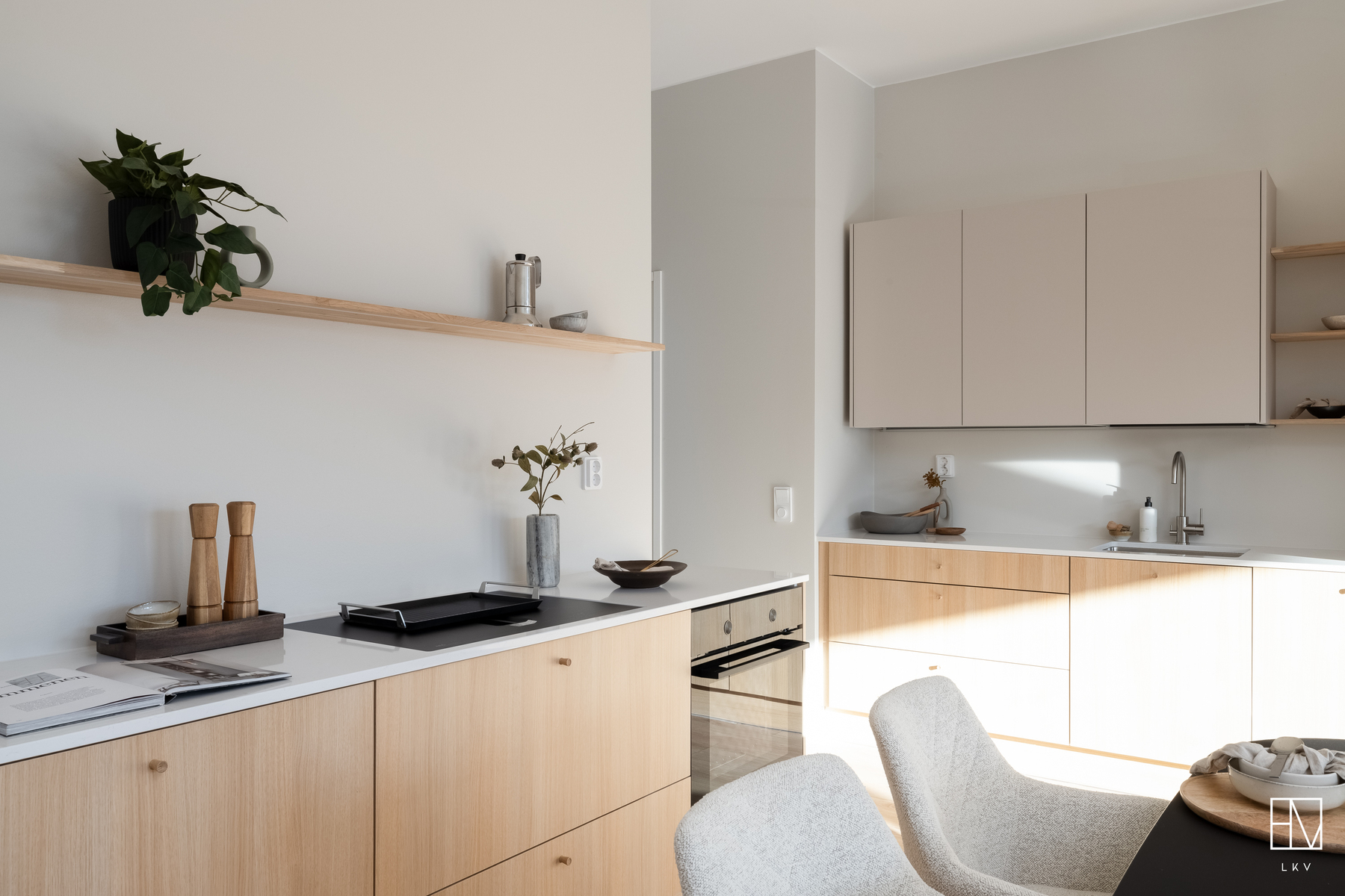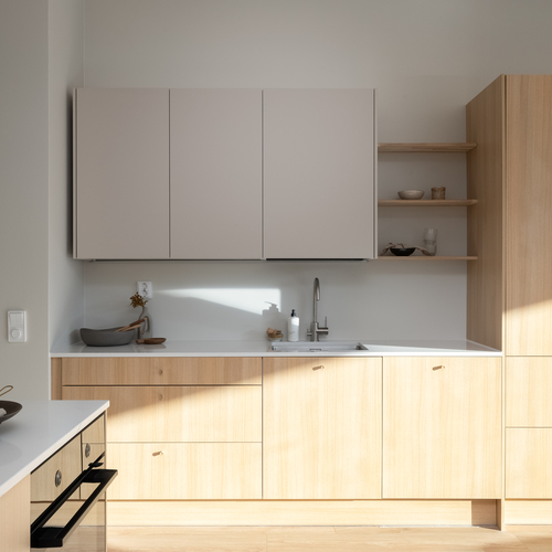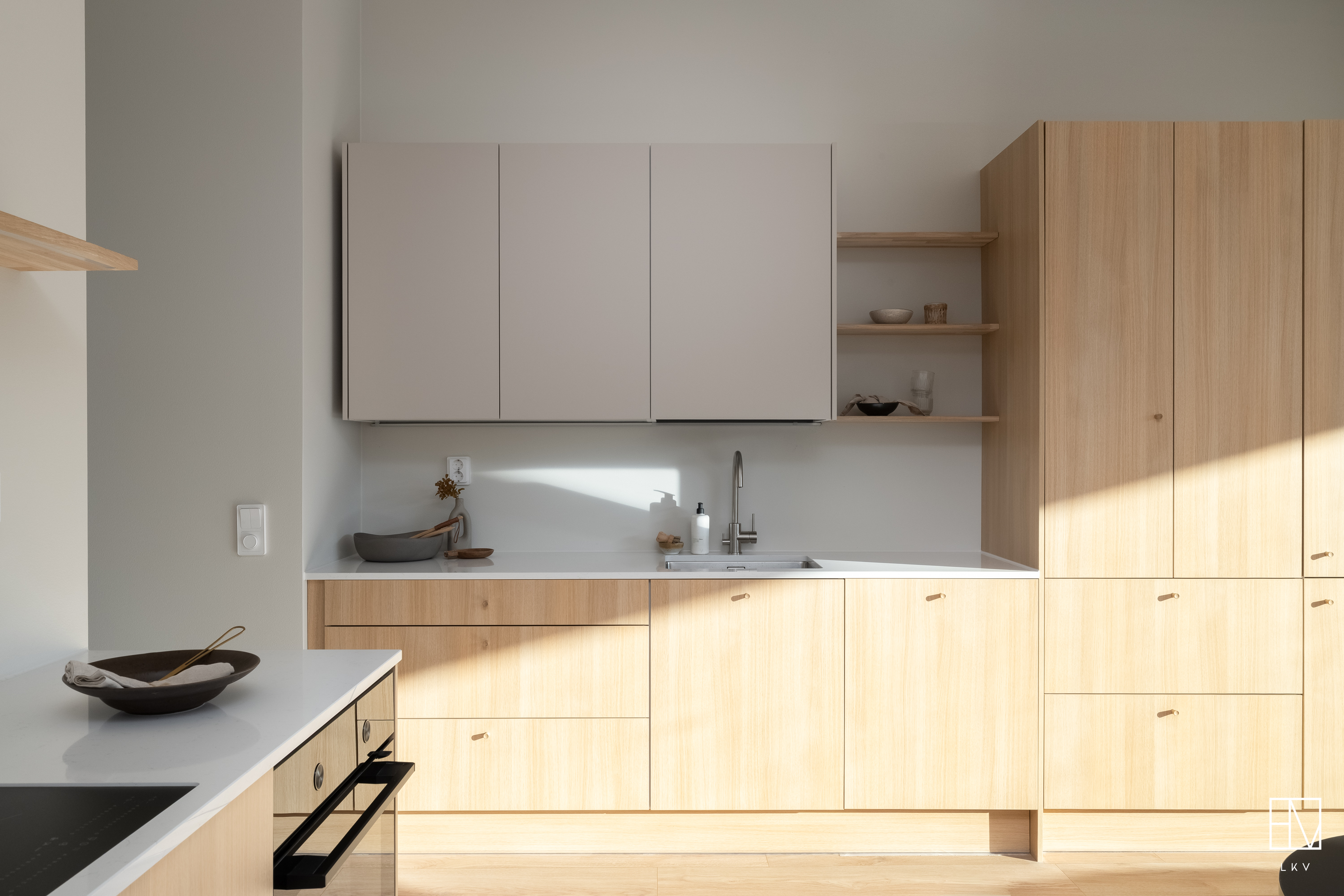 Tyylikäs tammen sävyinen Puustellinen keittiö, kvartsitaso ja rosterinen allas ja hana. Aamiaiskaappi.