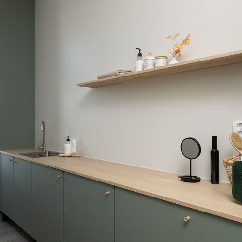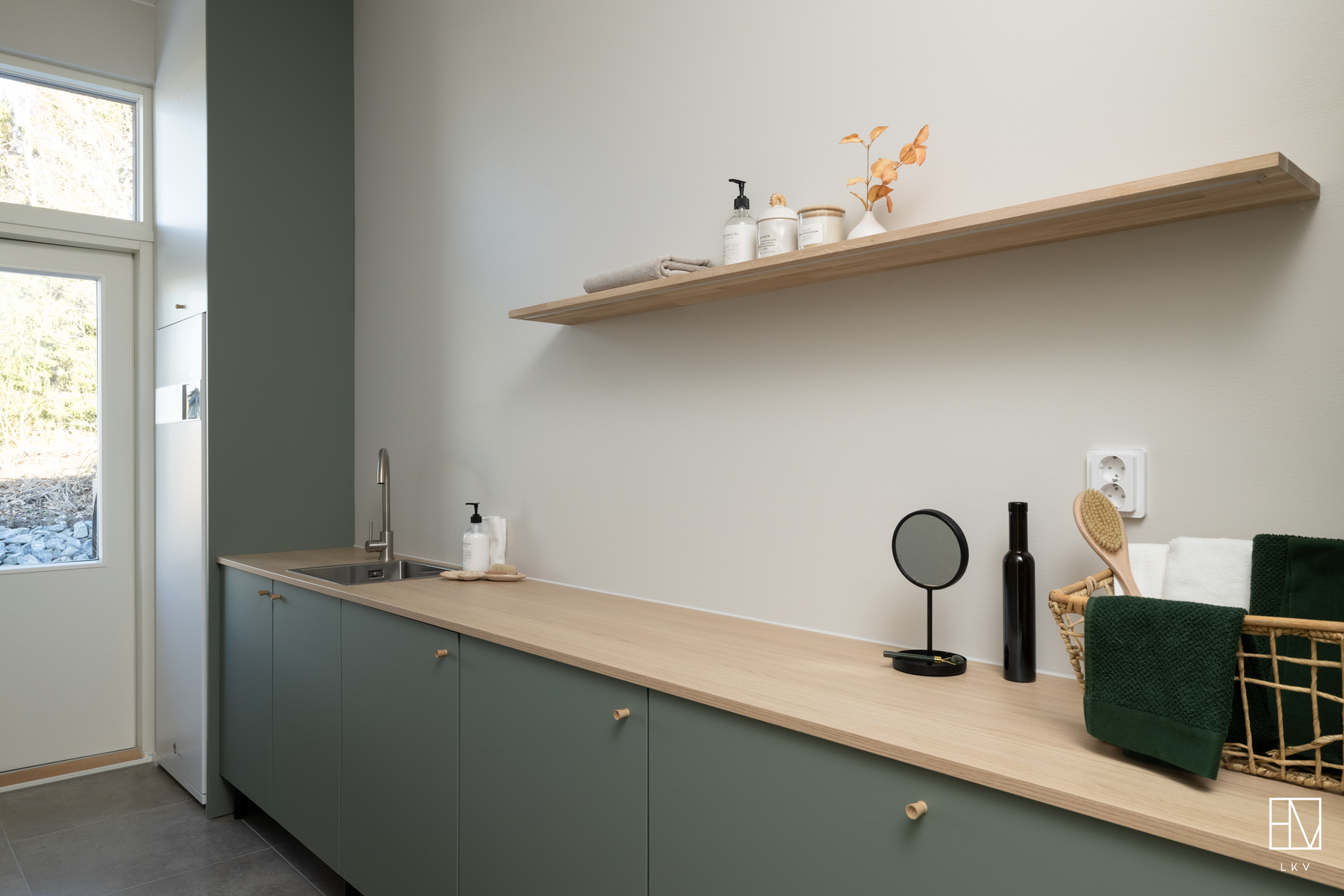 Tilavassa kodinhoitohuoneessa reilusti lasku- ja kaappitilaa. Pesuallas, paikka pesutornille ja lattia laattaa.