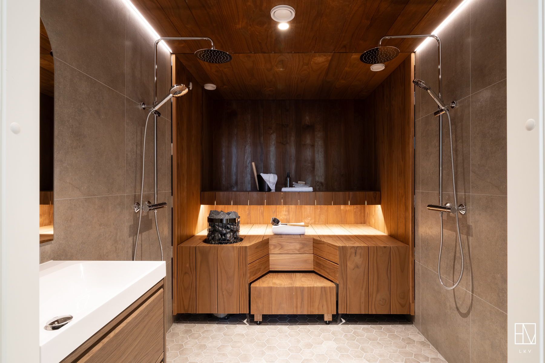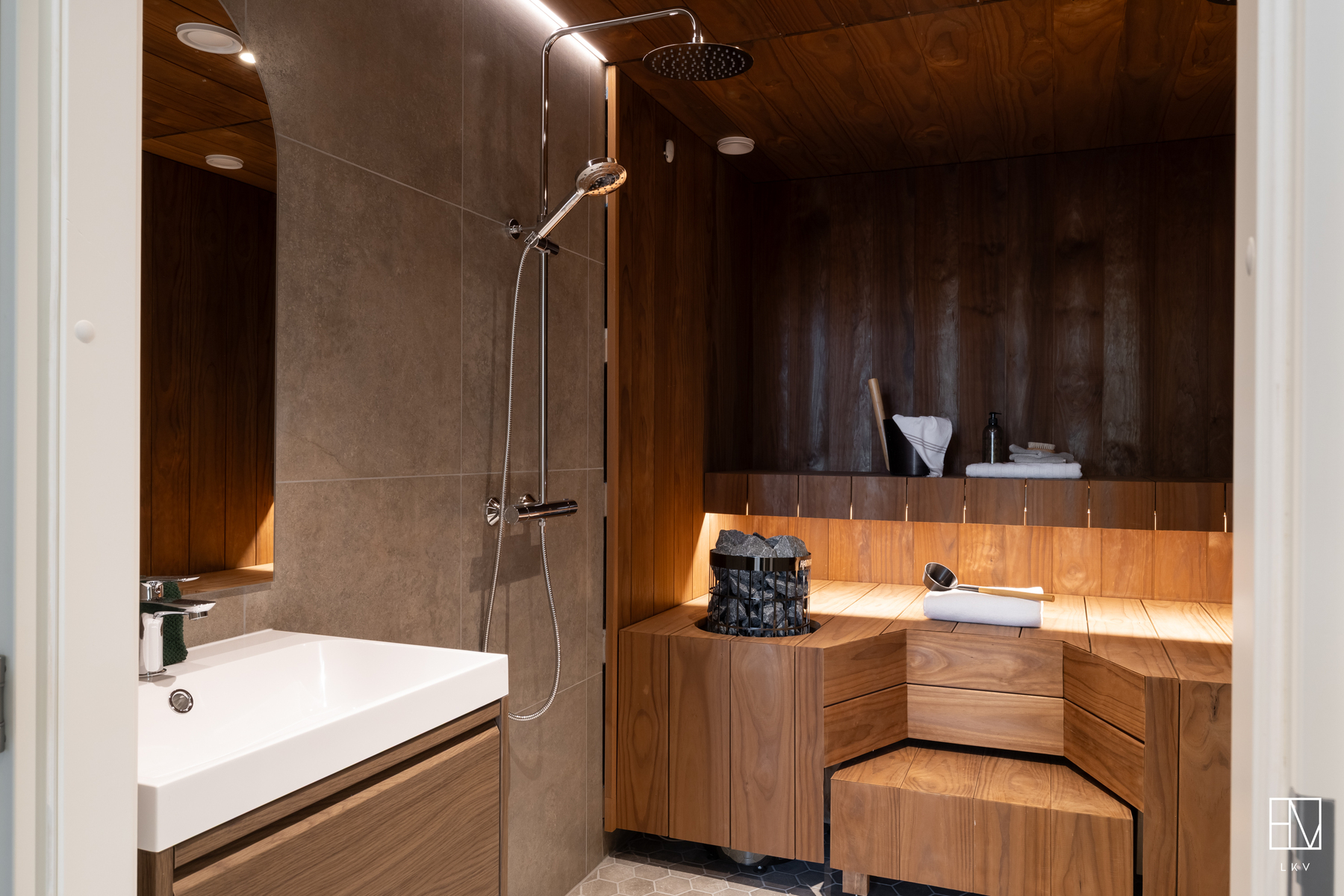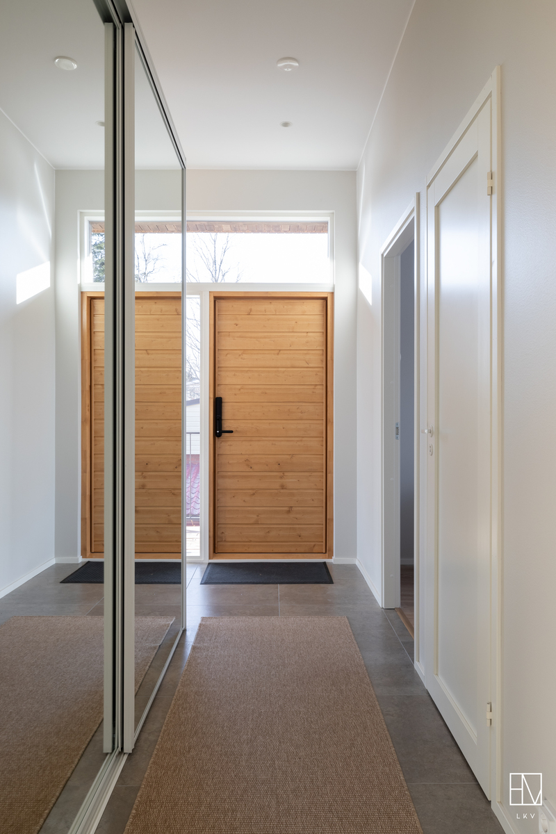 Jokaisessa makuuhuoneessa on myös kiinteät säilytyskaapistot. Lisää kaapistoja on myös eteisessä. Eteisen läheisyydessä on myös erillinen, asunnon toinen wc. Kodinhoitohuone on tilava ja sieltä pääsee suoraan ulos takapihalle. Näyttävässä kylpyhuoneessa hienot valaistukset, sadettajasuihkut, allaskaappi ja wc-istuin. Näyttävän lasiseinän takana tyylikäs sauna.