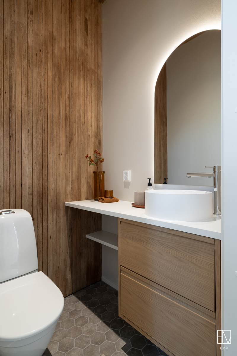 Tyylikkäässä kylpyhuoneessa seinät ja lattia laattaa. Kaksi sadettajasuihkua, wc-istuin, allaskaappi ja pesuallas. Suihkuseinät. Varustus: wc-istuin, kaksi suihkua, pesuallas.