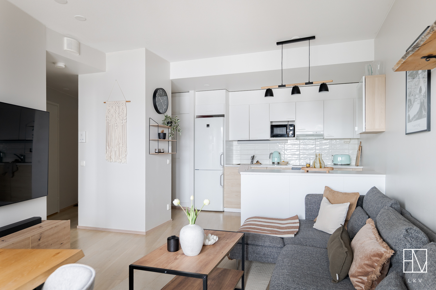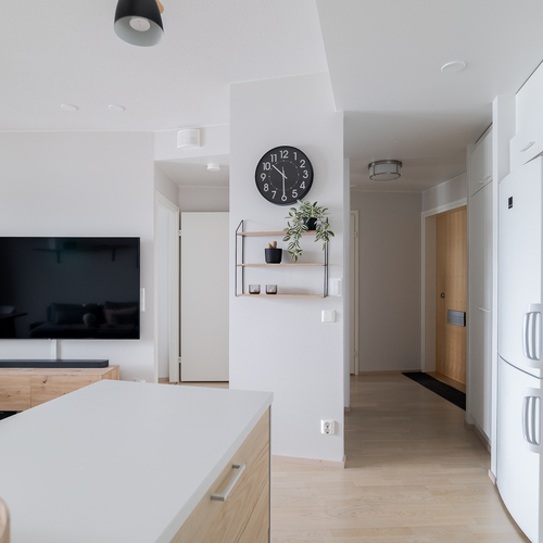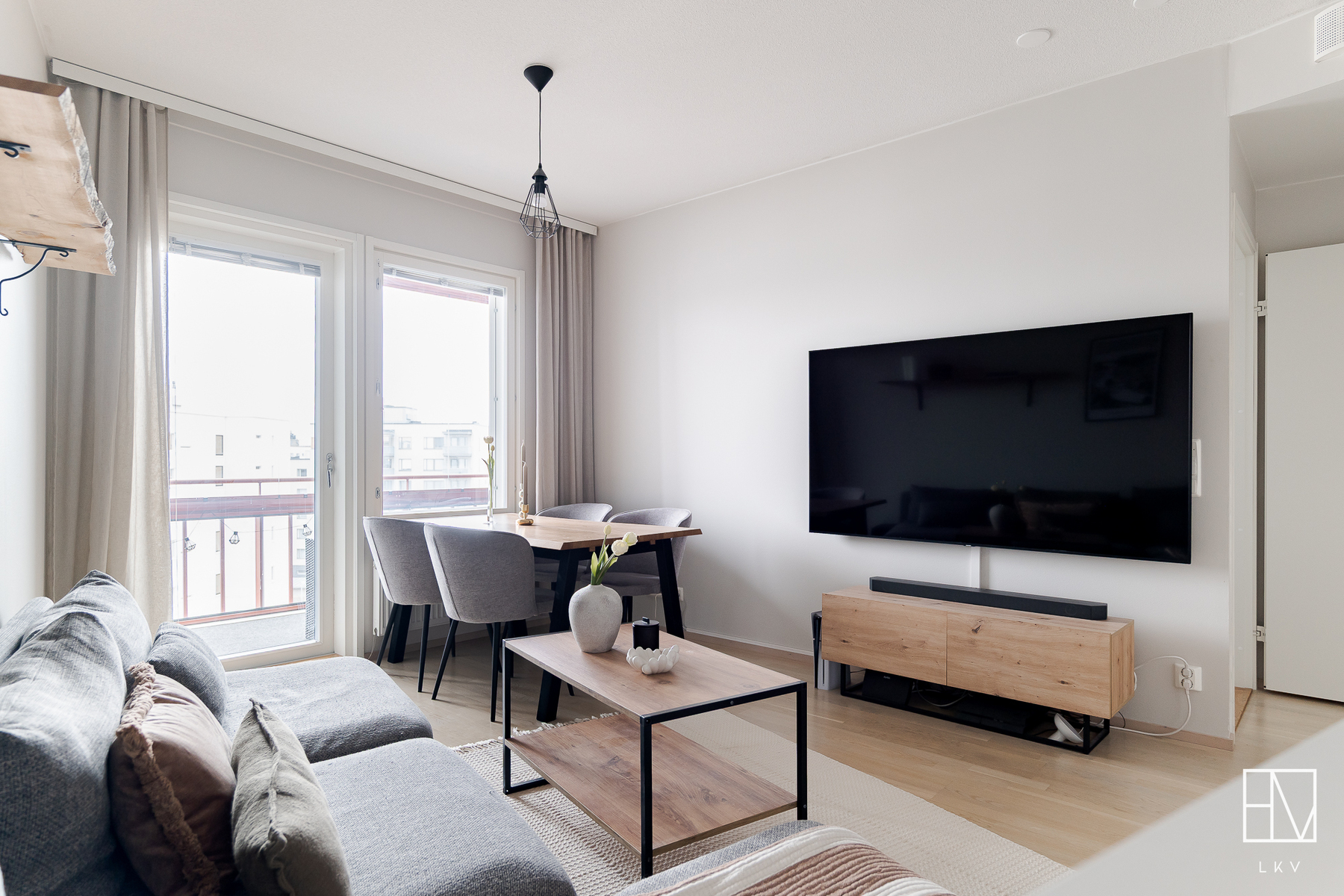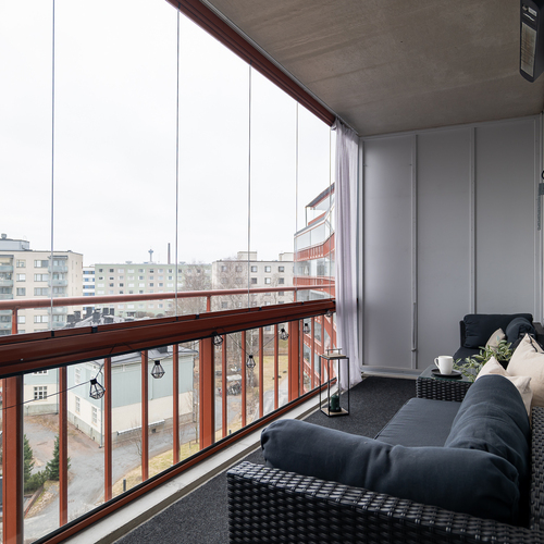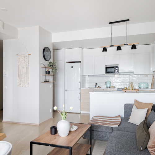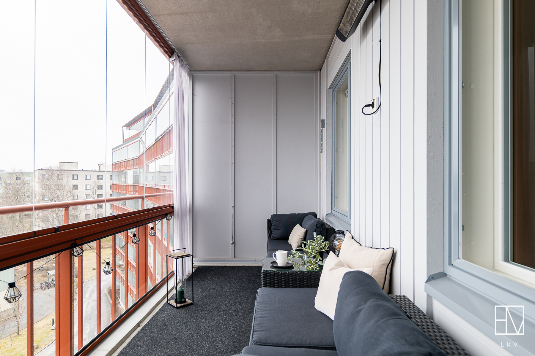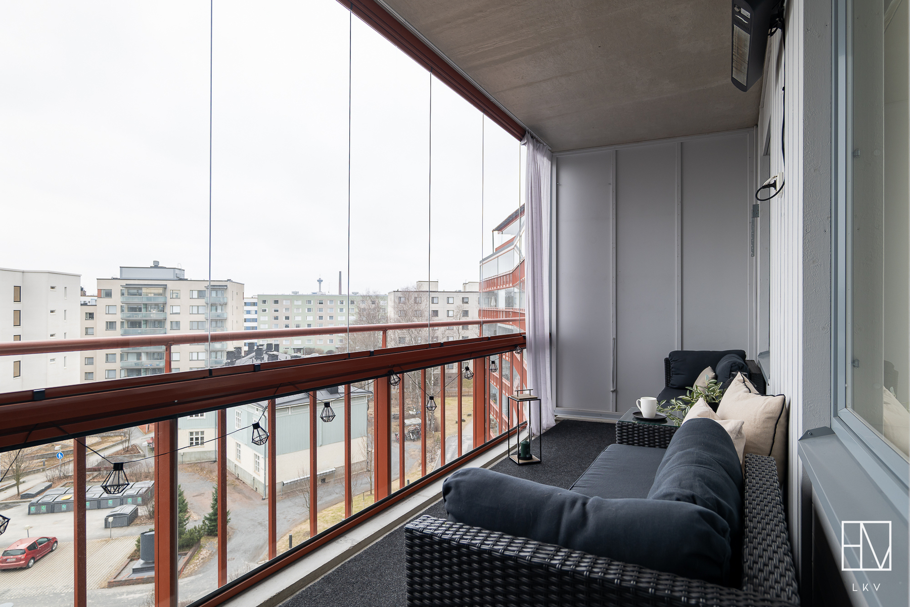 Asunnon sydämen muodostaa valoisa olohuoneen ja keittiön yhdistelmä, jossa tilaa on rytmitetty tyylikkäällä saarekkeella. Keittiö on remontoitu vuonna 2021, ja se tarjoaa erinomaiset puitteet niin arjen kokkailuun kuin vieraiden kestitsemiseen. Tilava kylpyhuone lisää asumismukavuutta, ja koko asunto on kauttaaltaan siistissä kunnossa, muuttovalmis ilman huolia. Iso lasitettu parveke sisäpihan suuntaan toimii lisähuoneena pitkälle syksyyn ja tarjoaa rauhallisen paikan nauttia näkymistä korkeuksista.