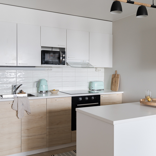 VARUSTUS: jääkaappi/pakastin, induktioliesi, erillisuuni, astianpesukone, liesituuletin, paikka mikrolle. Saareke.