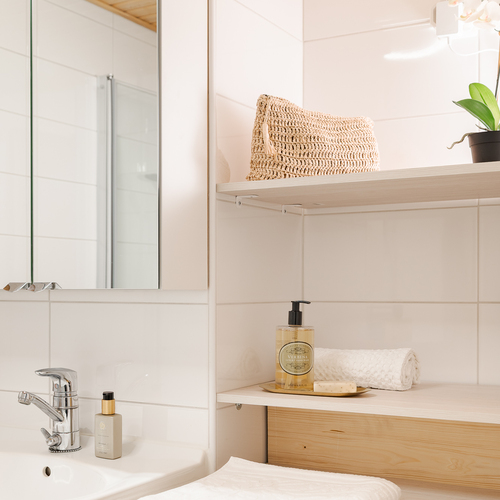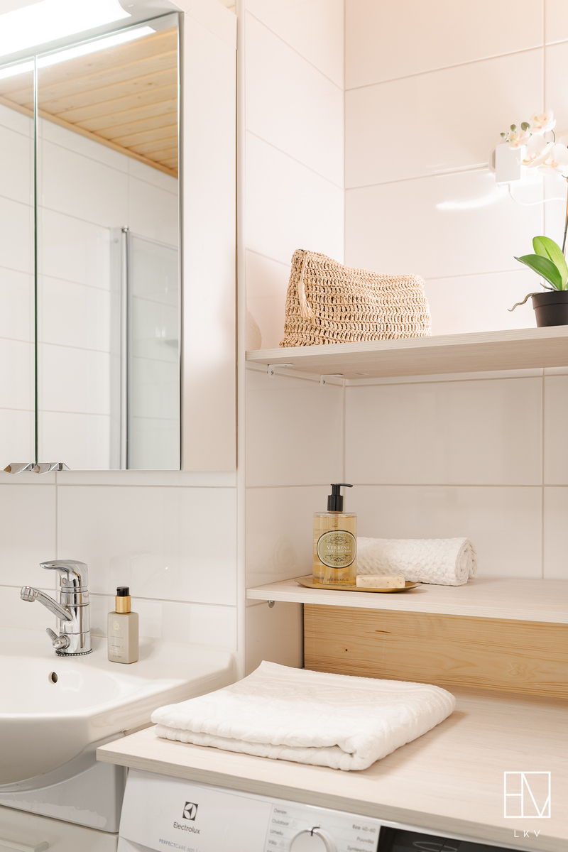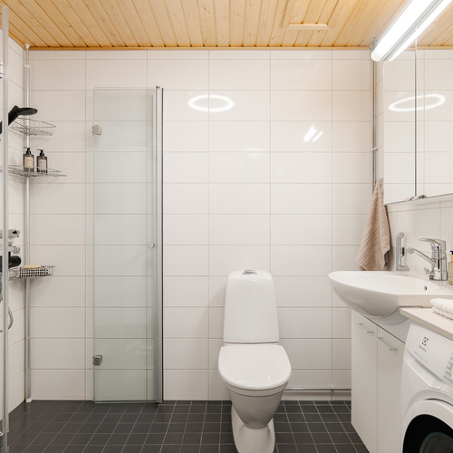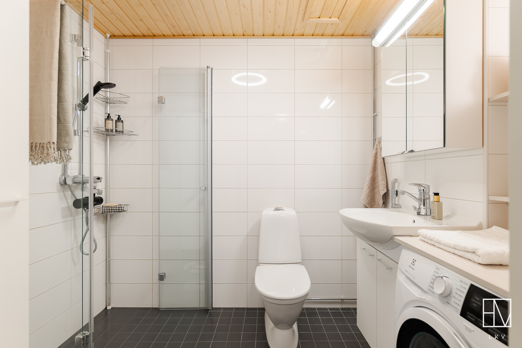 Varusteet: pesukoneliitäntä, lattialämmitys, wc-istuin, suihku, peilikaappi, kiinteät valaisimet, kylpyhuonekaapisto, asennettuja erikoisvarusteita