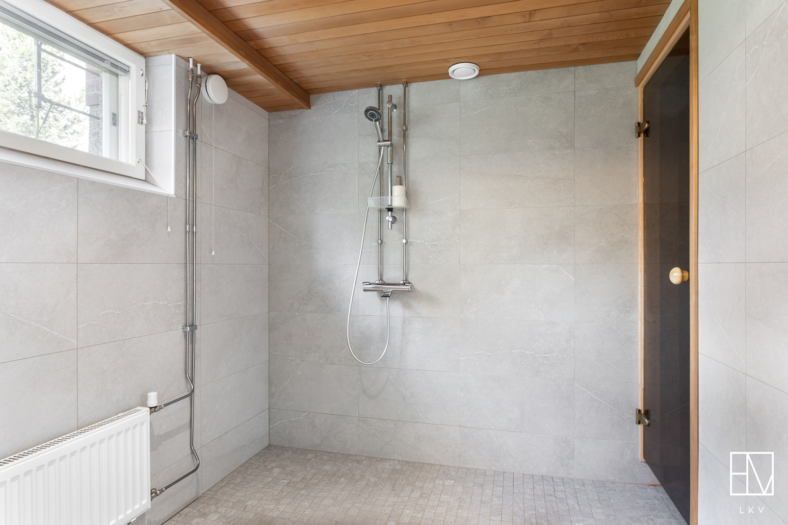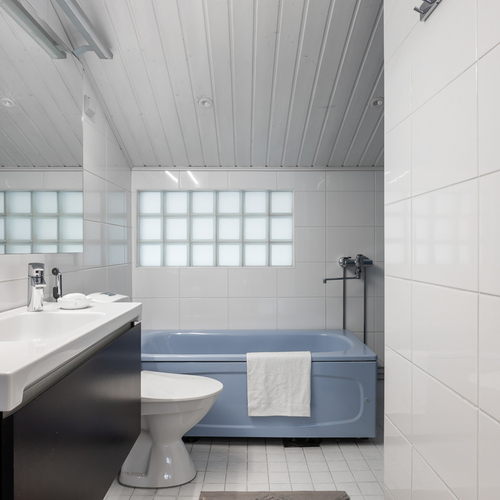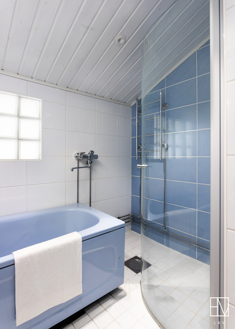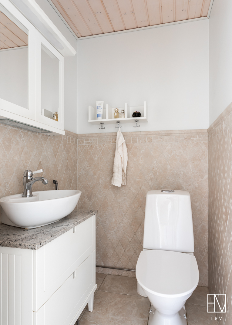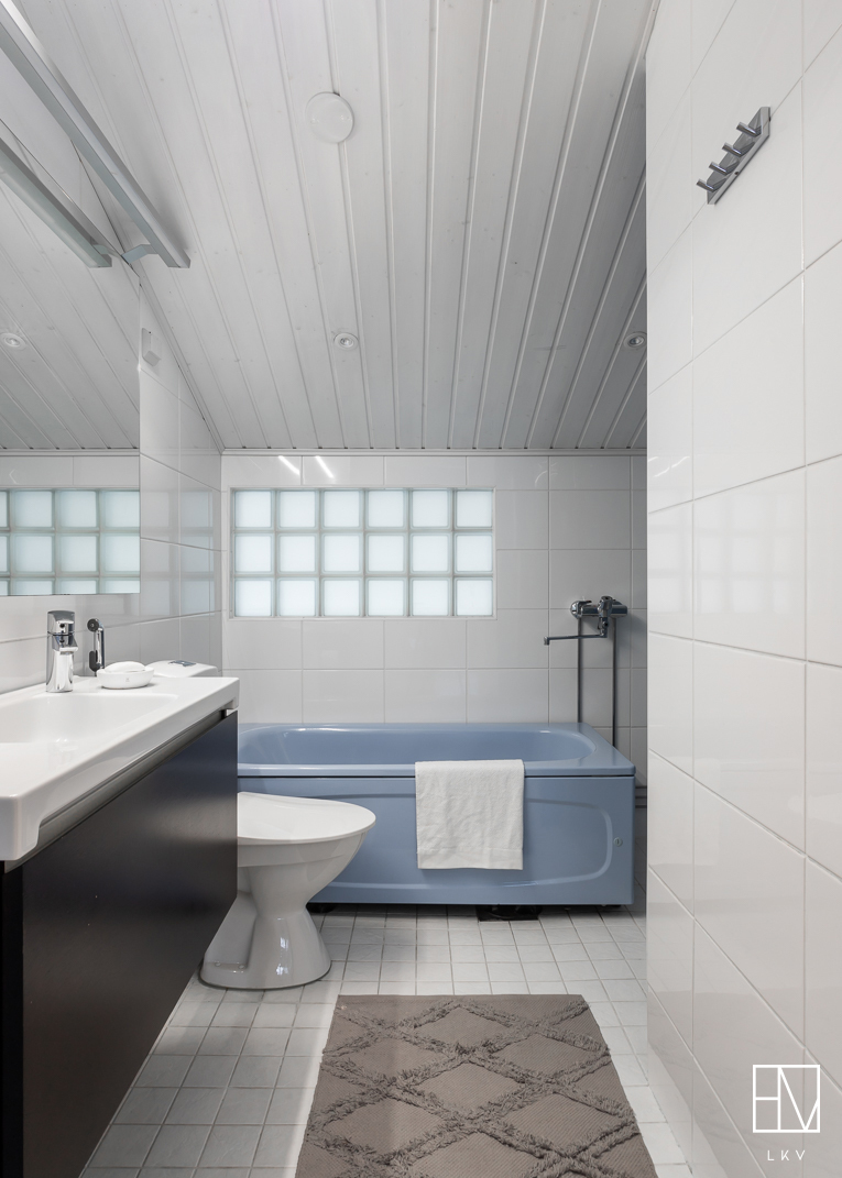 Ylä- ja keskikerros kylpyhuone ja WC (laatat Villeroy Boch). LVI Lipsonen Oy.