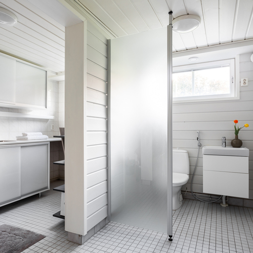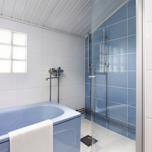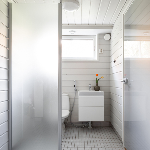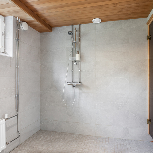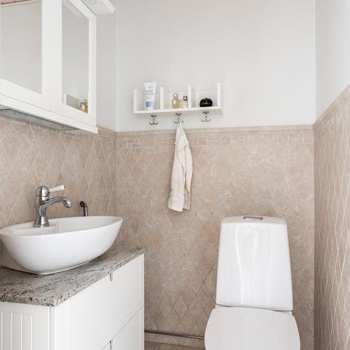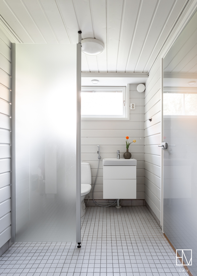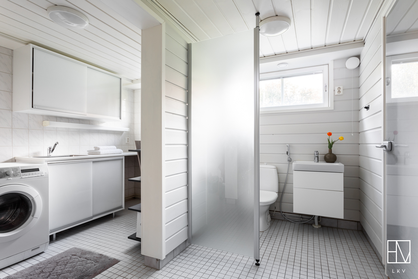 Ylä- ja keskikerros kylpyhuone ja WC (laatat Villeroy Boch). LVI Lipsonen Oy.