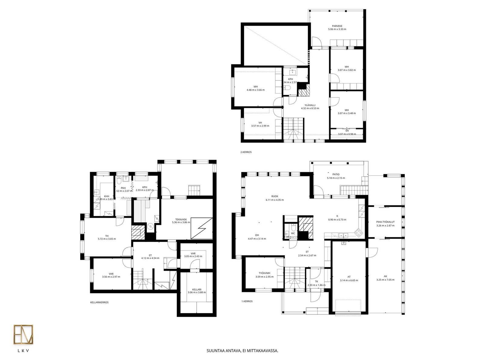 1 ja 2 kerroksen kerrosala on 227 m². Kiinteistön kellarikerros n 103 m².