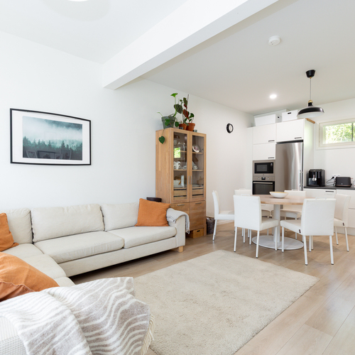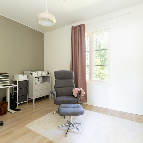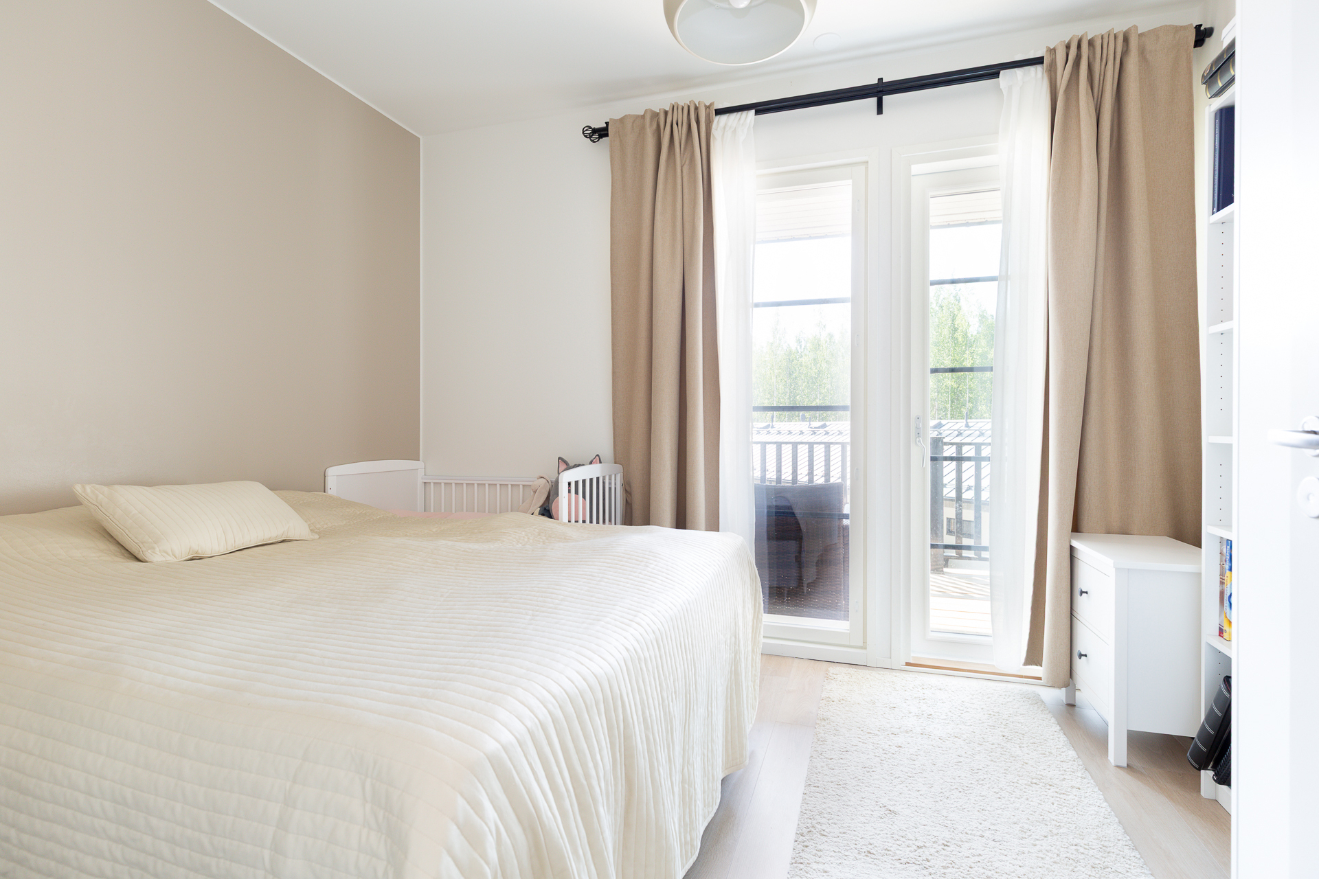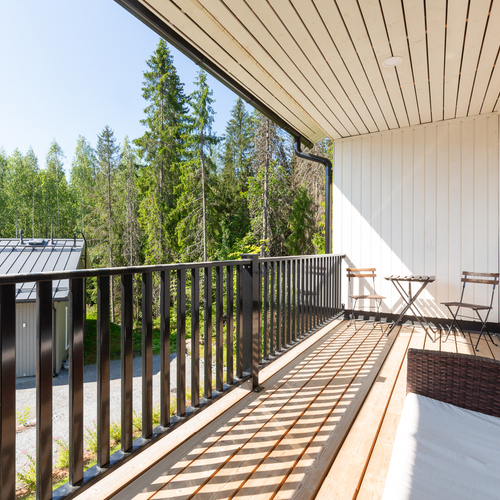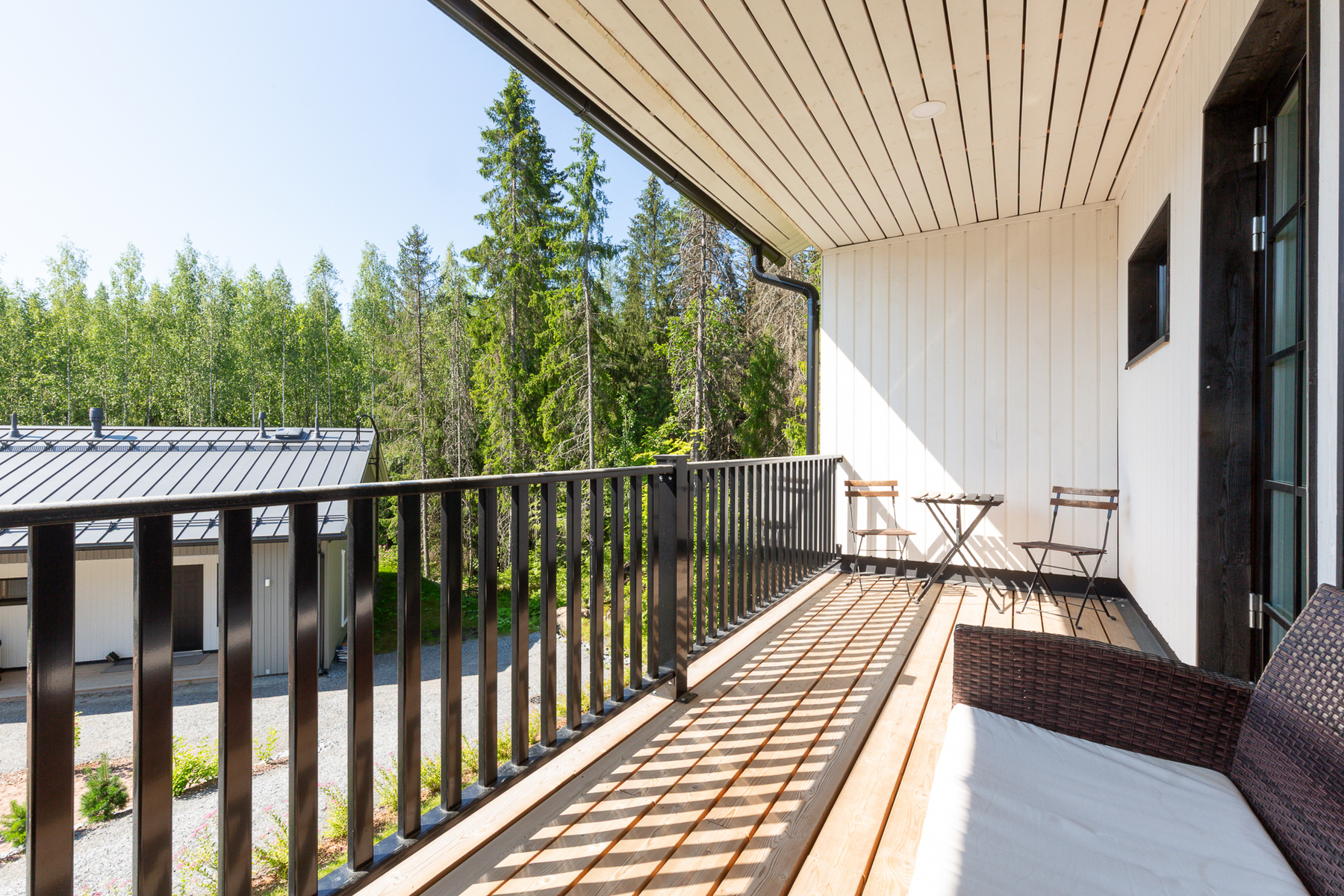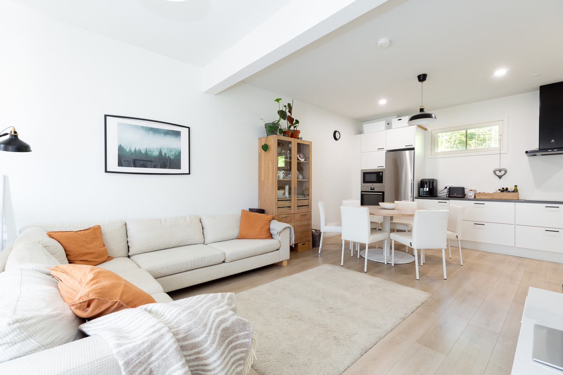 Astu sisään avaraan olohuoneeseen, joka yhdistyy sulavasti avokeittiöön. Olohuoneesta avautuu kulku kuistille, jossa voit nauttia auringosta ja rauhallisista hetkistä ystävien ja perheen kesken. Kauniisti suunniteltu ja valoisa tila tekee kodista viihtyisän ja kutsuvan. Makuuhuoneen yhteydessä on vaatehuone.