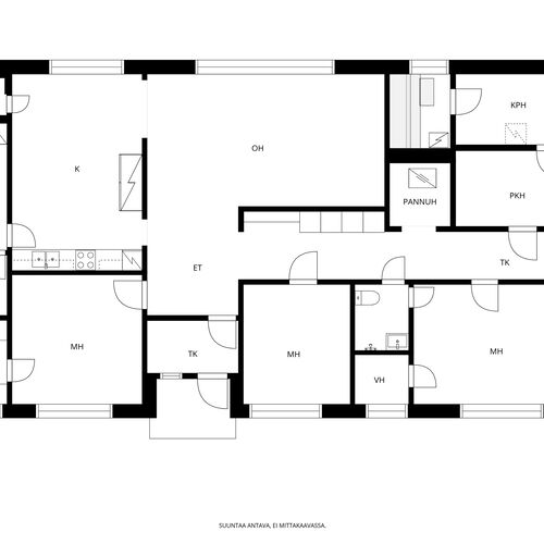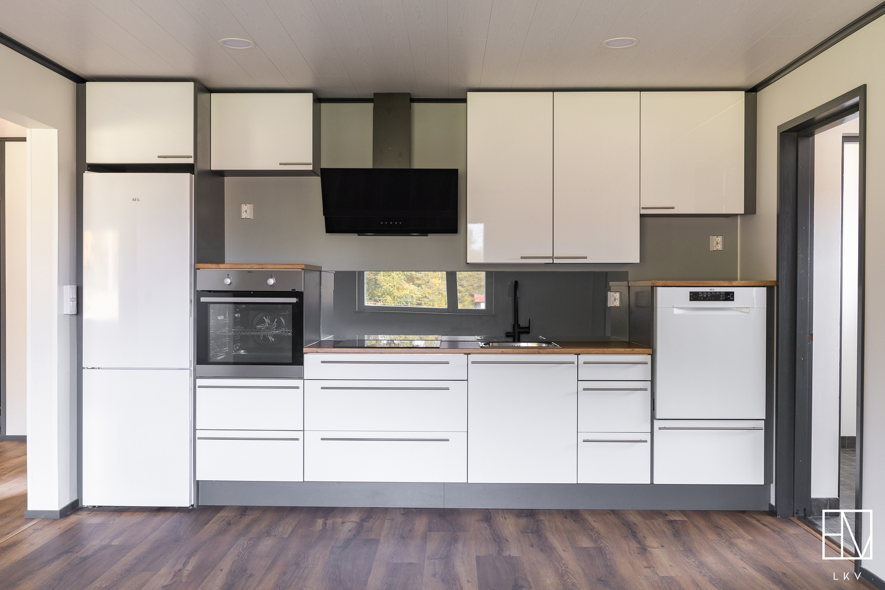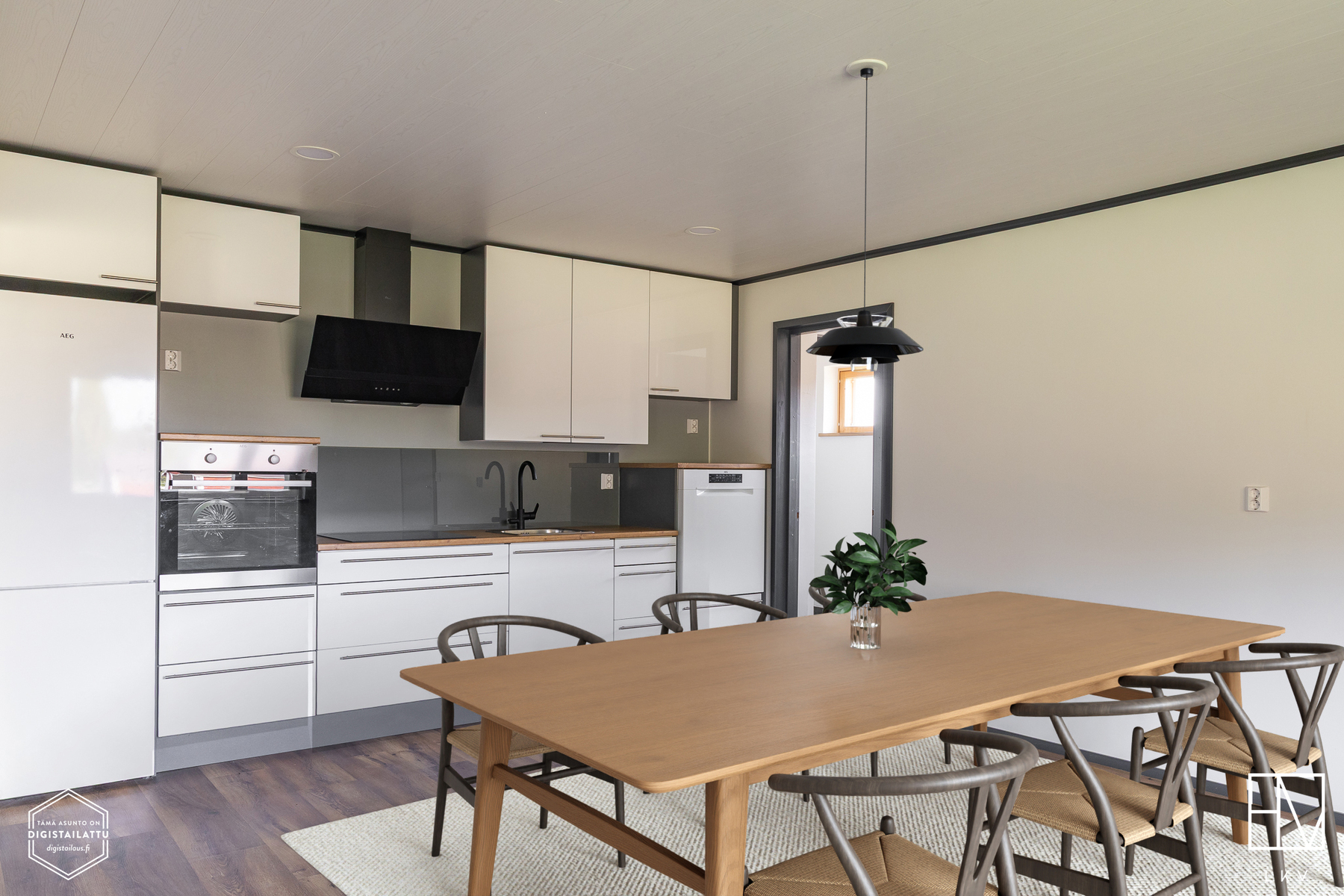 VARUSTUS: kaapistot, jääkaappi/pakastin, erillisuuni, liesituuletin, induktioliesi, astianpesukone, allas, hana.