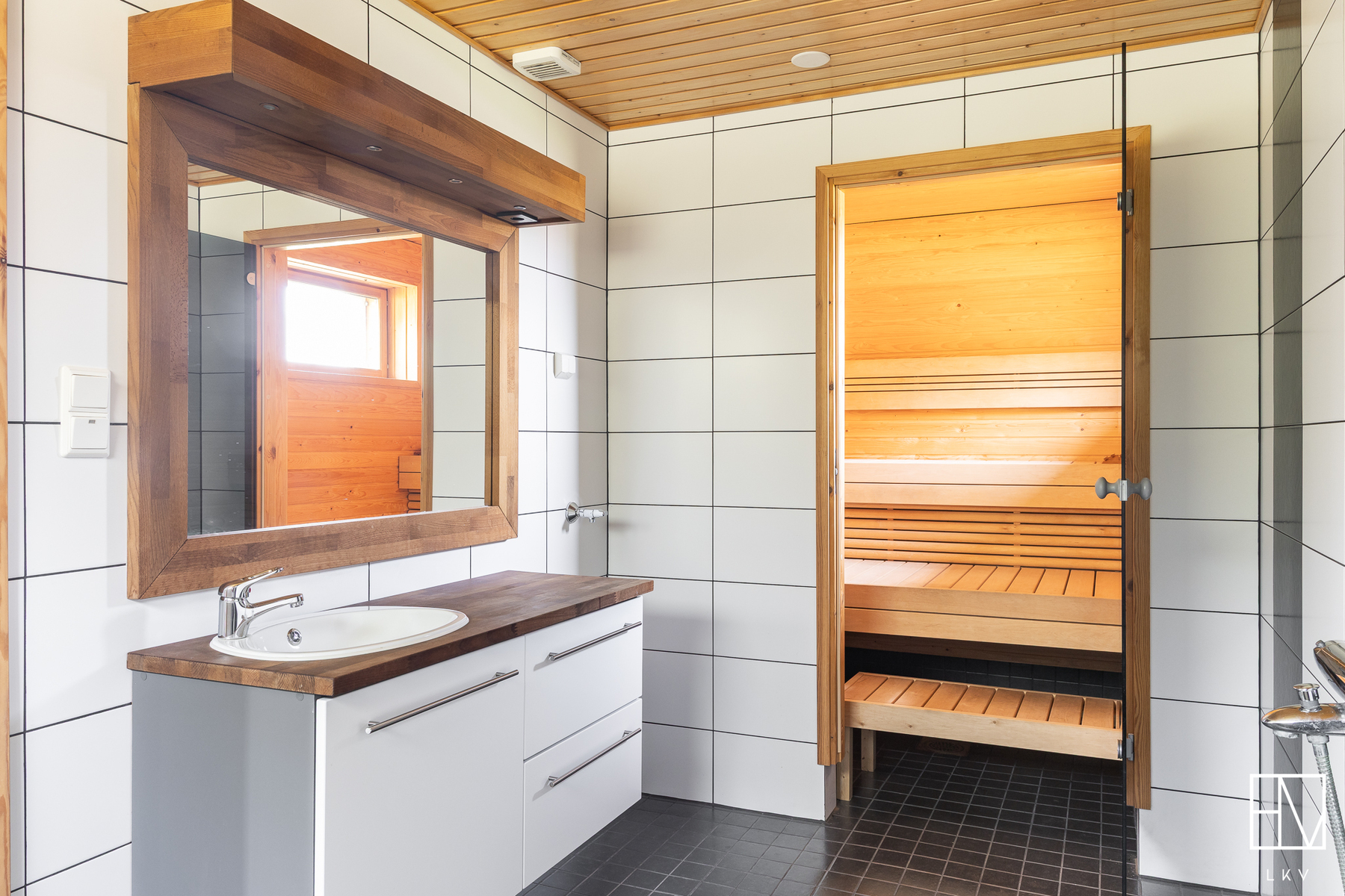 VARUSTUS: kylpyhuonekaapistot, suihku, allas, peili, lattialämmitys, koneellinen poistoimu.
