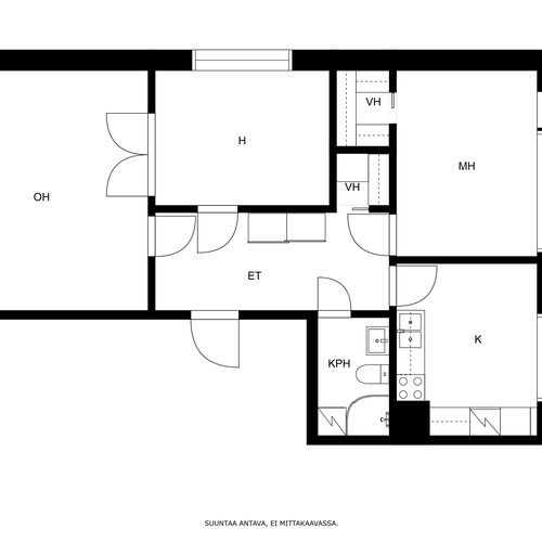 Jääkaappi-pakastin, induktioliesi (uusittu 2022), liesituuletin, astianpesukone (uusittu 2025) ja mikrosyvennys/paikka mikroaaltouunille.