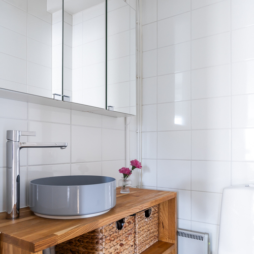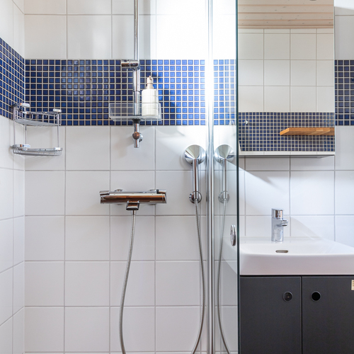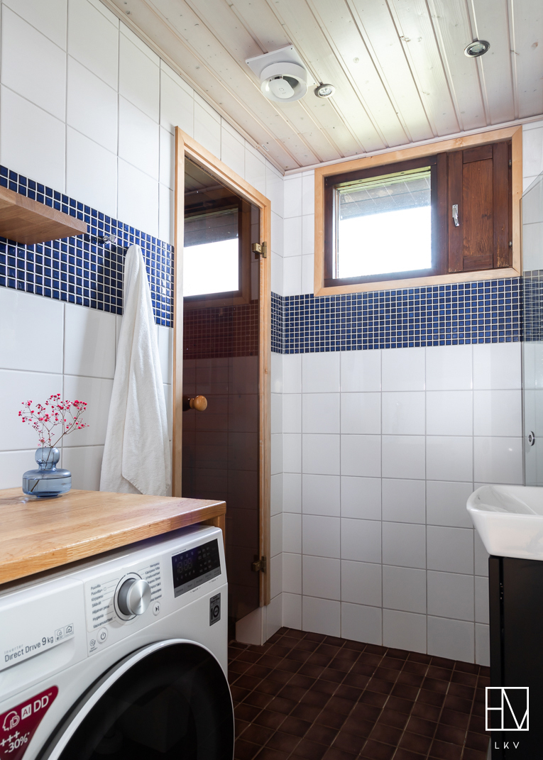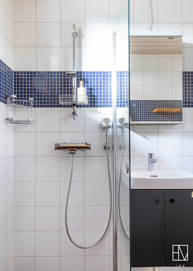 Varusteet: suihkuseinä, pesukoneliitäntä, lattialämmitys, suihku, peili