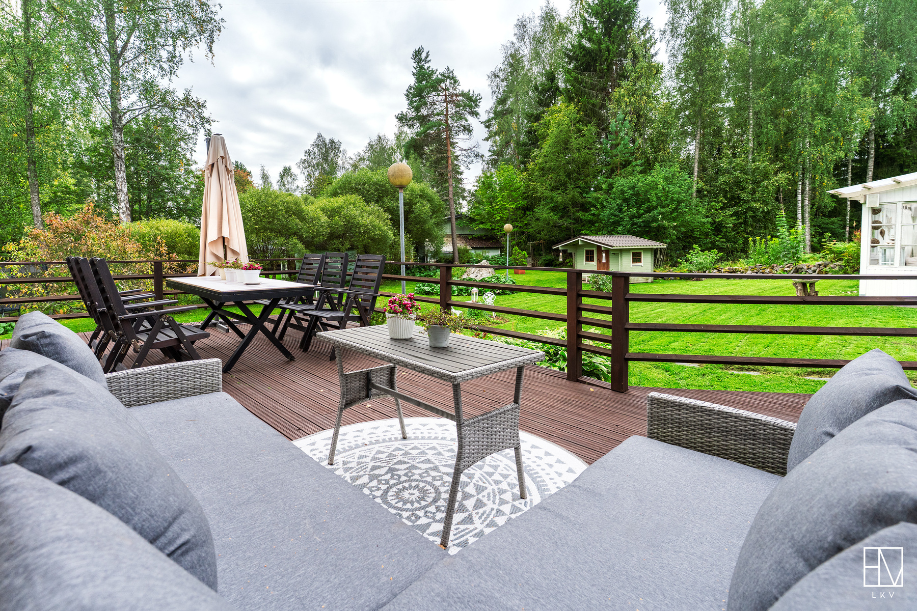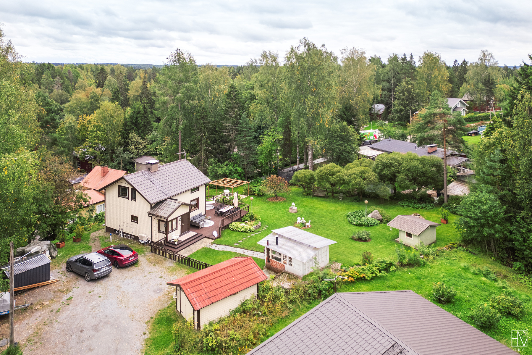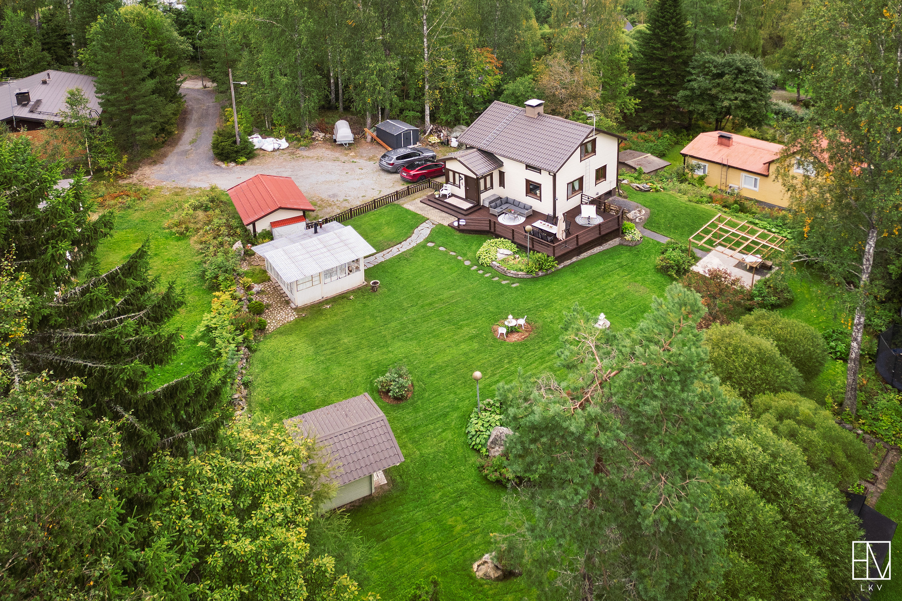 Pihamaalla ulkovarasto, pihakeittiö sekä leikkimökki.