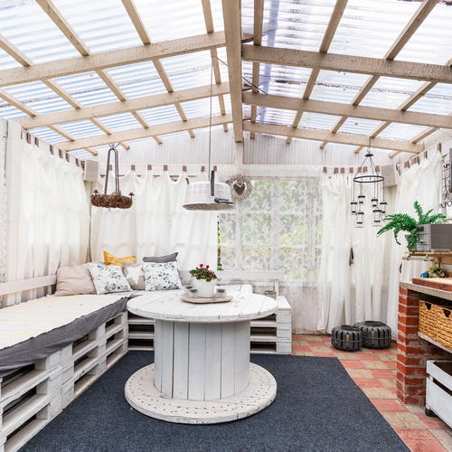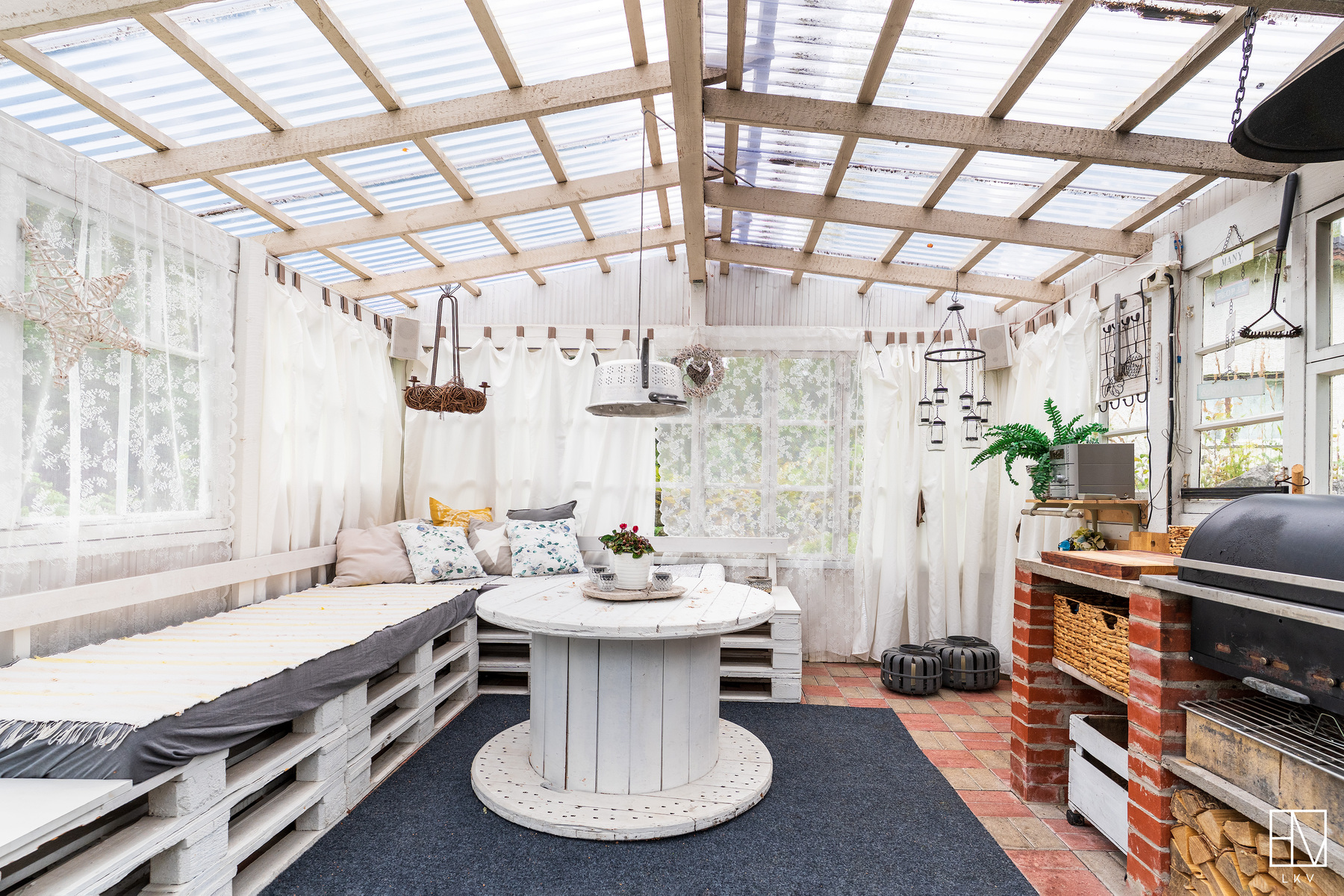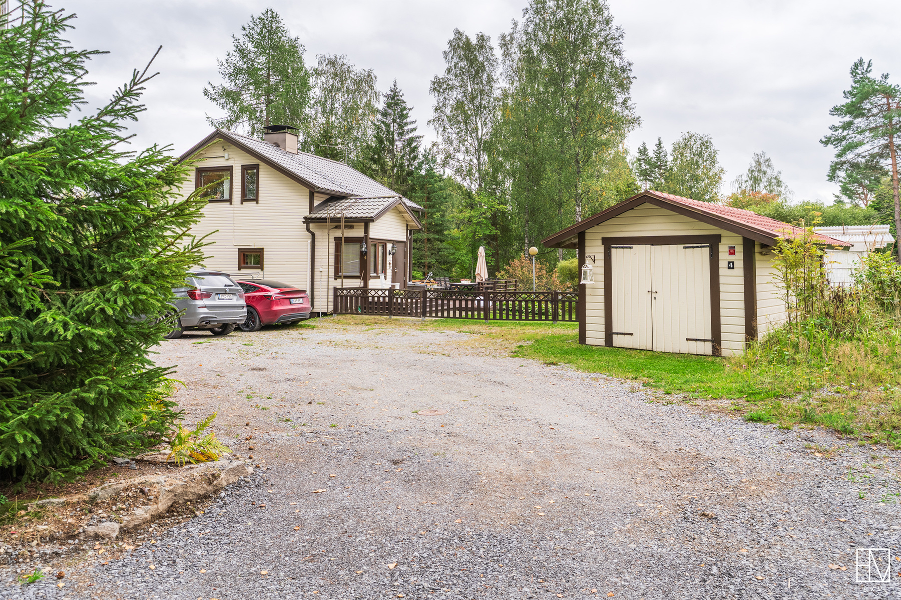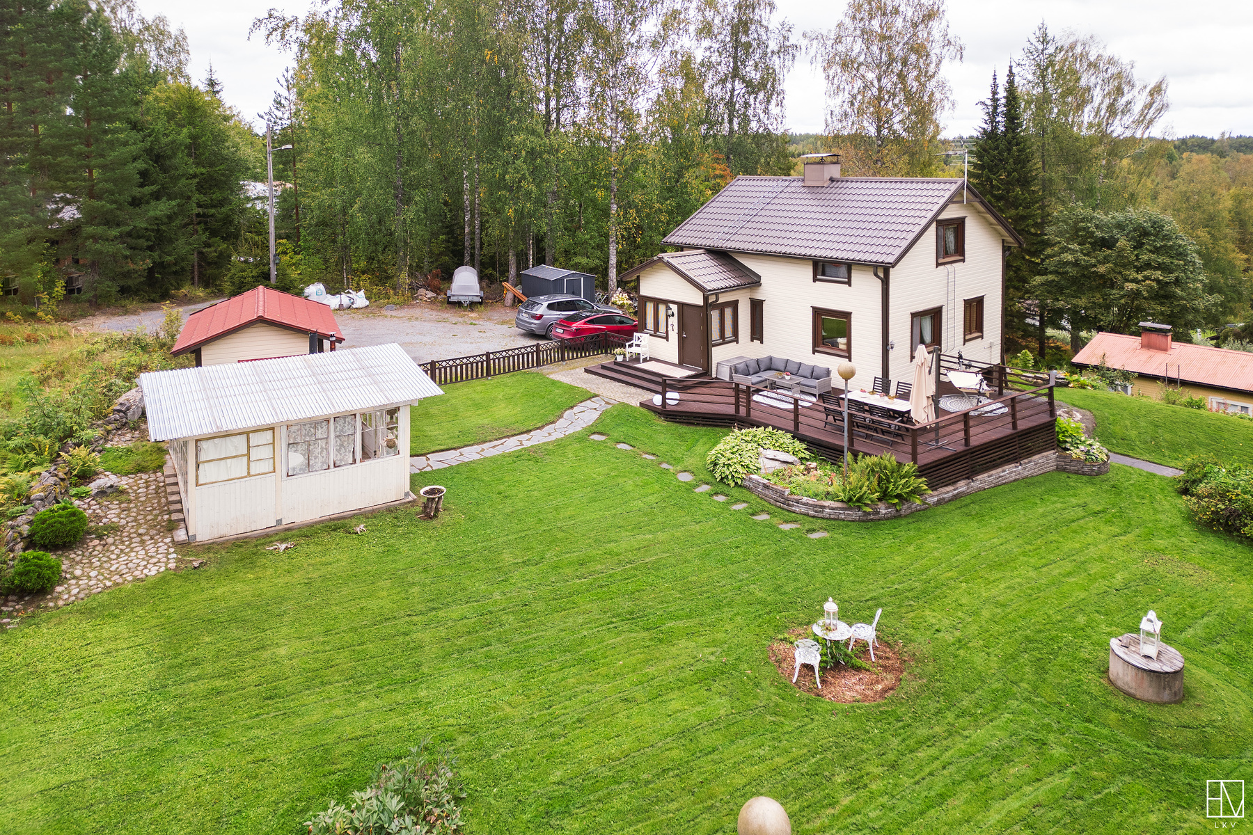 Pihamaalla ulkovarasto, pihakeittiö sekä leikkimökki.