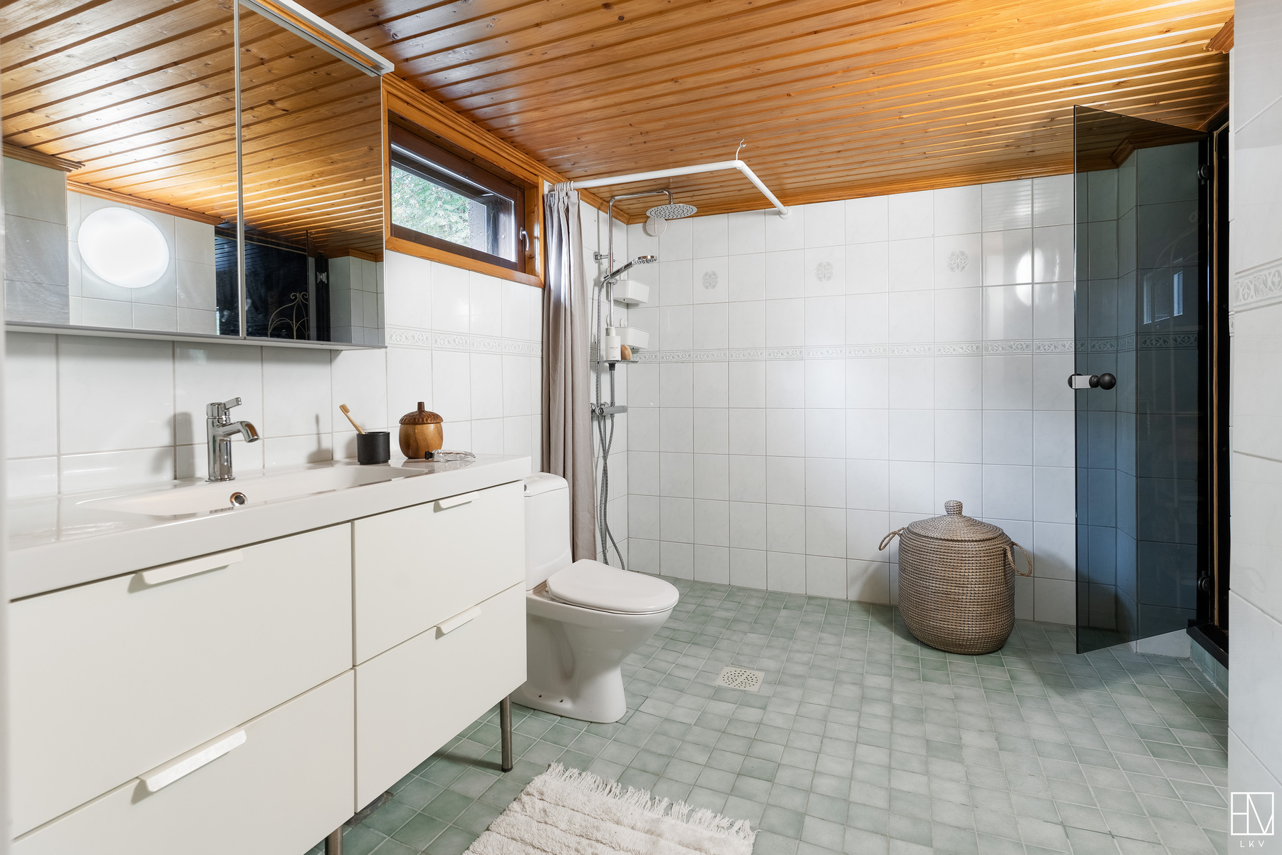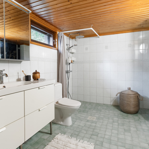 Tilava kylpyhuone remontoitu vuonna 2003. Seinät ja lattia laattaa.