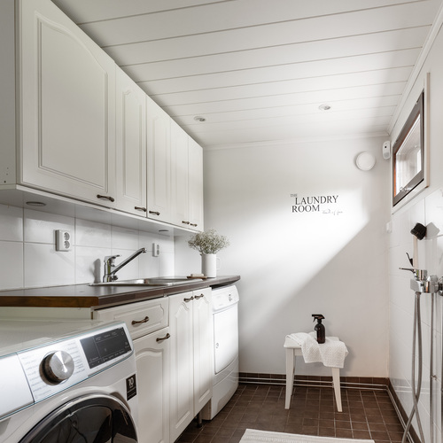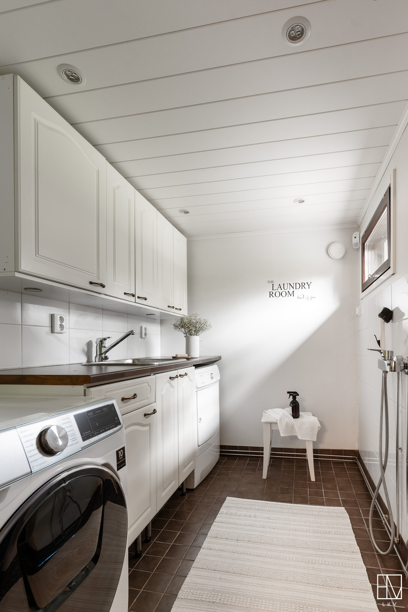 Kodinhoitohuone on remontoitu 2010. Lattia laattaa. Paikka pesukoneelle, kurasyöppö, pesuallas, lasku- ja kaappitilaa.
