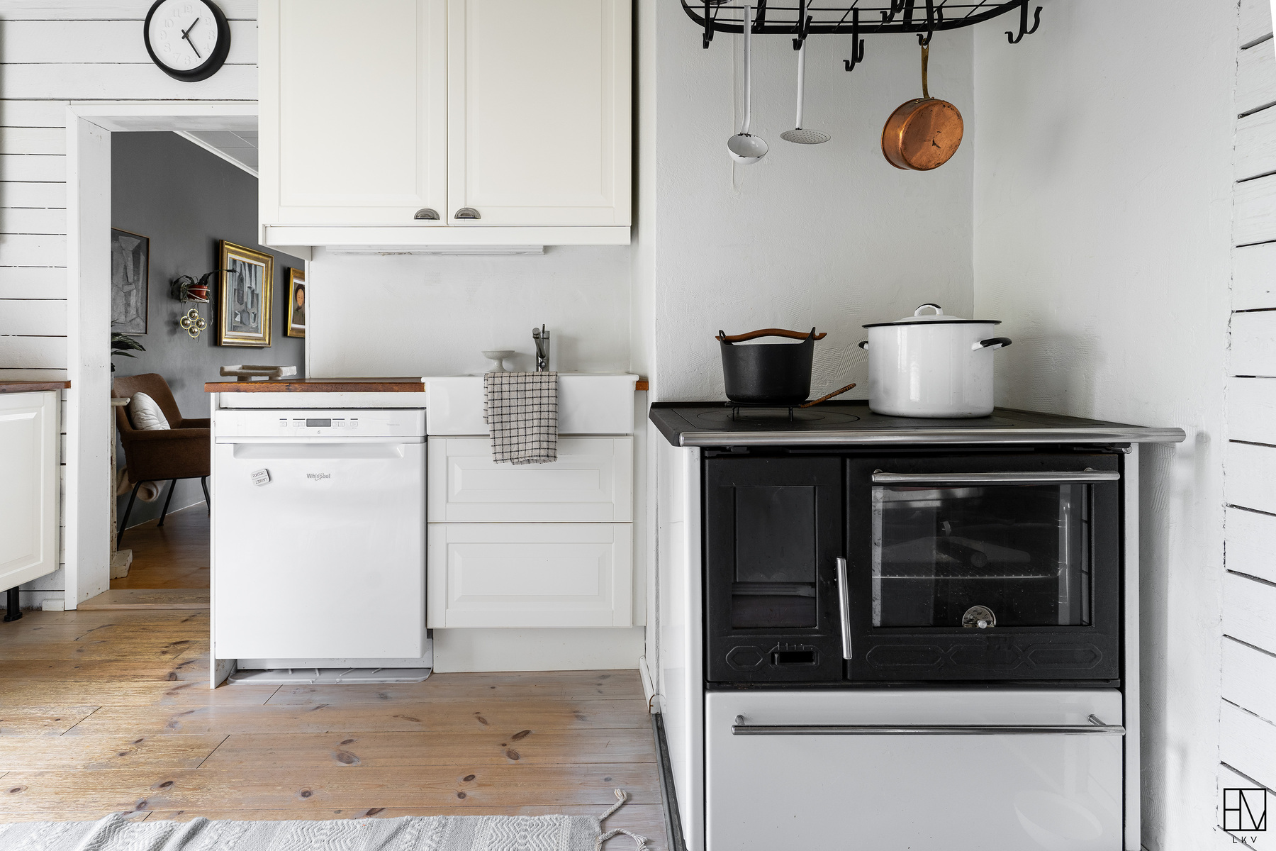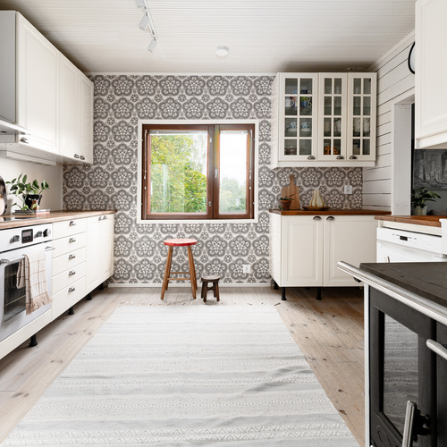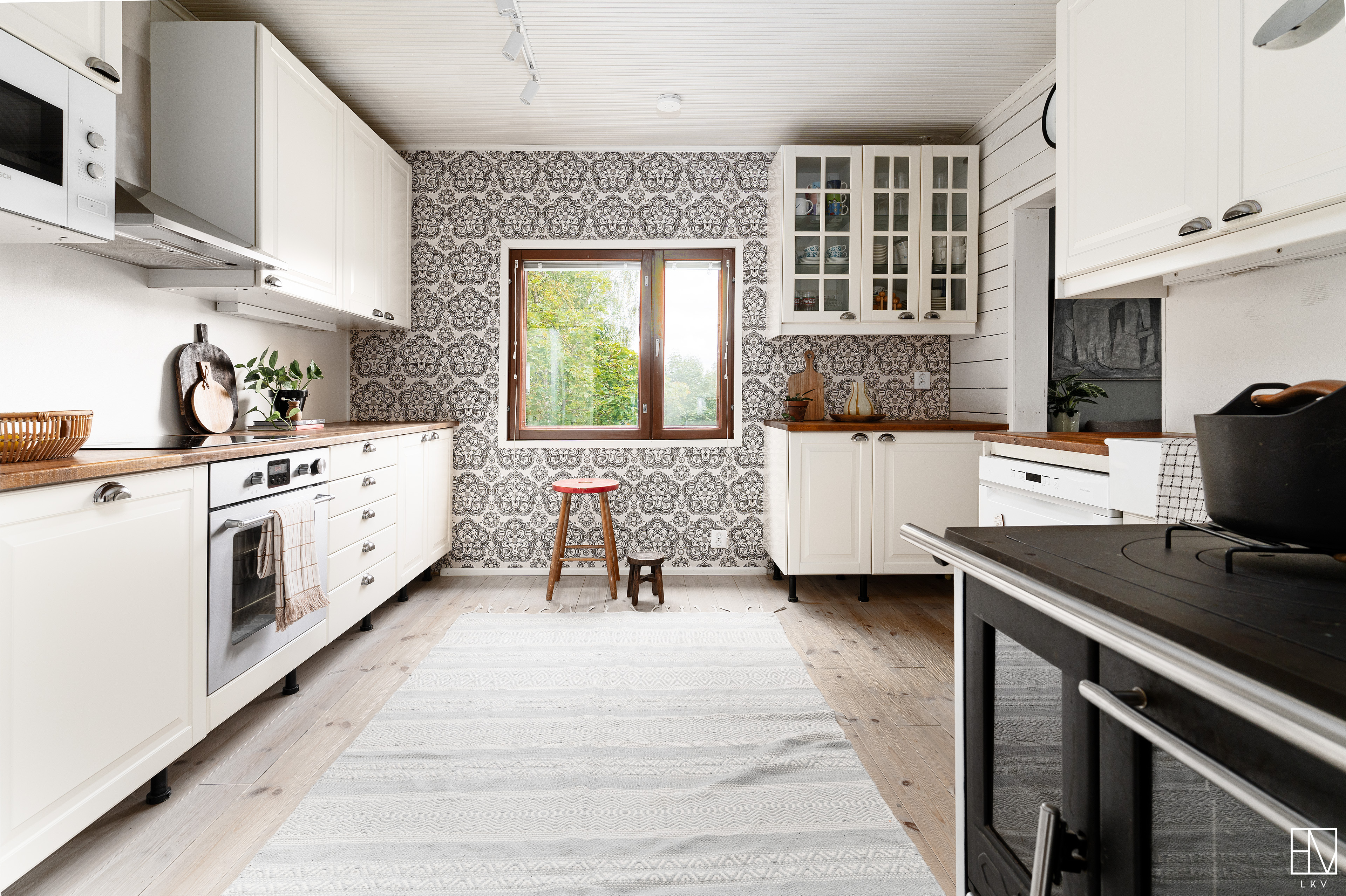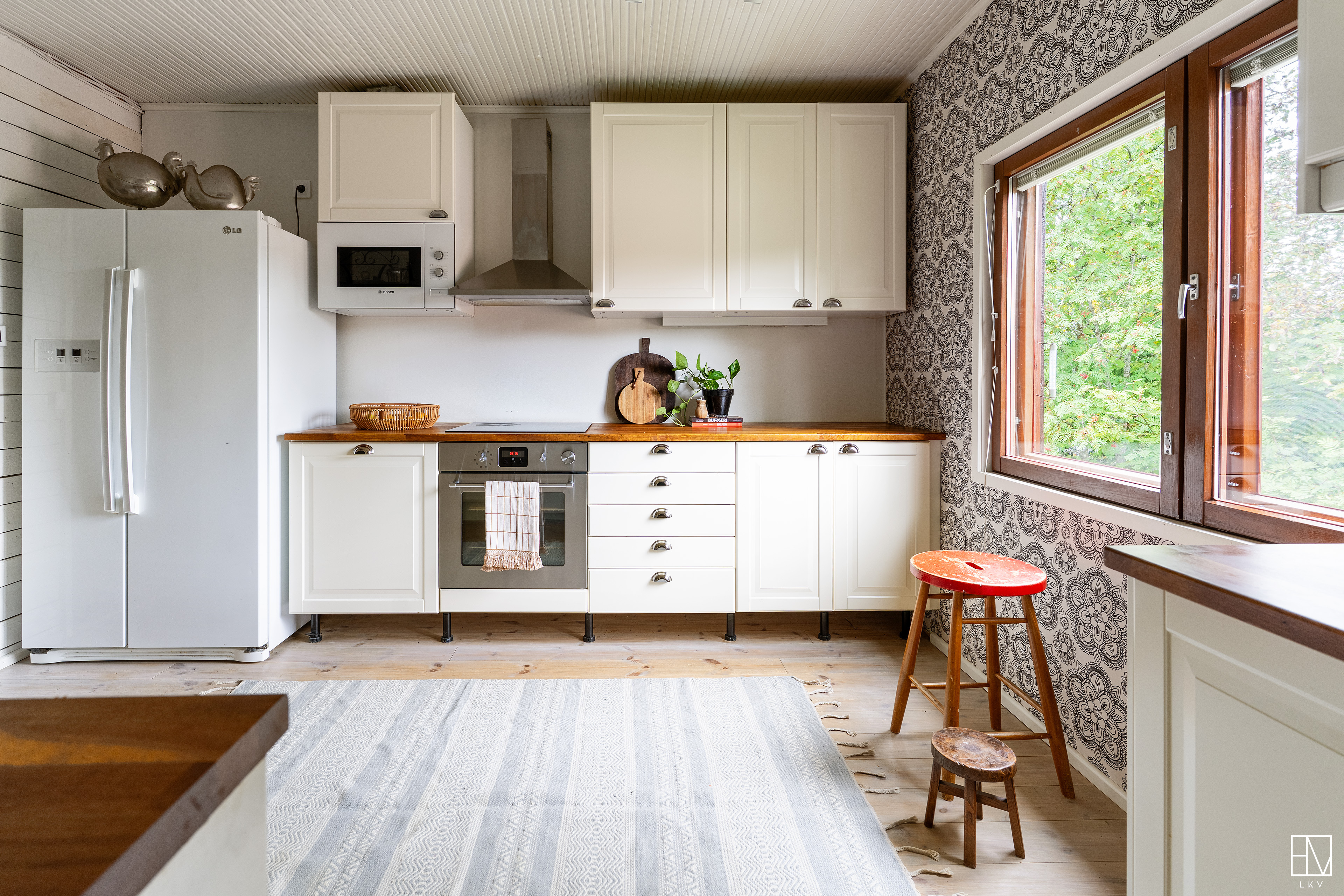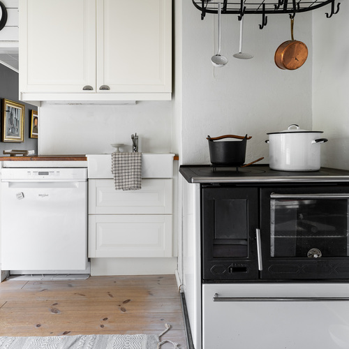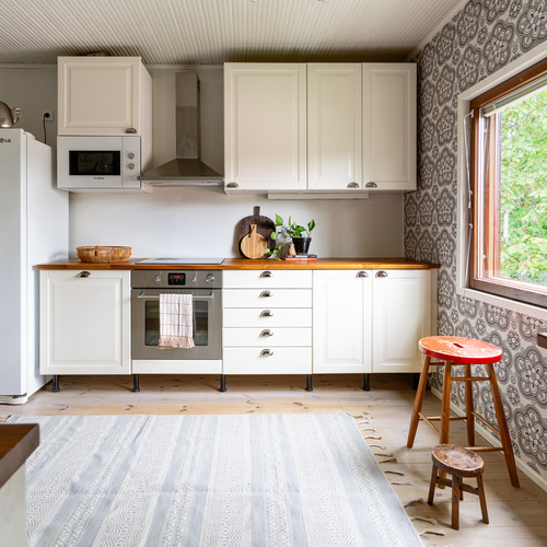 Erillisuuni, induktioliesi, liesituuletin, puuhella, täyskorkeat jääkaappi ja pakastin, integroitu mikroaaltouuni, asitanpesukone.