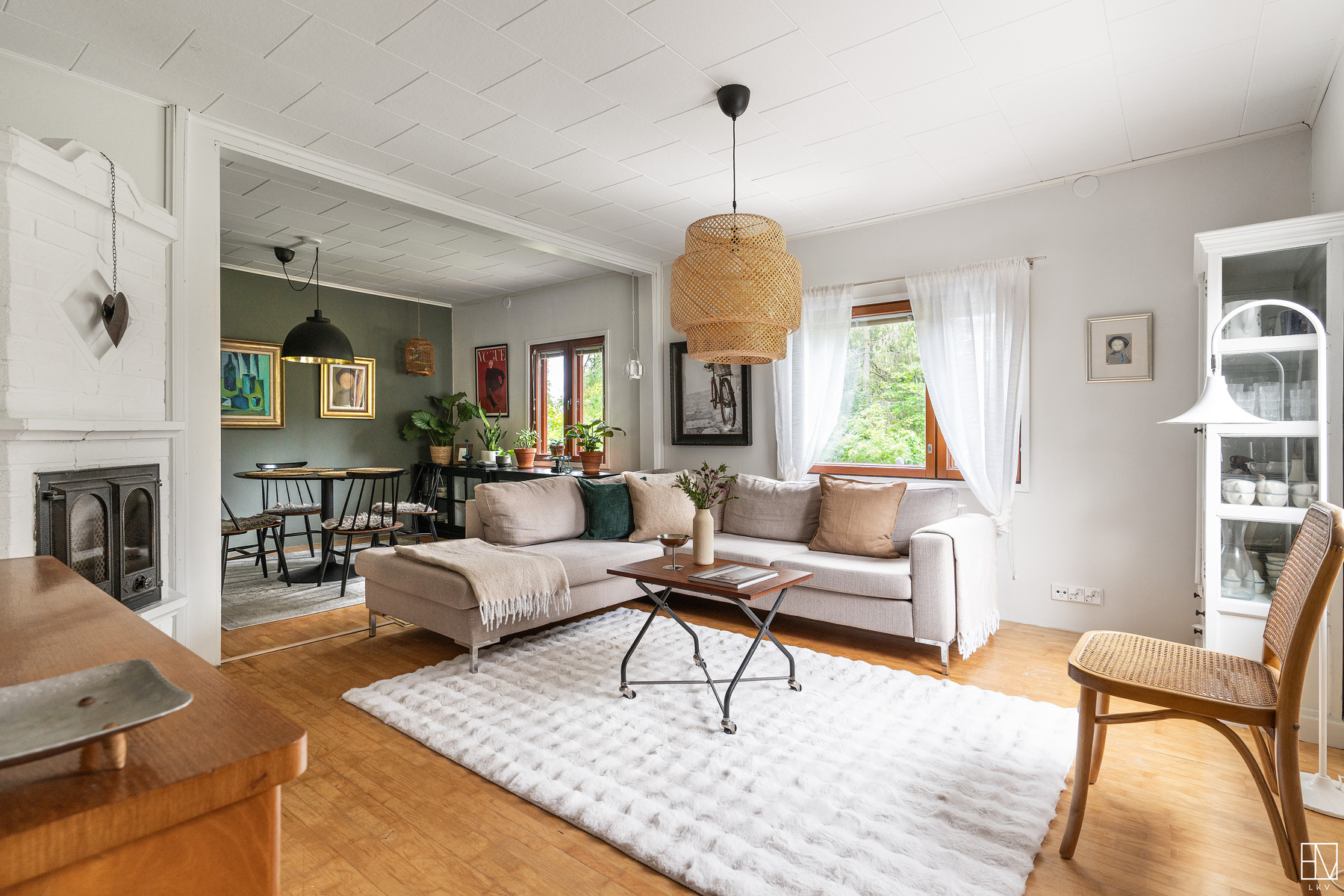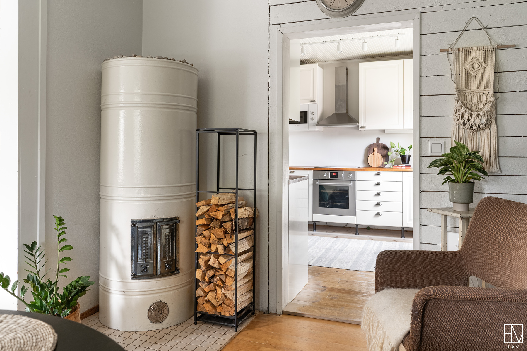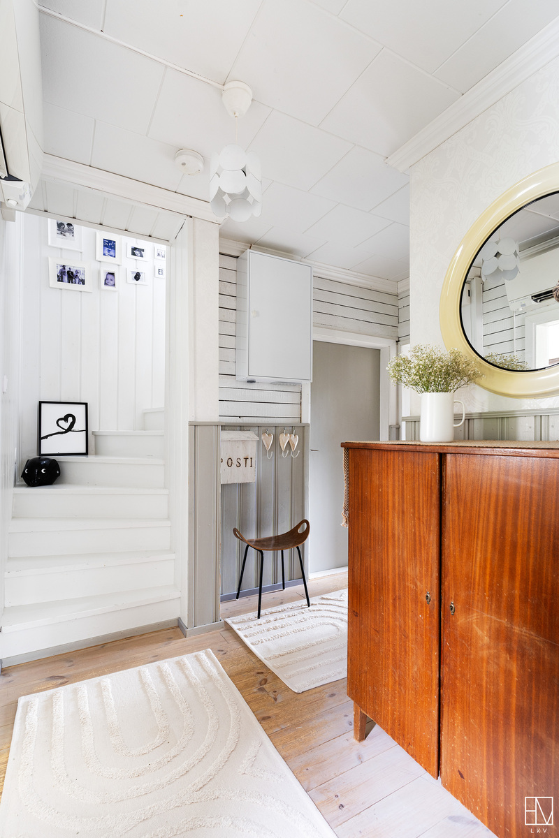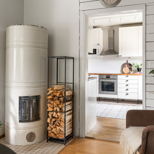 Keskikerroksessa on asunnon toinen wc, keittiö sekä kaksi oleskeluhuonetta. Toisessa huoneessa on hieno pönttöuuni ja toisessa huoneessa on varaava takka. Yläkerrassa on kaksi tilavaa makuuhuonetta sekä varastointitilaa.
