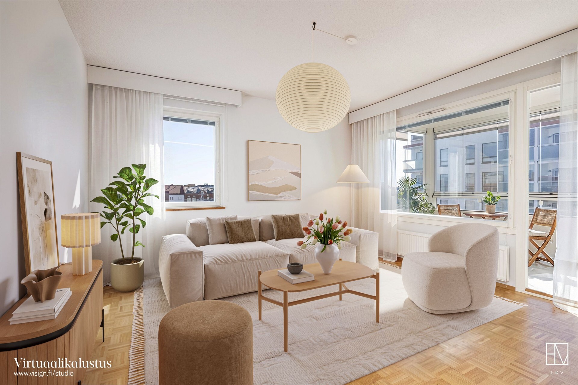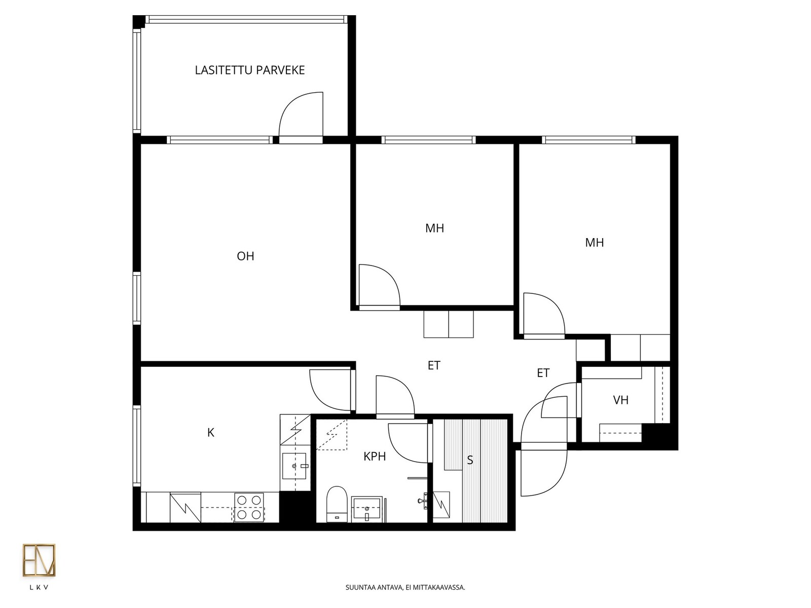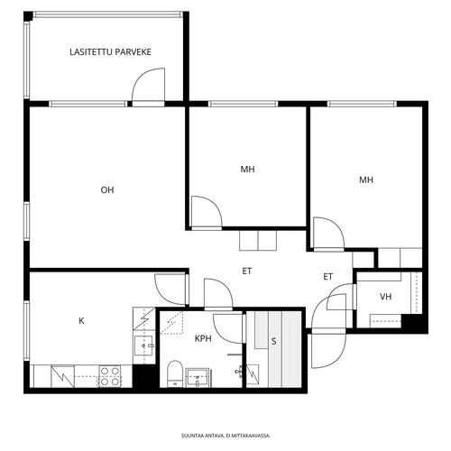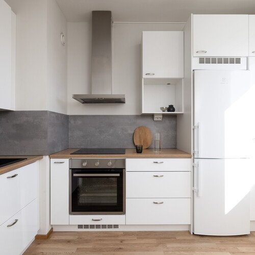 Asunnon pohjaratkaisu on käytännöllinen ja toimiva. Erillinen keittiö on remontoitu vuonna 2021 ja se tarjoaa modernit sekä tyylikkäät puitteet ruoanlaittoon. Tilava olohuone toimii kodin sydämenä. Olohuoneesta on kulku isolle lasitetulle parvekkeelle, joka toimii viihtyisänä oleskelutilana pitkälle syksyyn. Kaksi makuuhuonetta mahdollistavat joustavat käyttömahdollisuudet niin perheelle, työhuoneeksi kuin vierashuoneeksikin.