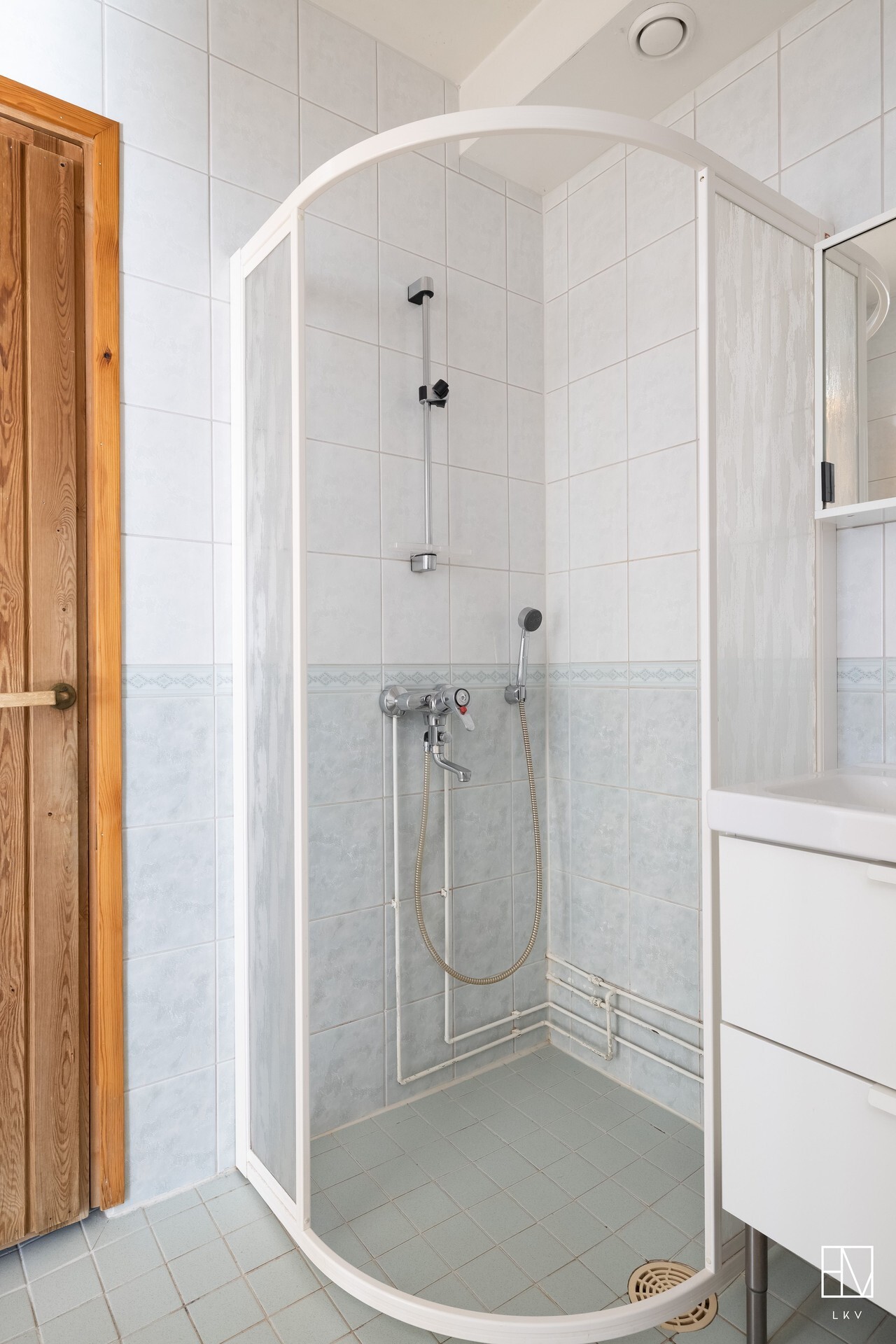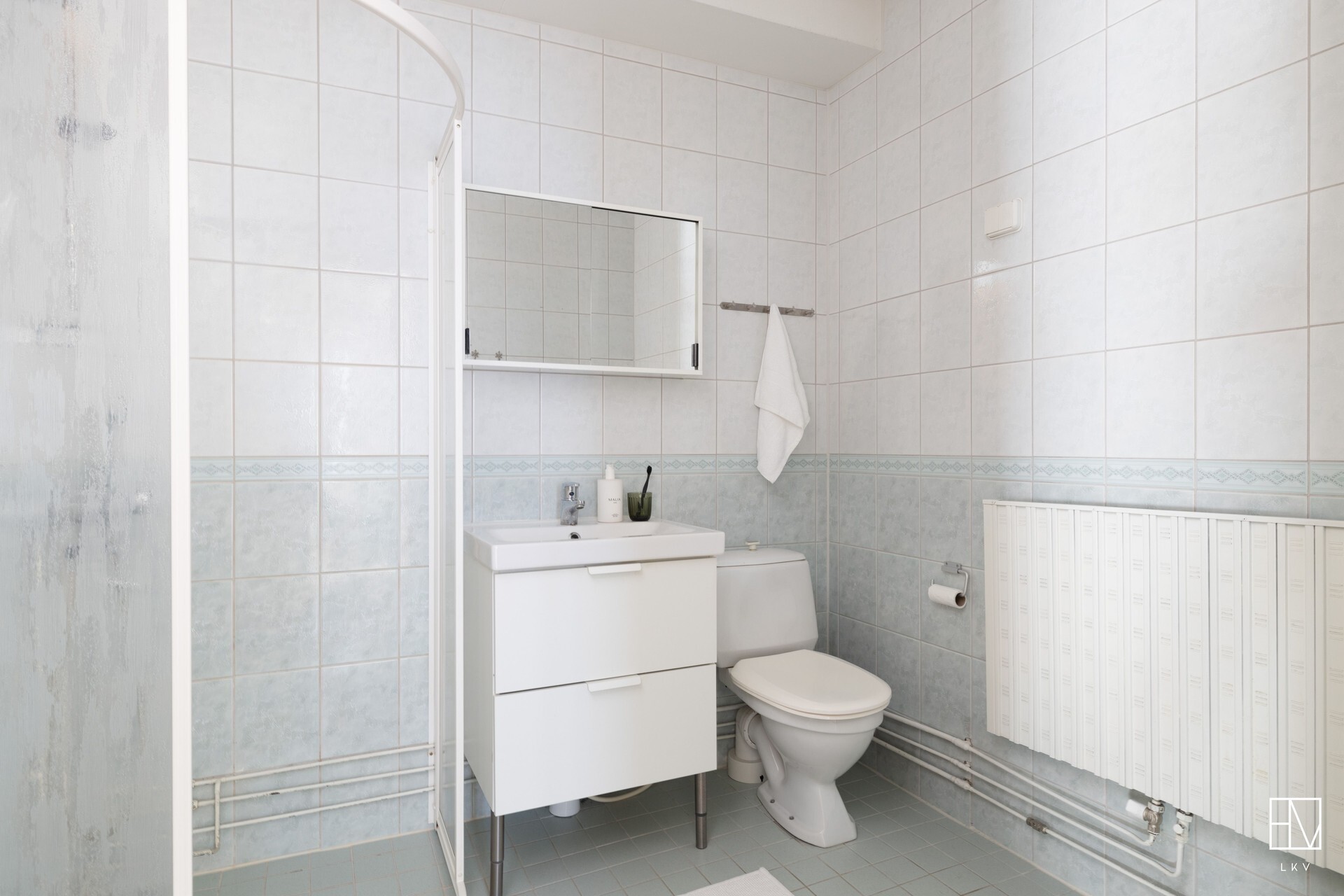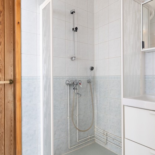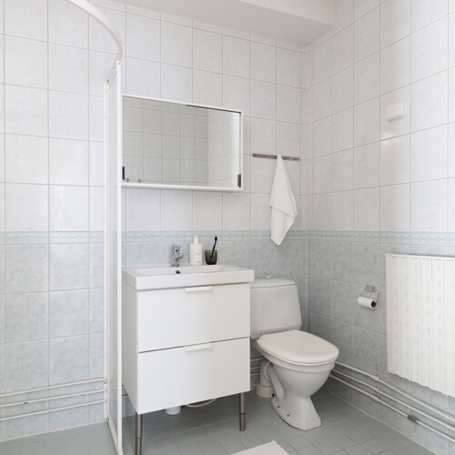 Varusteet: suihkuseinä, pesukoneliitäntä, wc-istuin, suihku, peilikaappi, kylpyhuonekaapisto