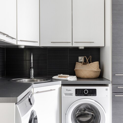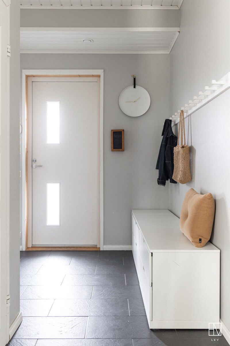 Arkea helpottaa reilunkokoinen kodinhoitohuone, josta on suora kulku pesuhuoneeseen ja tunnelmalliseen saunaan.