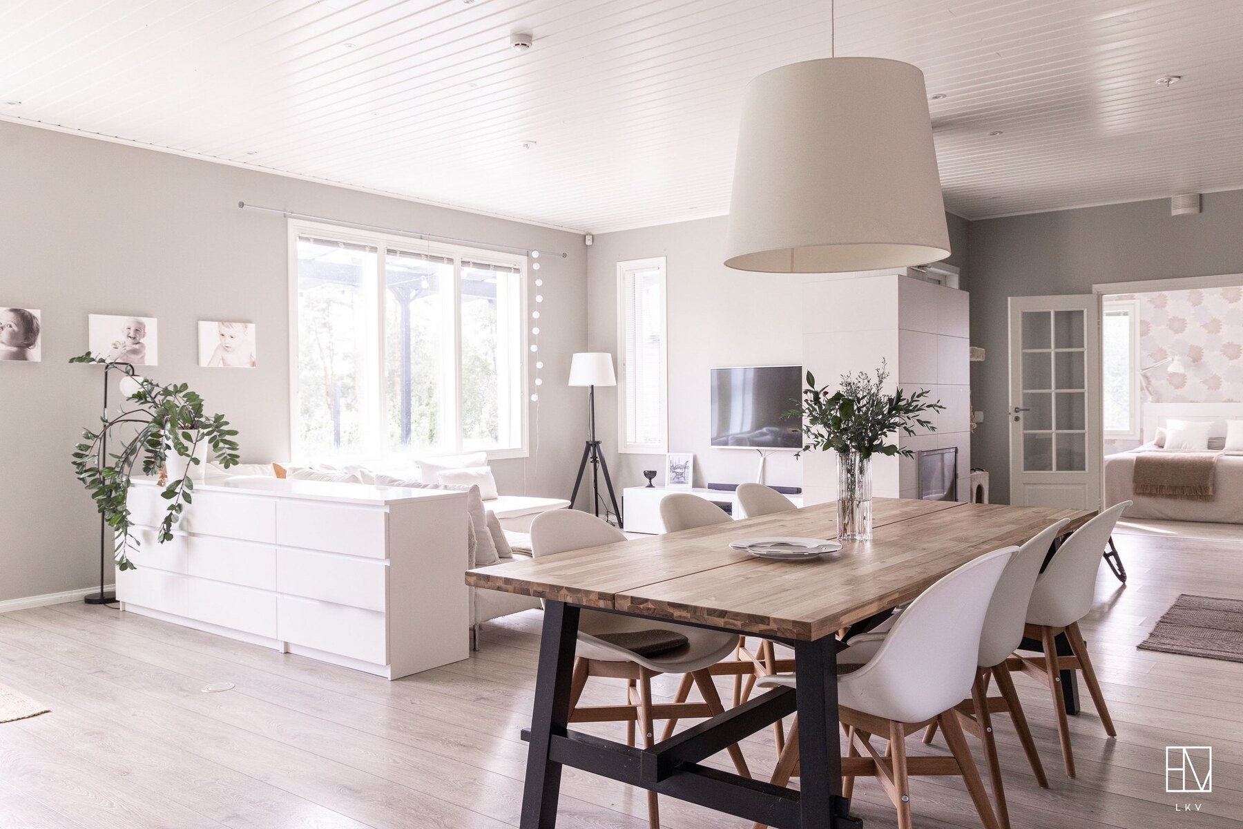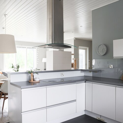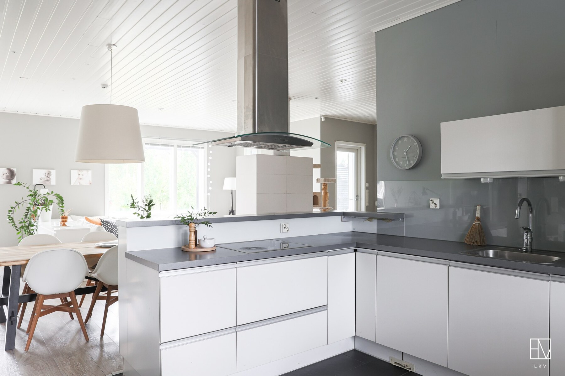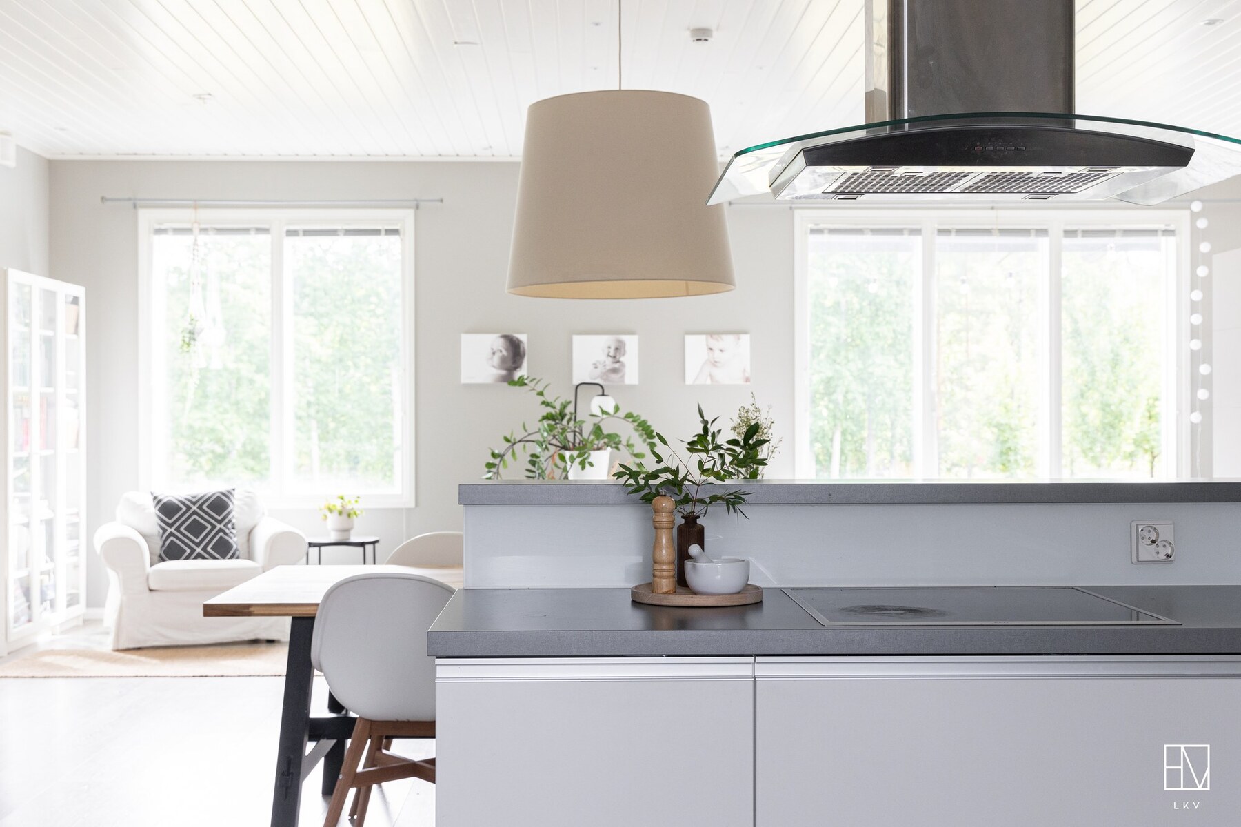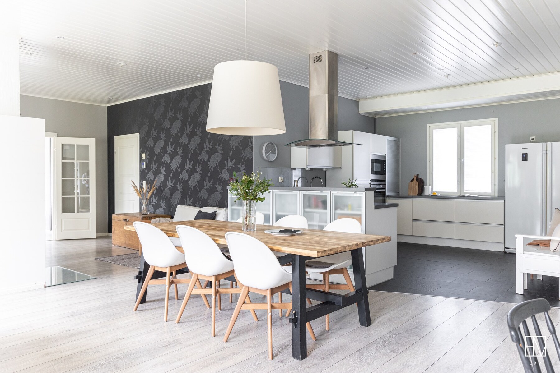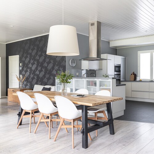 Olohuone ja keittiö muodostavat yhtenäisen, lähes 60 m² kokoisen avaran kokonaisuuden, jossa on tilaa niin arkeen kuin juhlaan.