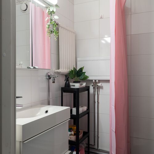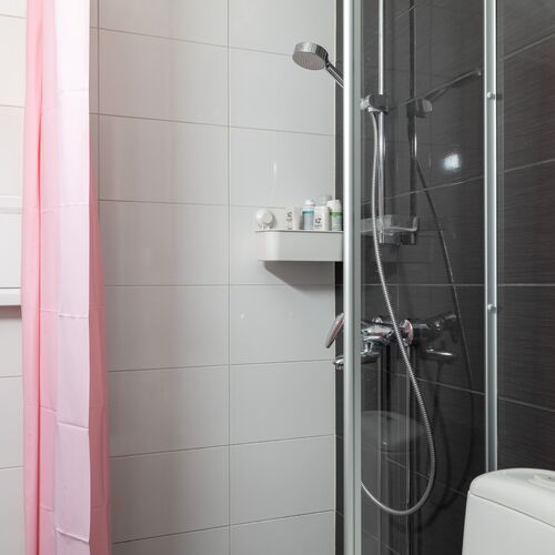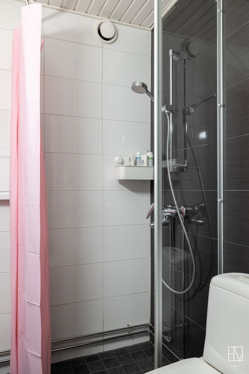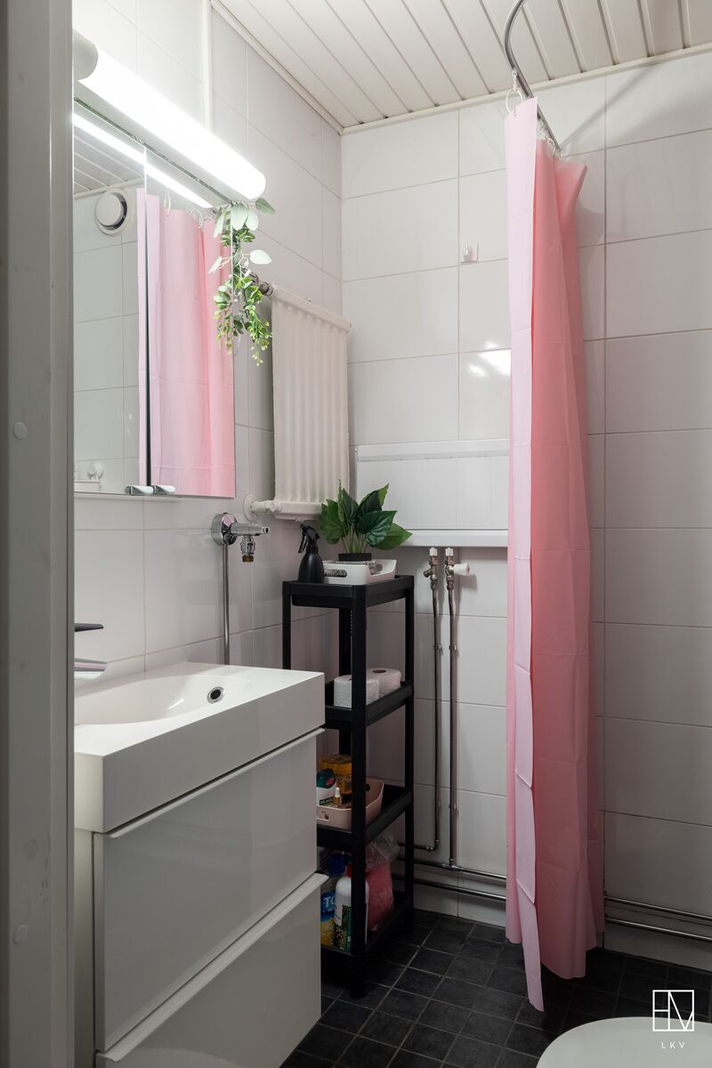 wc-istuin, suihku, pesukoneliitäntä, peilikaappi, allaskaappi, lattialämmitys ja kiinteät valaisimet.