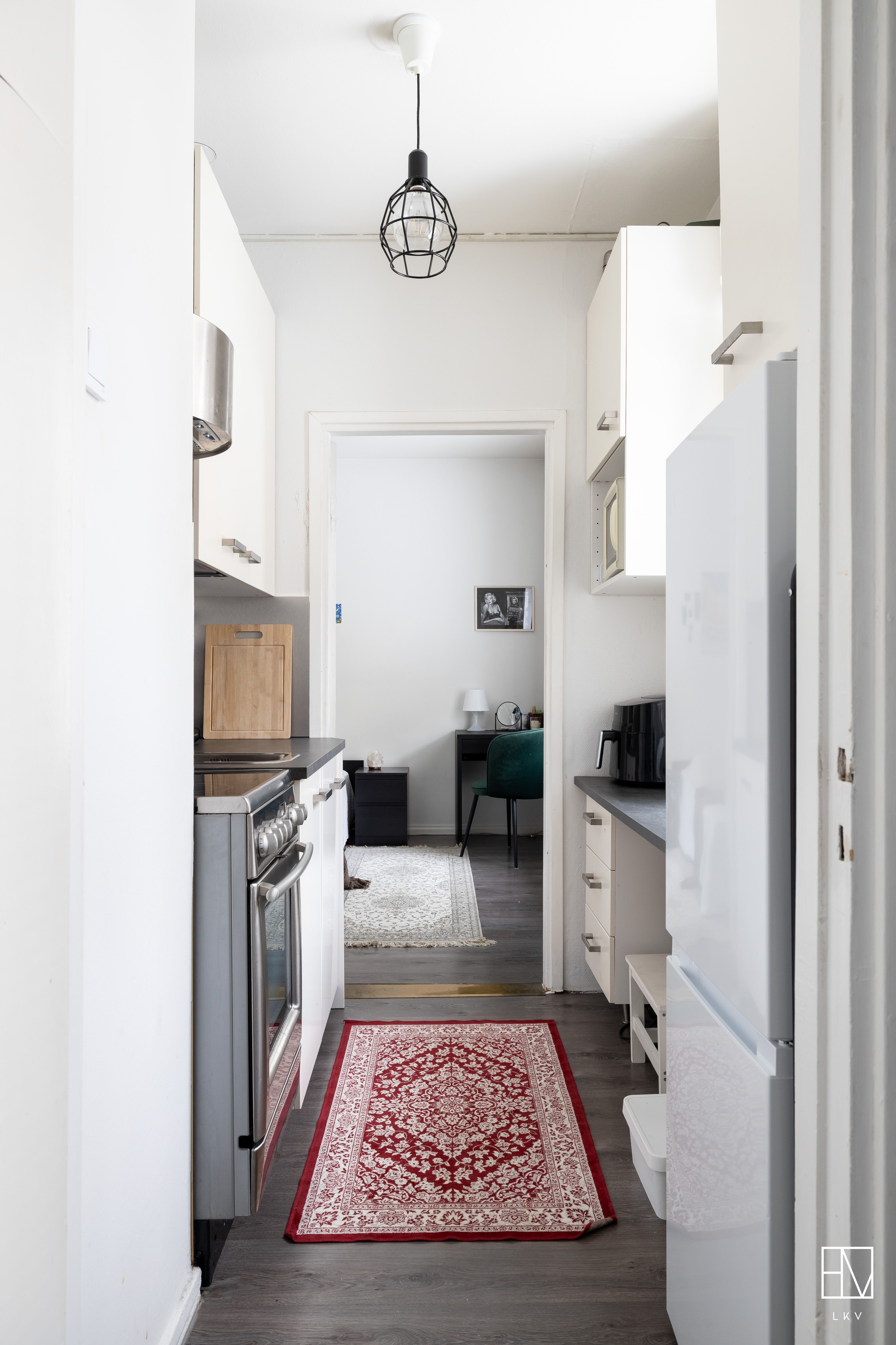 jääkaappipakastin, keraaminen liesi, liesituuletin (aktiivihiilisuodatin), integroitu astianpesukone, kiinteät valaisimet ja kaapistot.