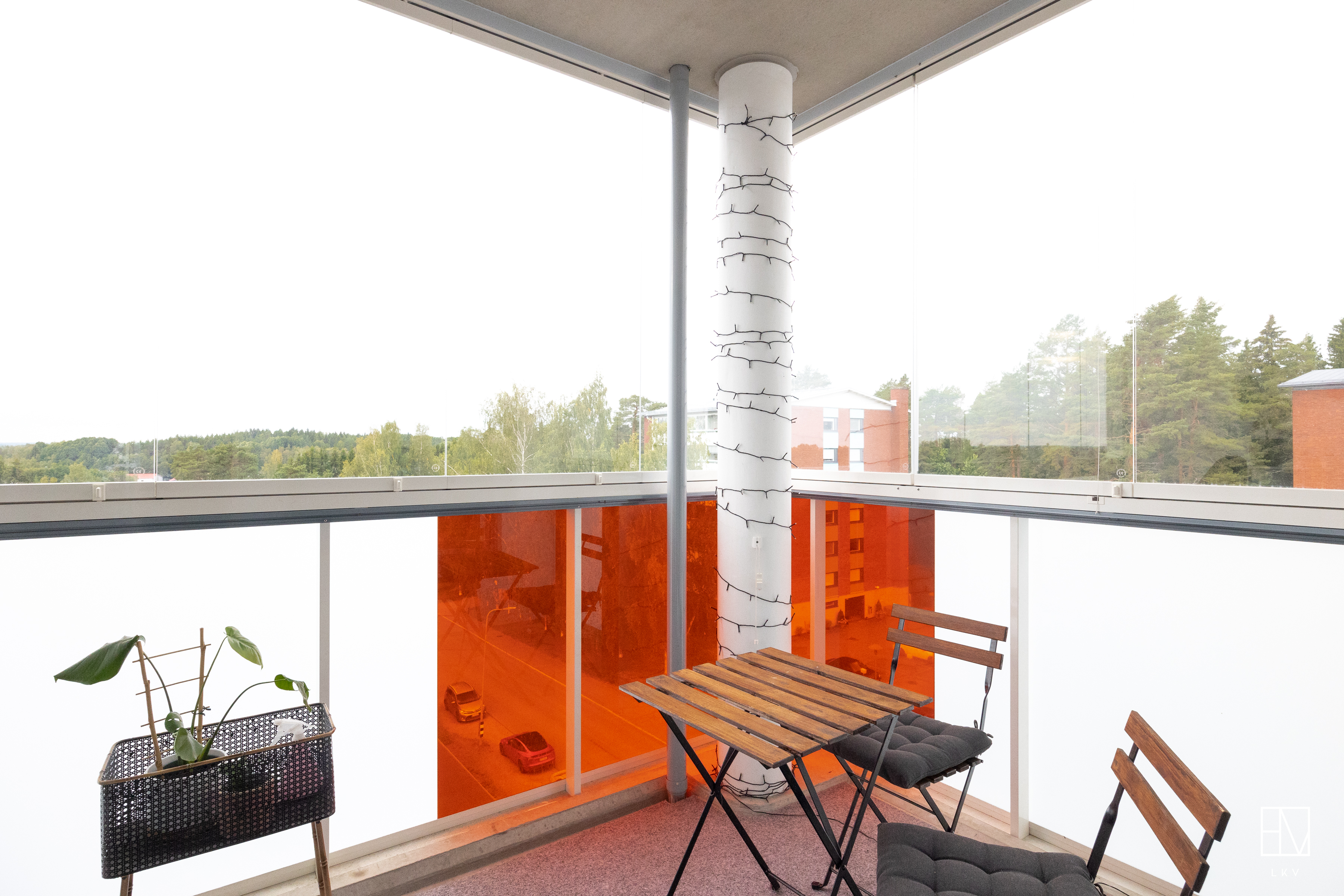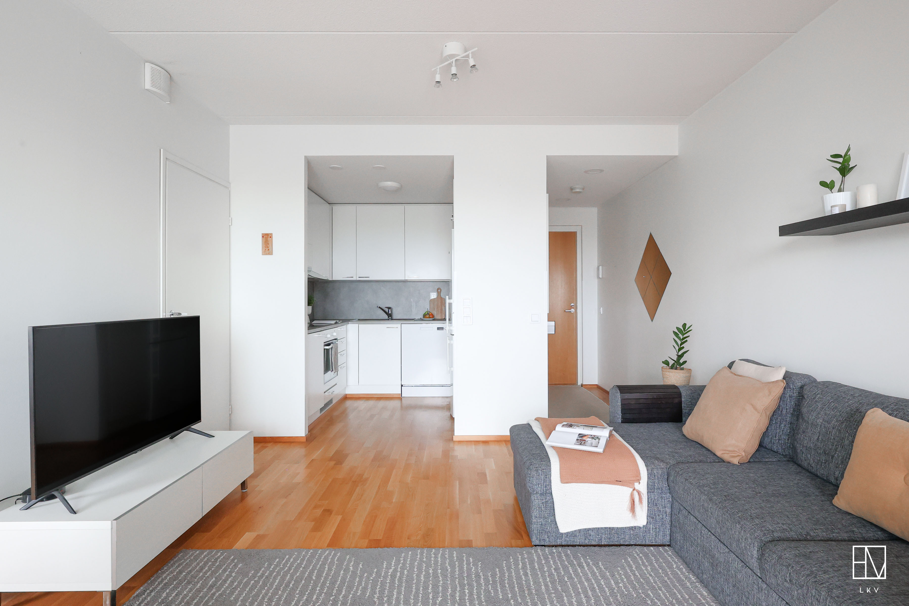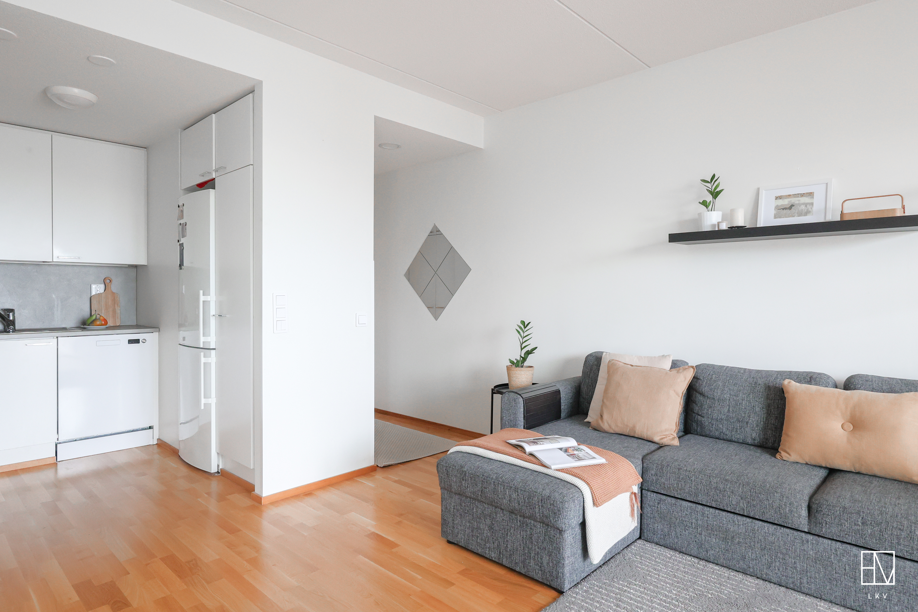 Asunnon sydän on avara ja käytännöllinen olohuone, joka on sulavasti samaa tilaa keittiön kanssa. Suurella lasitetulla parvekkeella on mukava rentoutua ja se toimii kuin lisähuoneena pitkälle syksyyn. Makuuhuone on mukavan kokoinen ja löytyypä asunnosta vielä oma saunakin.